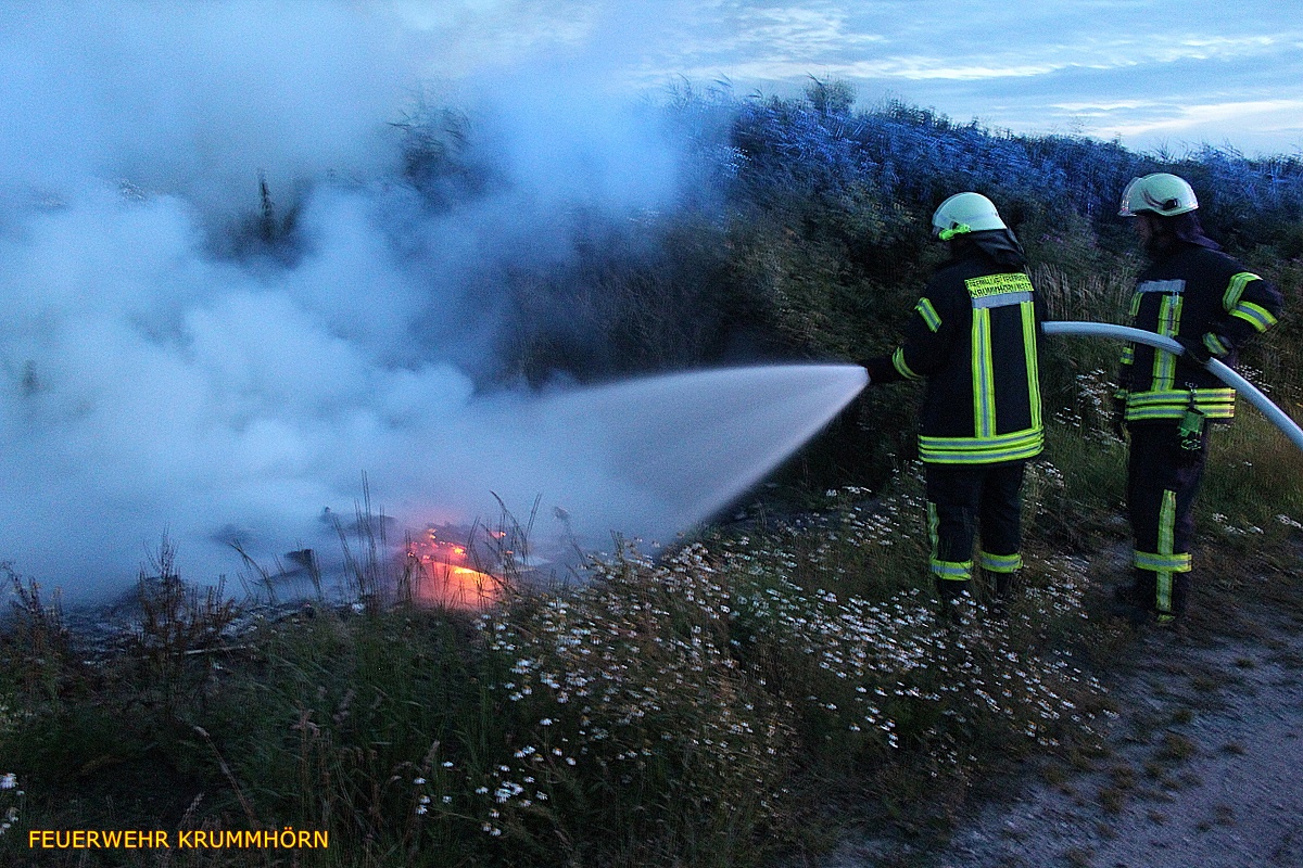 Die Ortsfeuerwehren Krummhörn-West und Pewsum-Woltzeten sind am Montagabend, 13.07.2020, um 22:28 Uhr in den Hamswehrumer Meedenweg in Hamswehrum alarmiert worden. Auf dem Gelände eines ehemaligen Klärwerks brannte ein kleinerer Haufen Unrat.