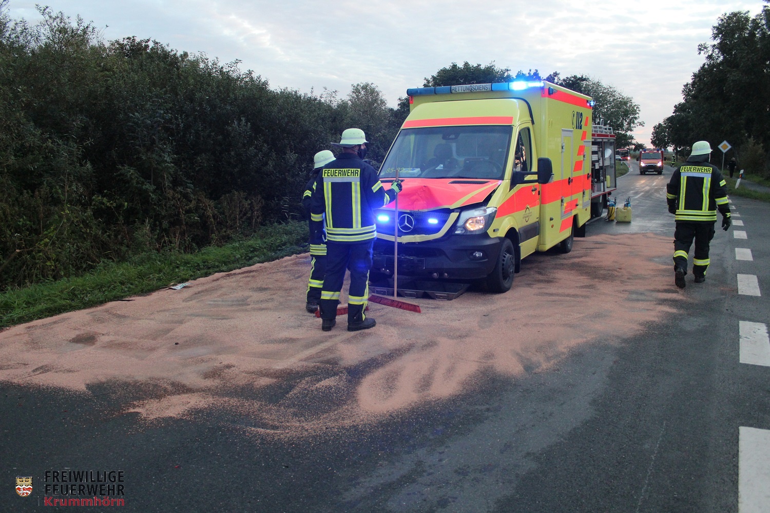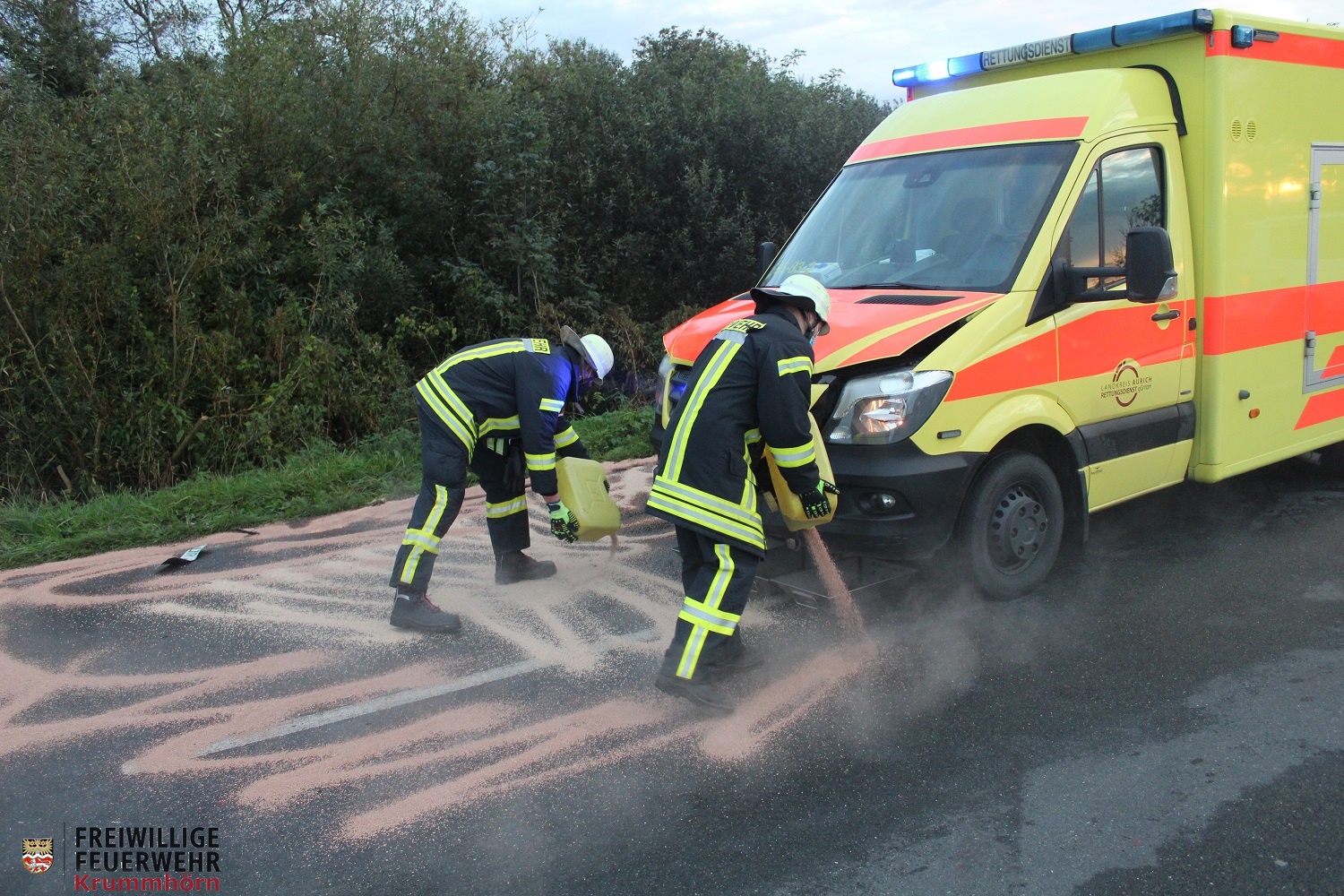 Ein Rettungswagen ist am Freitagabend auf der Neu-Etumer Straße zwischen Pilsum und Greetsiel auf einer Einsatzfahrt mit einem Volkswagen Touran zusammengestoßen. Infolge des Zusammenstoßes liefen Betriebsstoffe aus dem Rettungswagen aus, sodass um 18:17 Uhr die Feuerwehr Krummhörn-Nord alarmiert wurde.