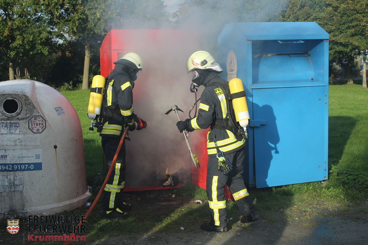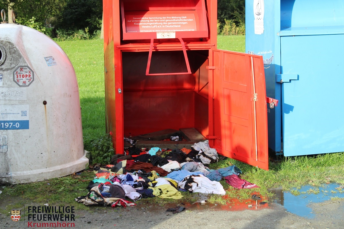 Die Einsatzkräfte der Feuerwehr Krummhörn-Süd öffneten den Altkleidercontainer mit einem Pedalschneider. Im Anschluss löschte ein Trupp unter Atemschutz die brennenden Altkleider. Neben der Feuerwehr war auch die Polizei vor Ort im Einsatz.