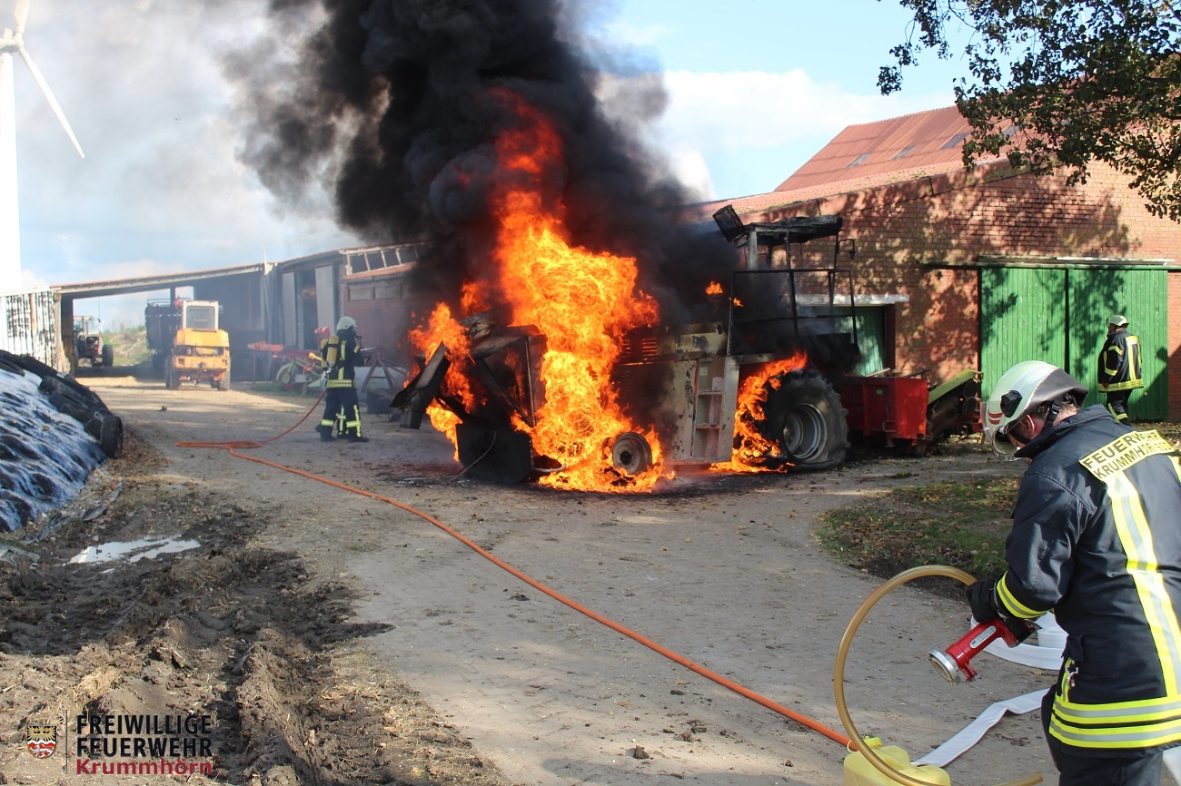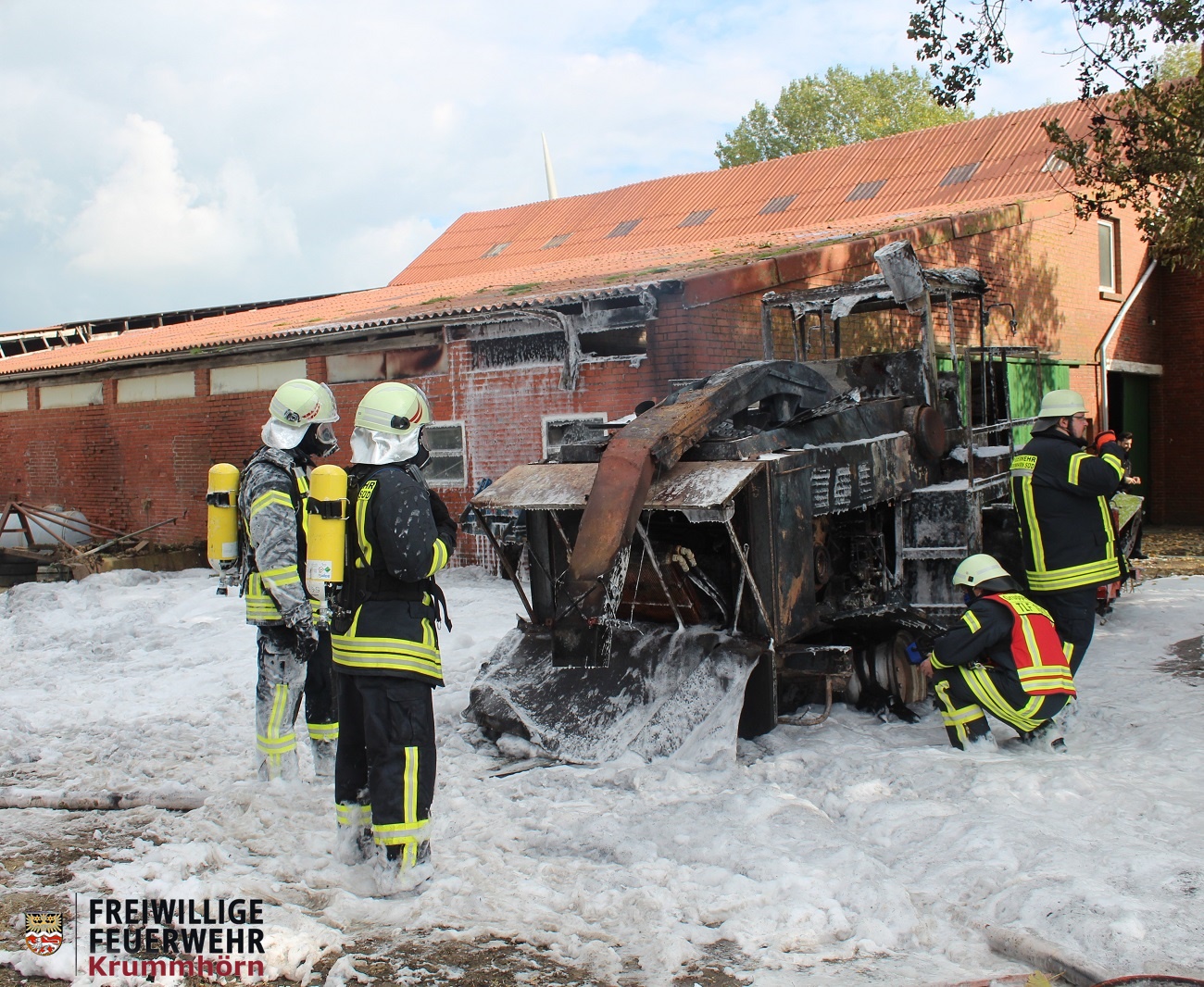Ein Feldhäcksler ist im Buntelweg in der Gemeinde Krummhörn am Samstagmittag vollständig ausgebrannt. Um 12:40 Uhr sind die Feuerwehren Krummhörn-Süd, Krummhörn-West und Pewsum-Woltzeten zum Brand der landwirtschaftlichen Maschine alarmiert worden.
