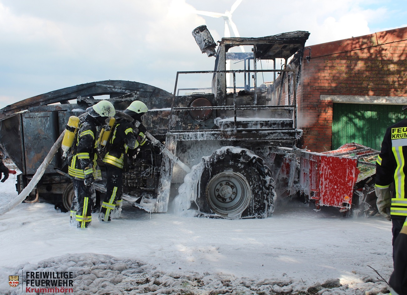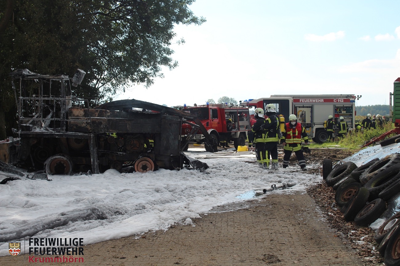 Mit Hilfe eines Schaumangriffs gelang es den Einsatzkräften das Feuer zu löschen. In dem anliegenden Gebäude waren zum Zeitpunkt des Brandes noch unter Druck stehende Behälter gelagert. Diese sind von der Feuerwehr umgehend aus dem Gebäude entfernt worden. In einem naheliegenden Stall befanden sich zudem noch Tiere.