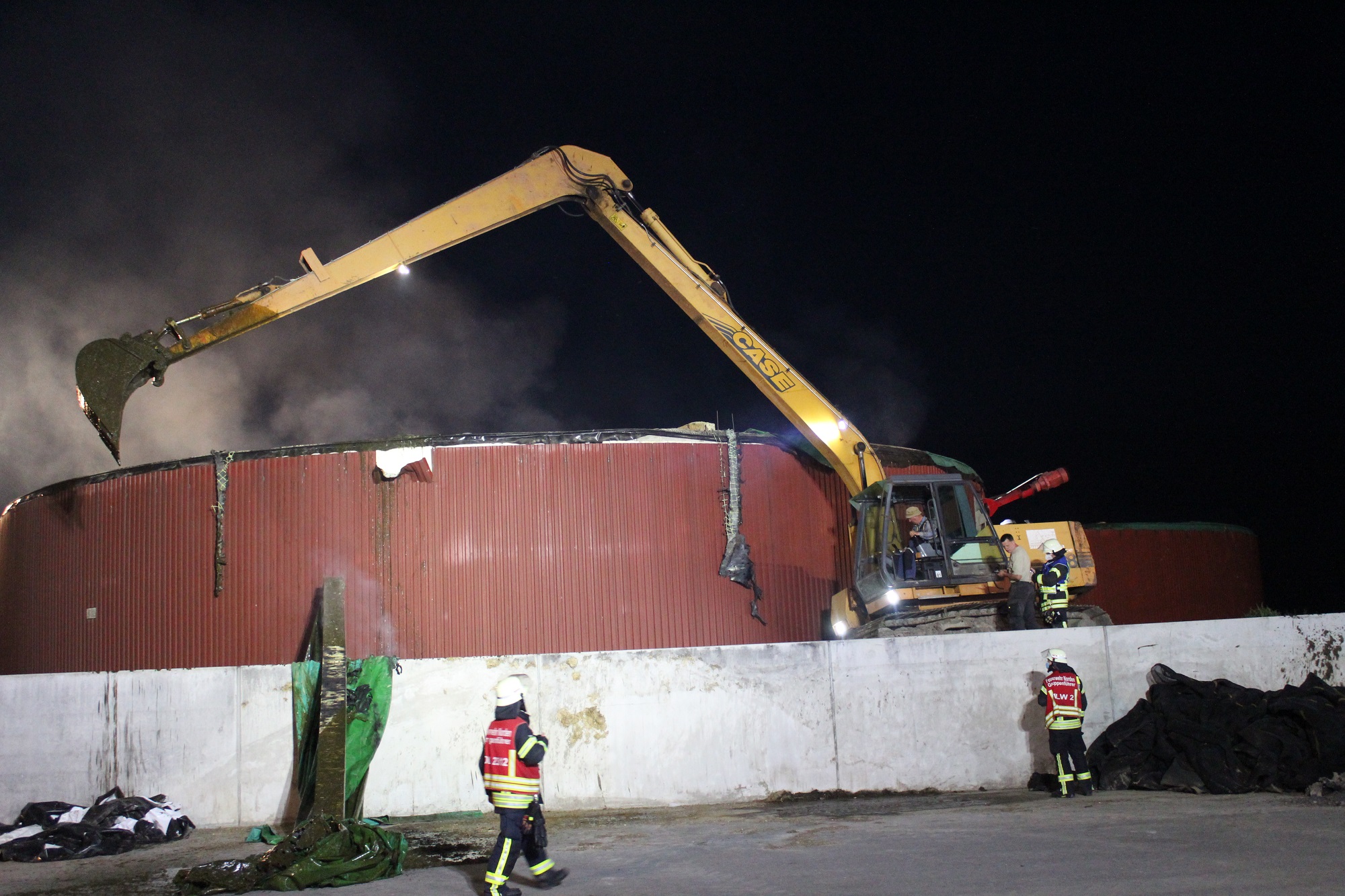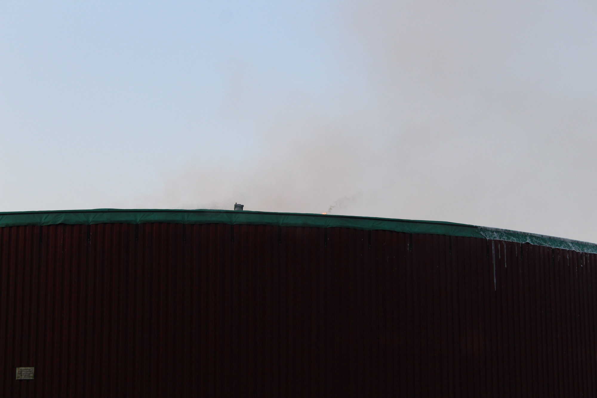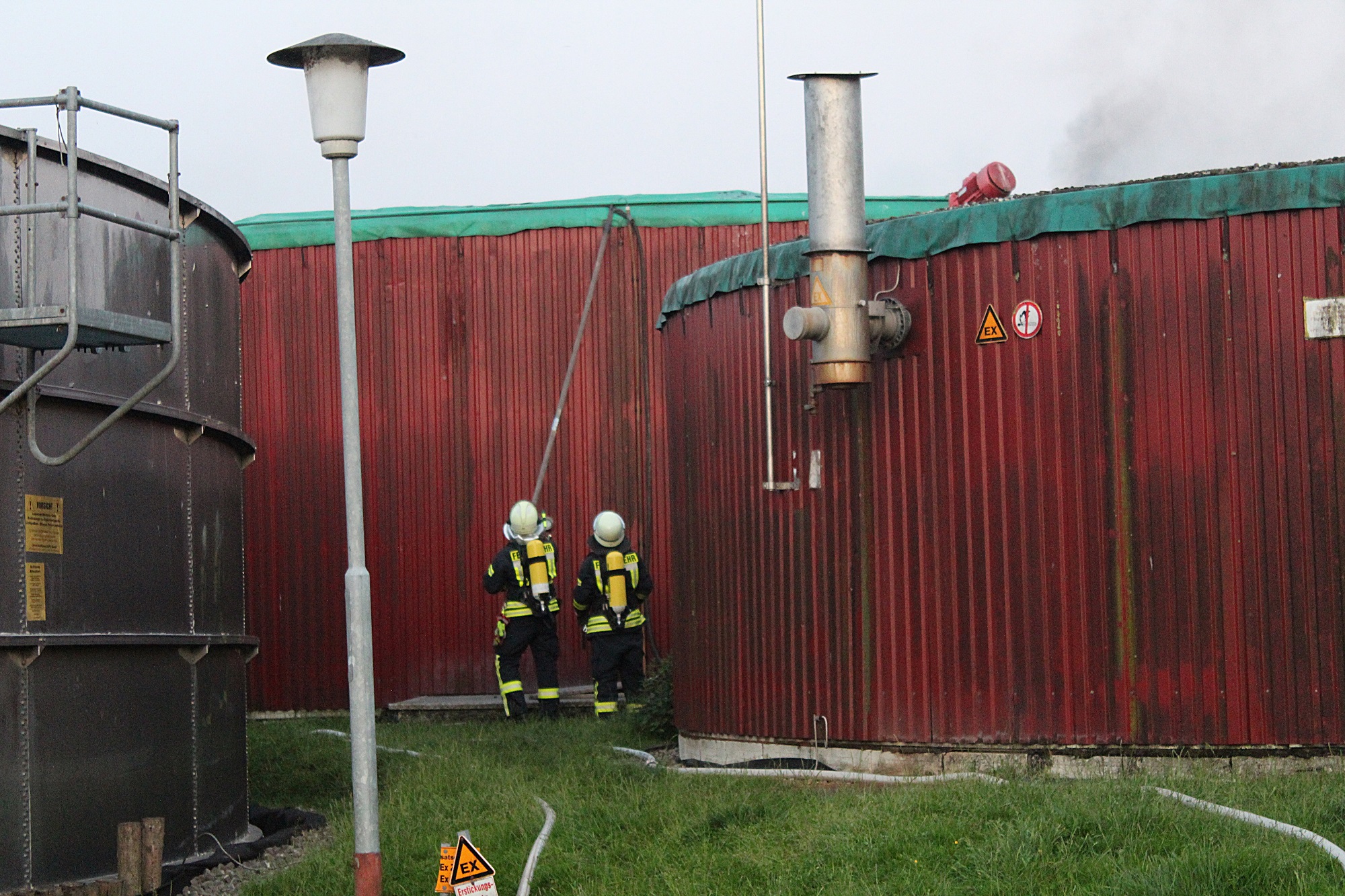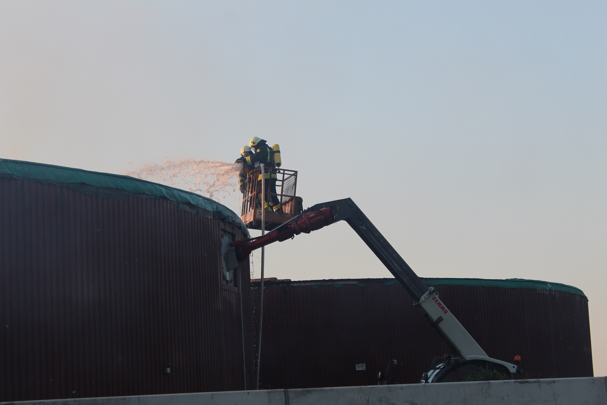 In einem Behälter war aus bislang ungeklärter Ursache ein Brand ausgebrochen. Das Feuer hatte vor dem Eintreffen der ersten Einsatzkräfte bereits auf einen Teil eines weiteren Behälters der Biogasanlage übergegriffen.