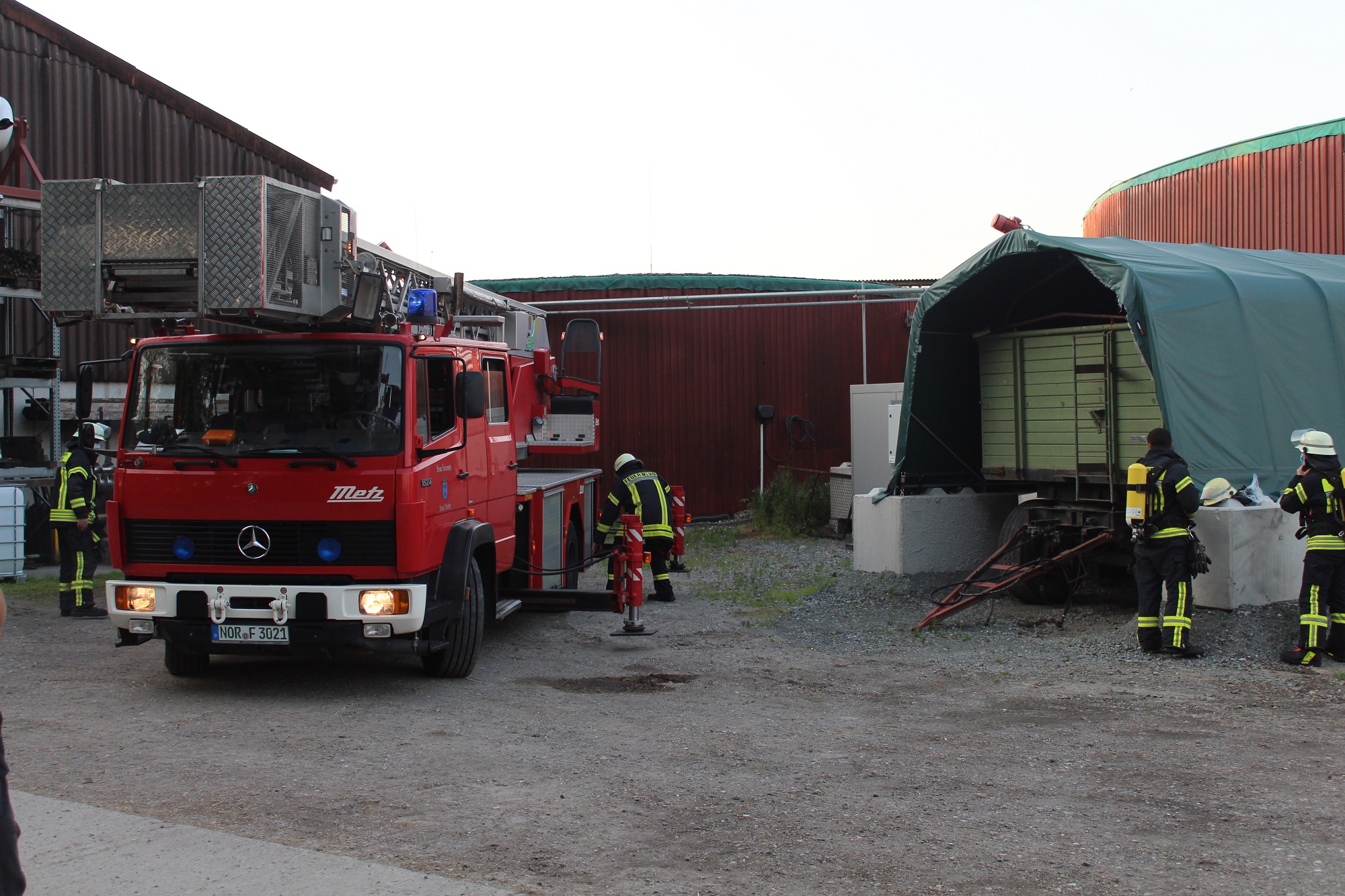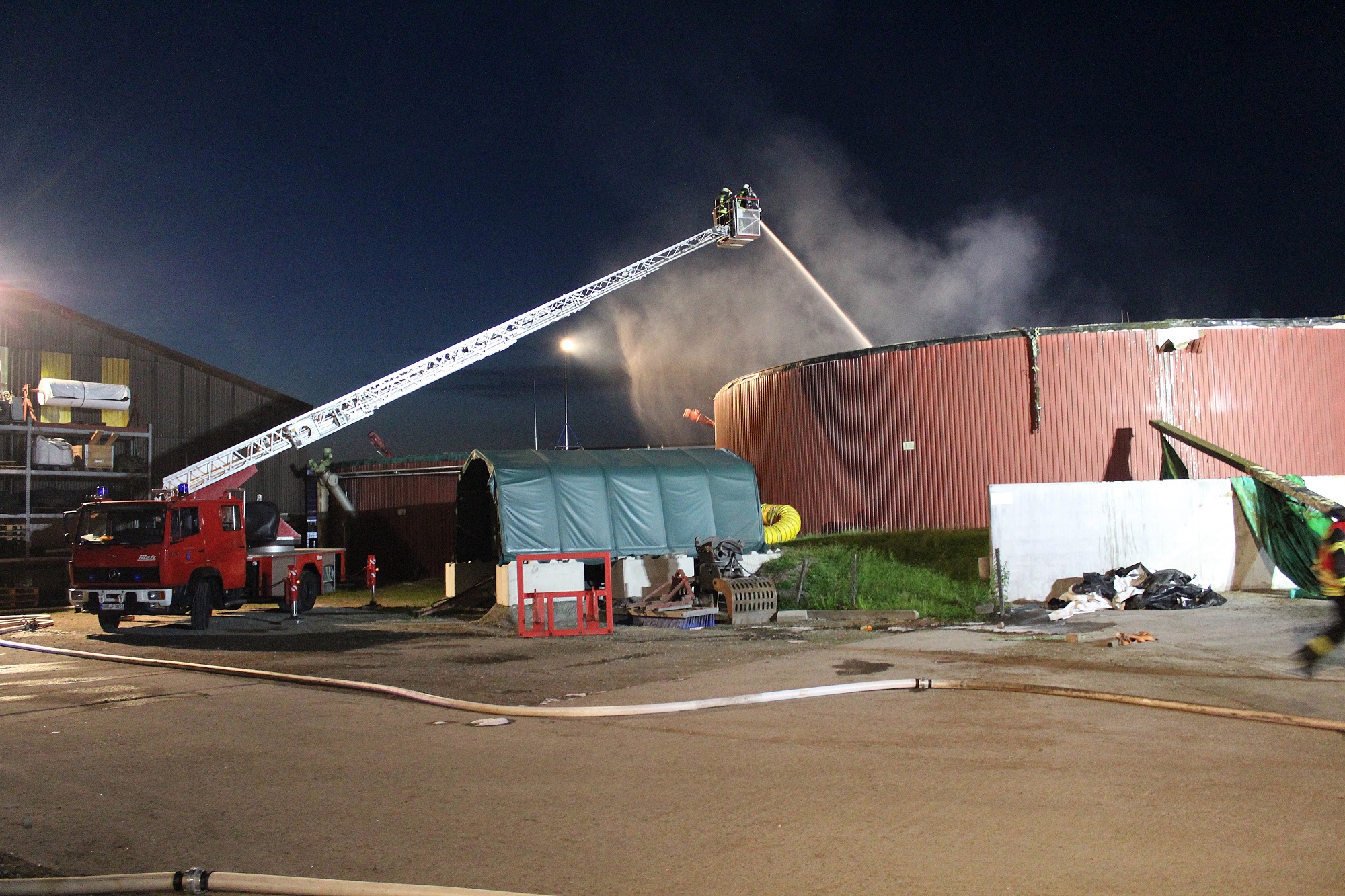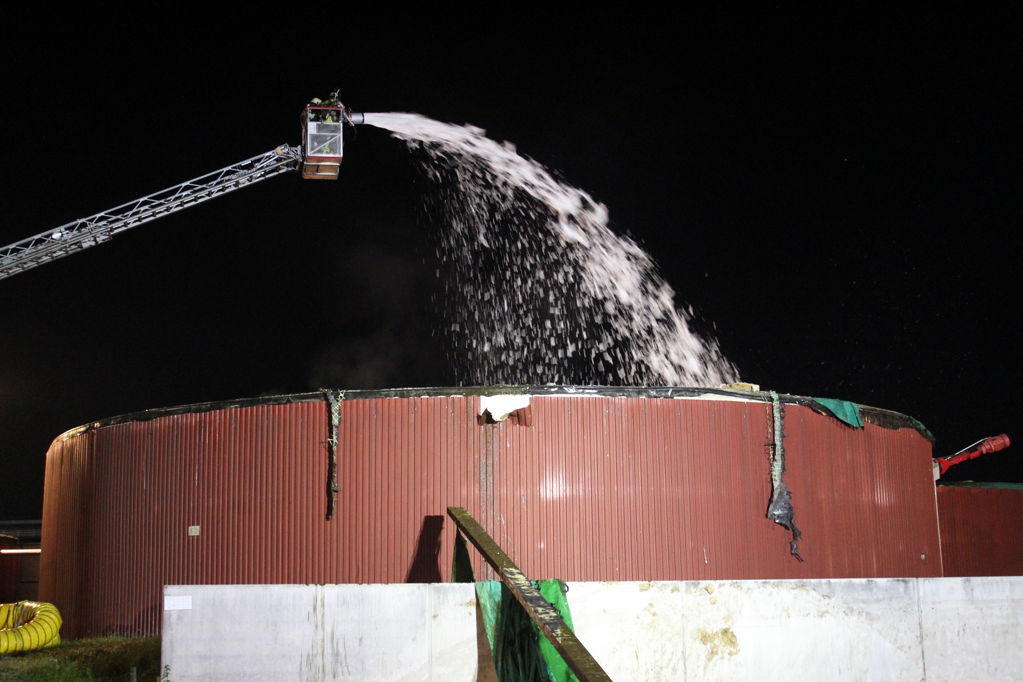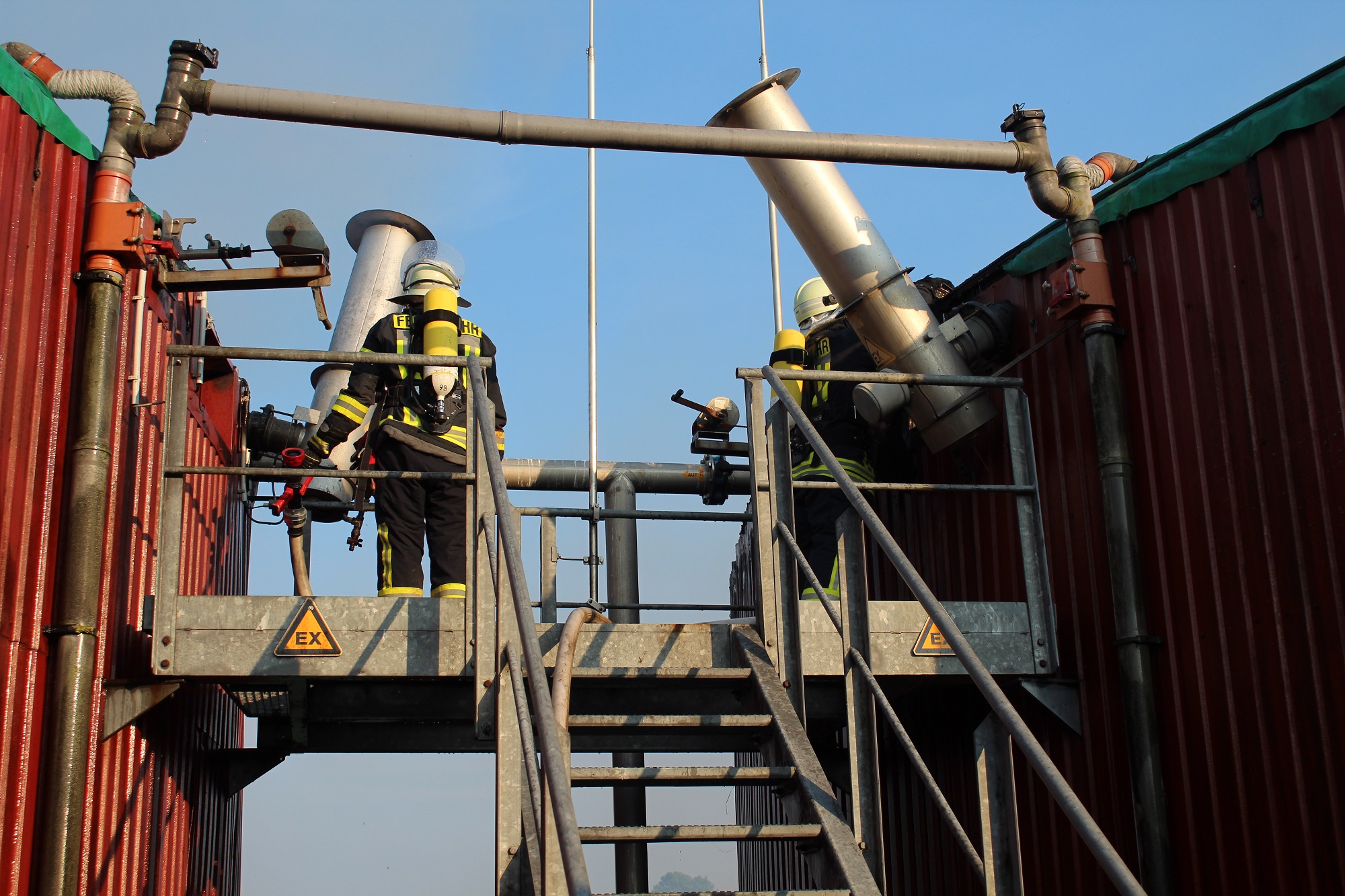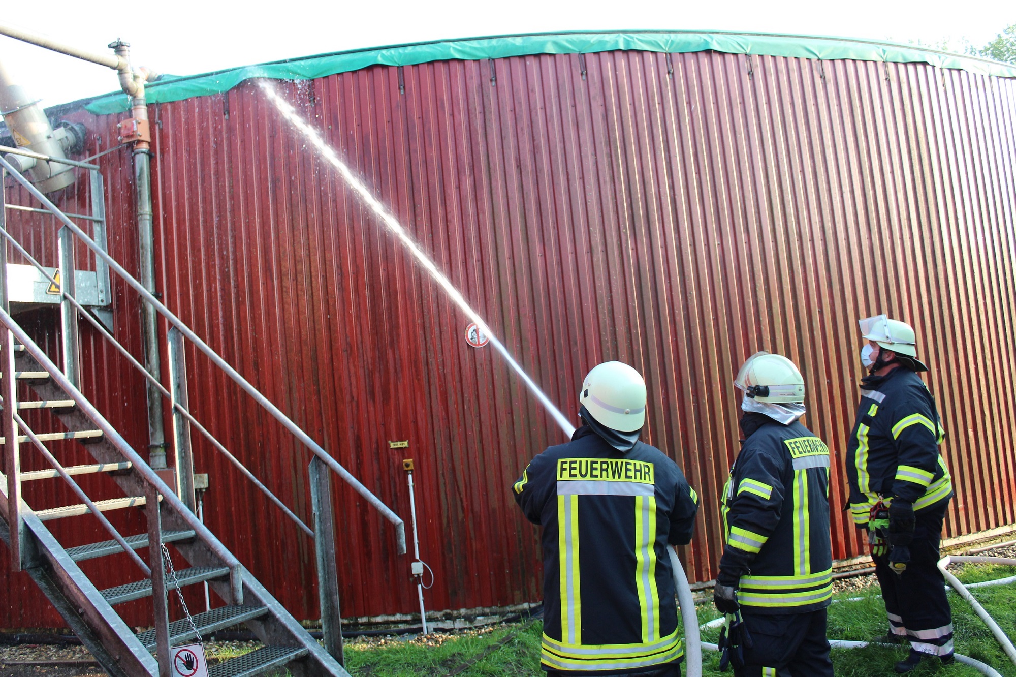In einem Behälter war aus bislang ungeklärter Ursache ein Brand ausgebrochen. Das Feuer hatte vor dem Eintreffen der ersten Einsatzkräfte bereits auf einen Teil eines weiteren Behälters der Biogasanlage übergegriffen.