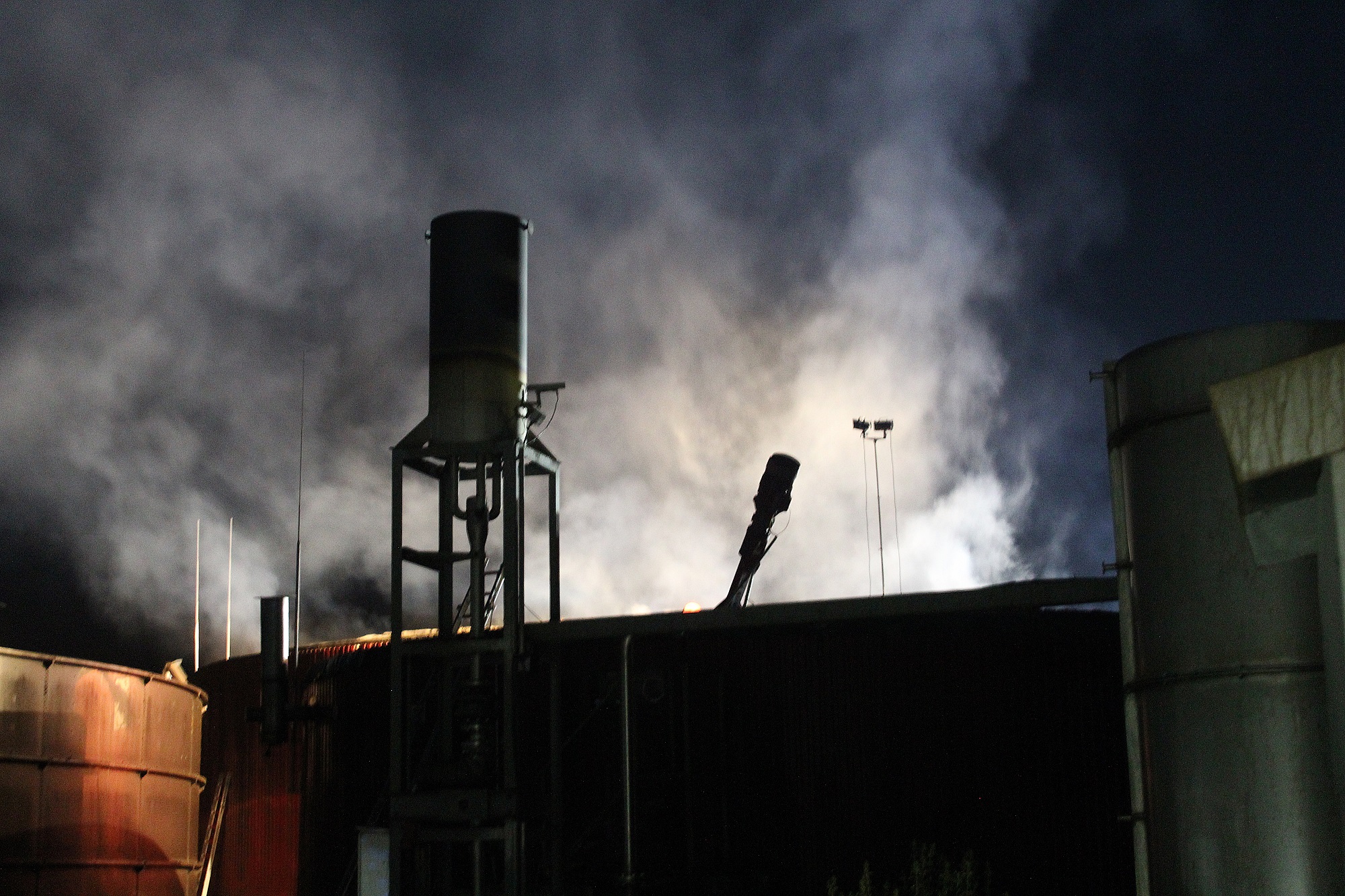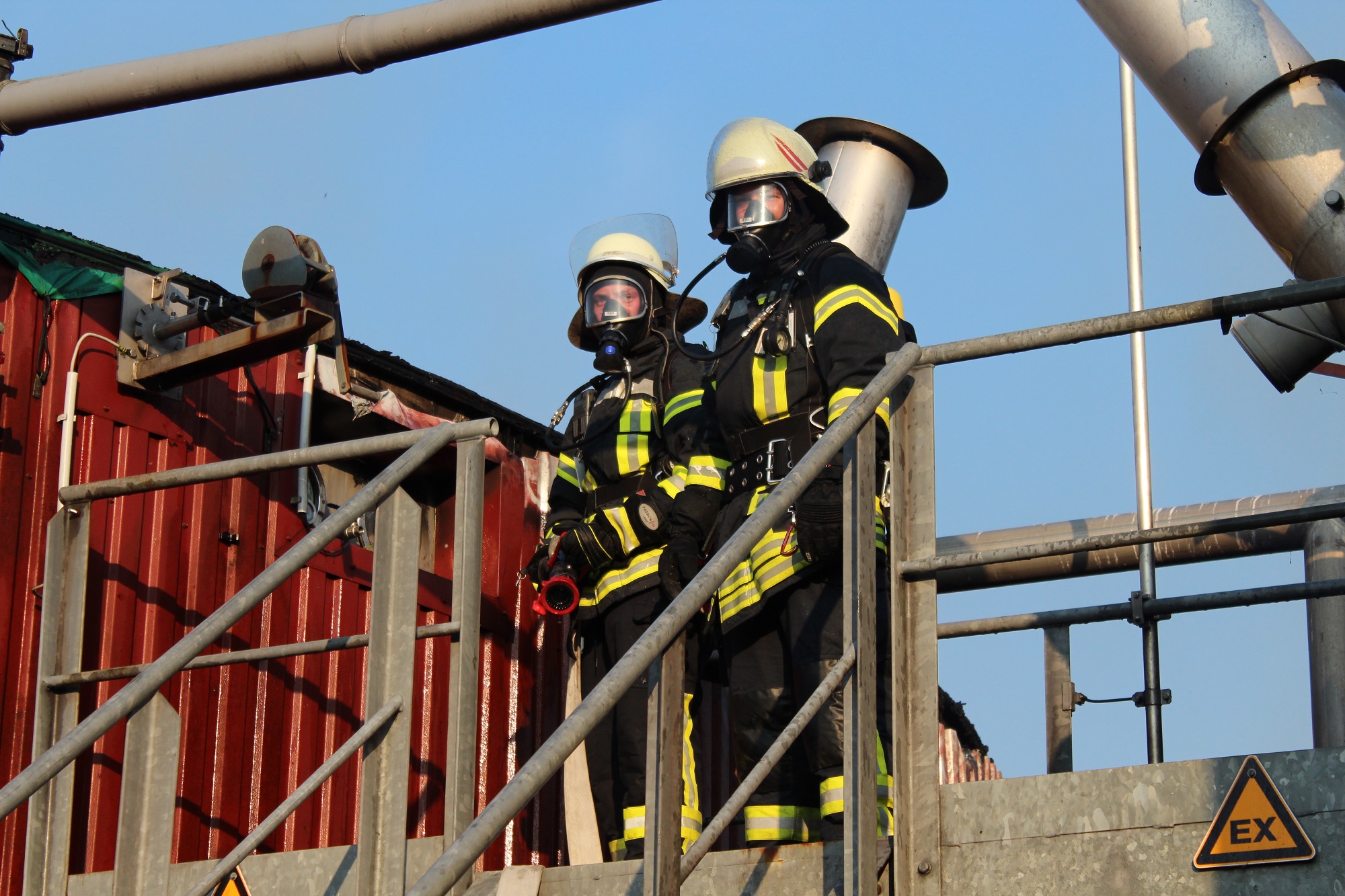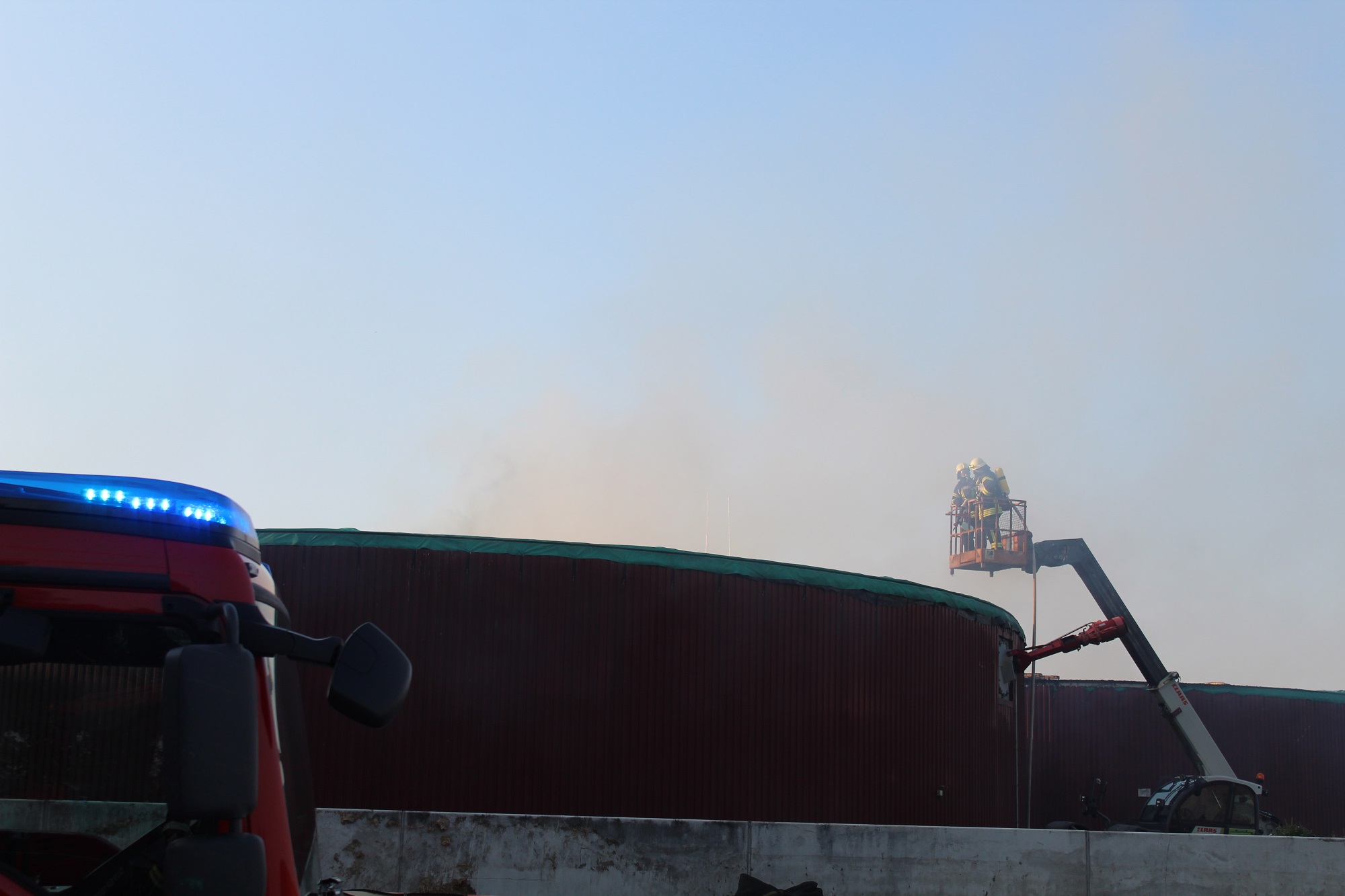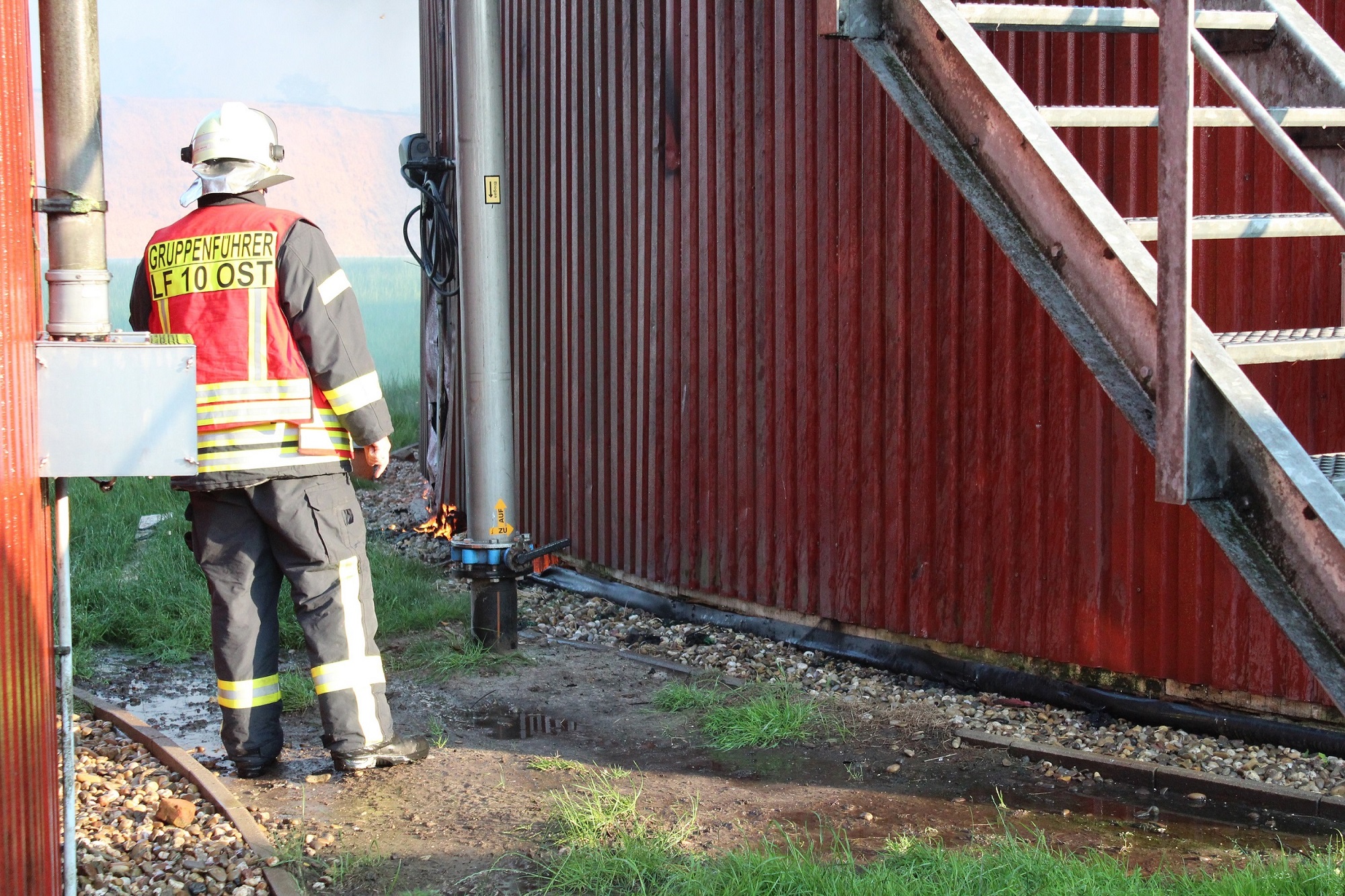 In einem Behälter war aus bislang ungeklärter Ursache ein Brand ausgebrochen. Das Feuer hatte vor dem Eintreffen der ersten Einsatzkräfte bereits auf einen Teil eines weiteren Behälters der Biogasanlage übergegriffen.