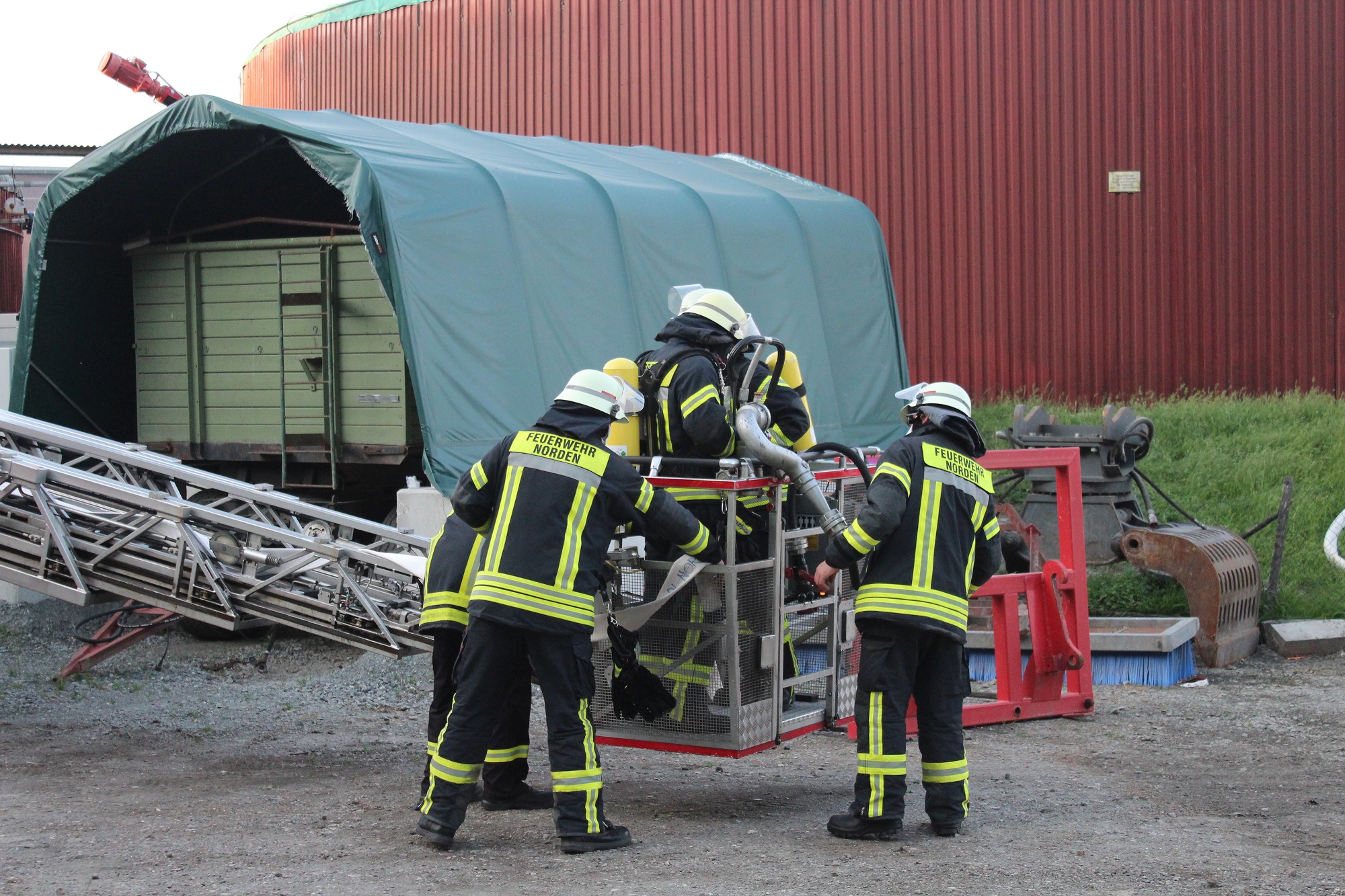 Auf Grund der giftigen Rauchgase konnten die Einsatzkräfte später ausschließlich unter Atemschutz arbeiten. Ein mit einem Arbeitskorb ausgestatteter Teleskoplader ermöglichte es den Rettern, sich noch vor dem Eintreffen der Norder Drehleiter ein Bild von oben zu machen.