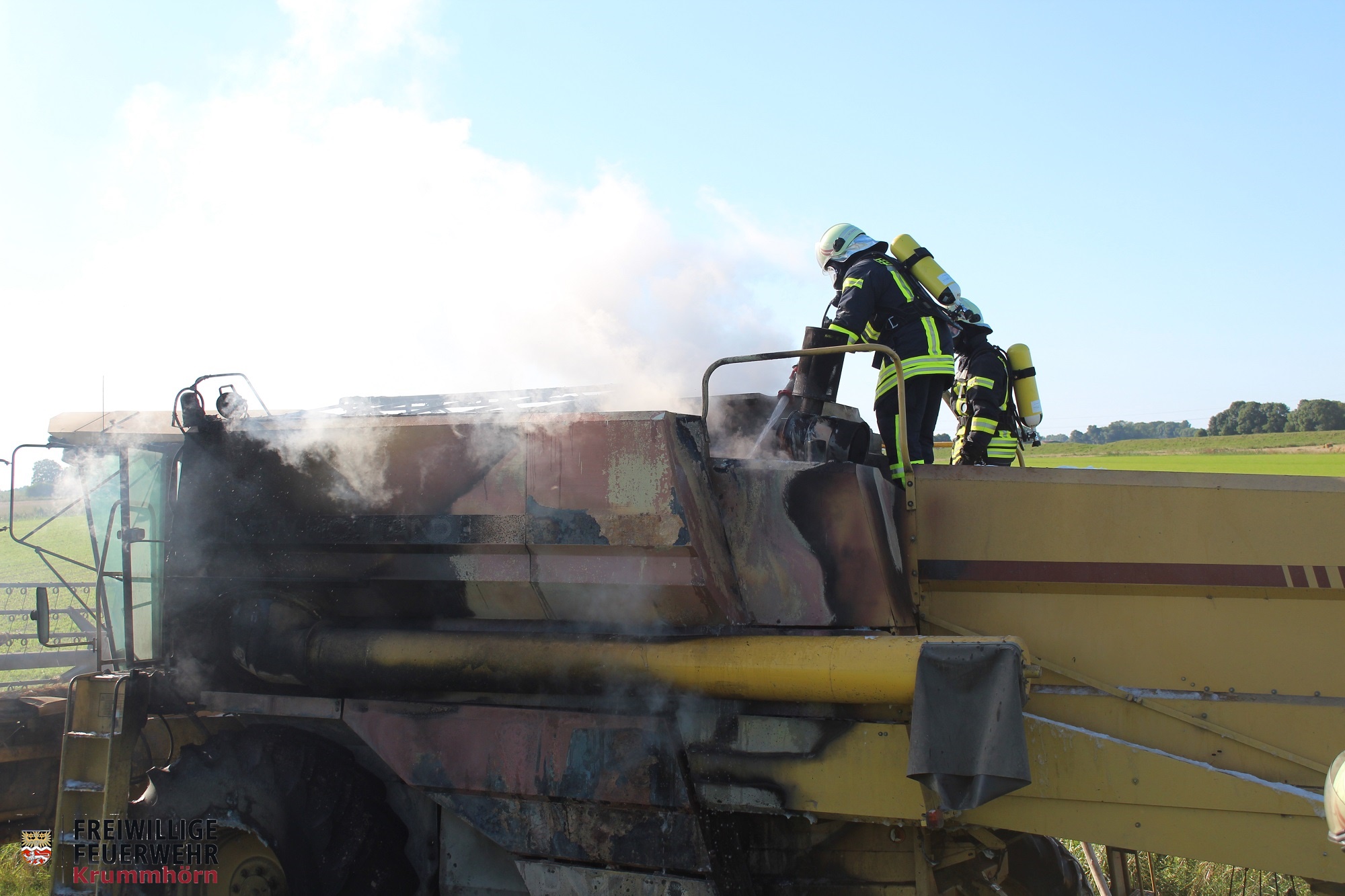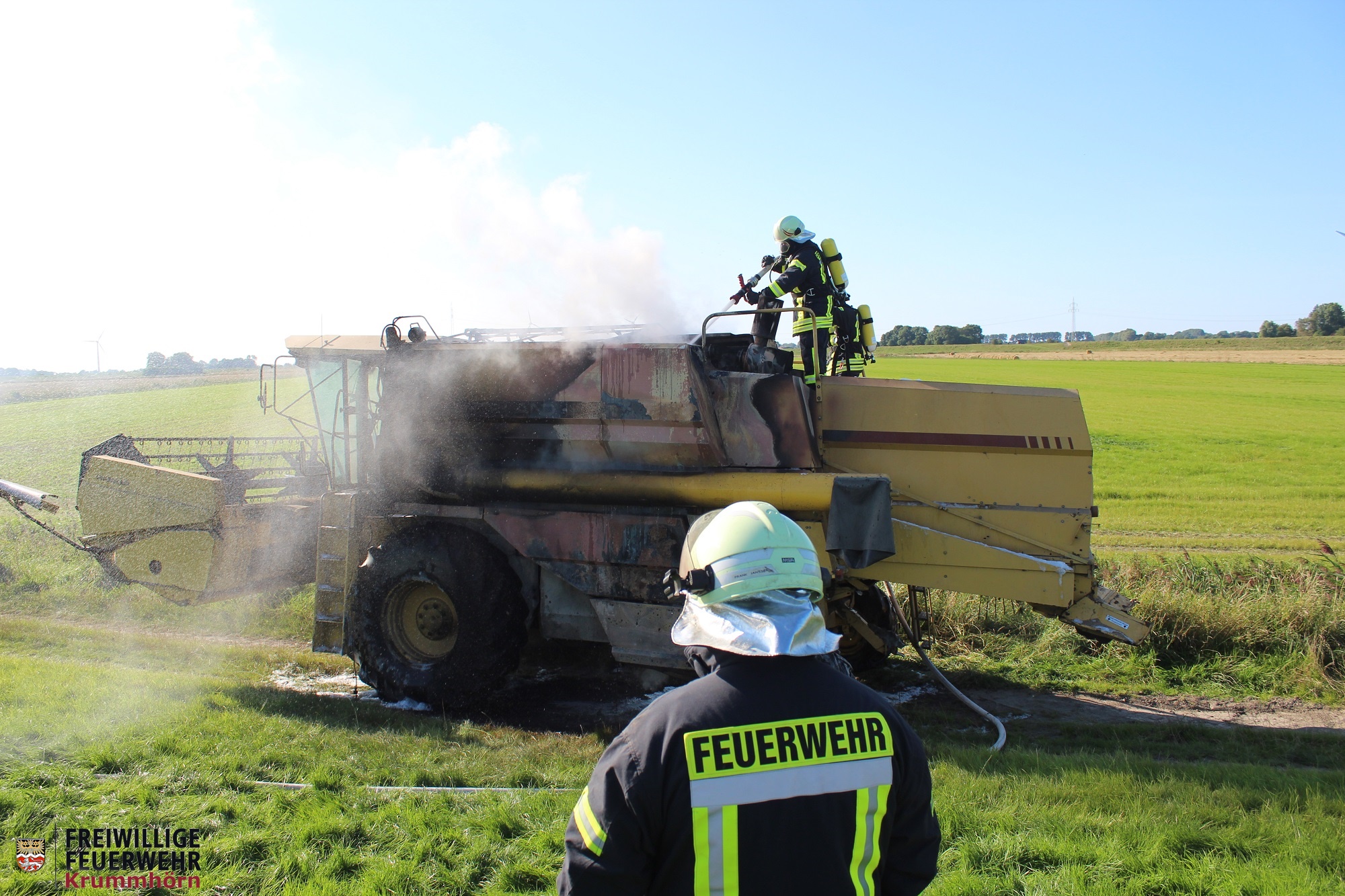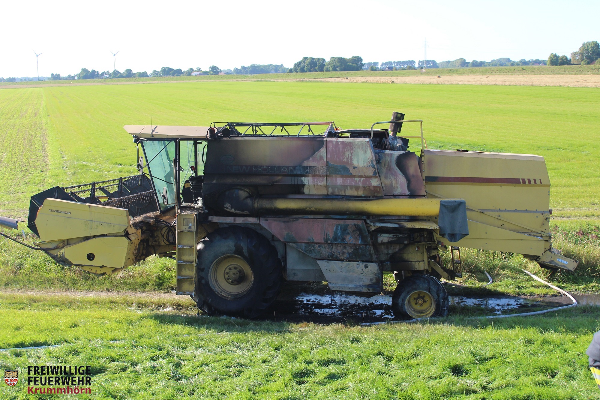 Am Grimersumer Altendeich hat am Sonntagnachmittag ein Mähdrescher gebrannt. Der Fahrer der landwirtschaftlichen Maschine bemerkte auf der Rückfahrt vom Feld, dass Rauch aus dem Fahrzeug drang. Er stoppte die Erntemaschine umgehend auf dem Feldweg und brachte sich unverletzt in Sicherheit. Kurze Zeit später stand der Mähdrescher dann bereits in Flammen.