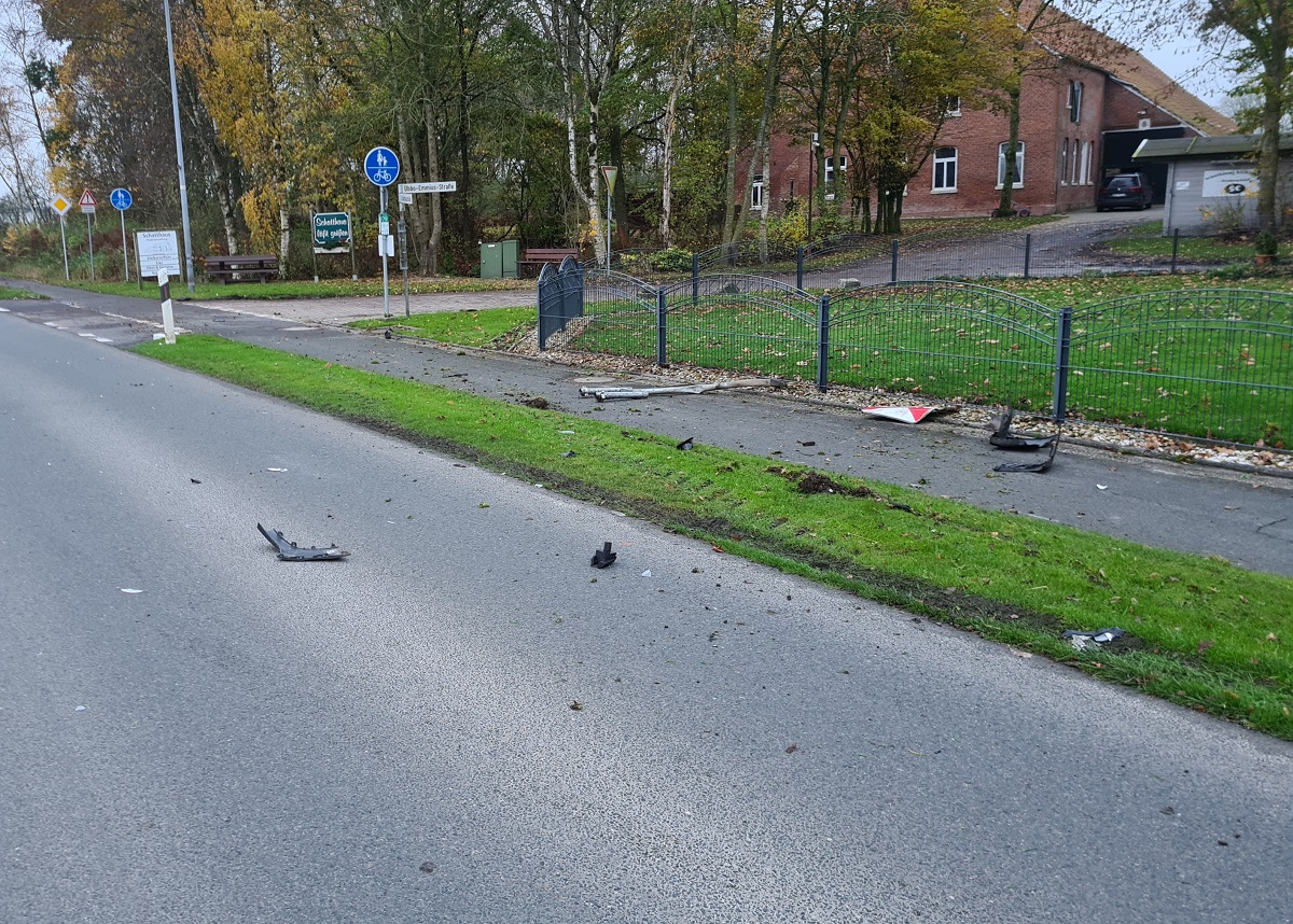 Einsatzkräfte der Feuerwehr Pewsum-Woltzeten unterstützten die Polizei an der Einsatzstelle bei den Aufräumarbeiten. Die Schatthausstraße musste für die Dauer des Einsatzes voll gesperrt worden.