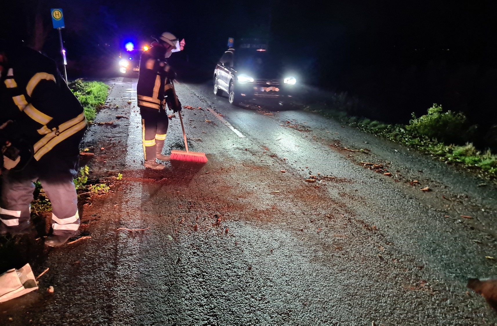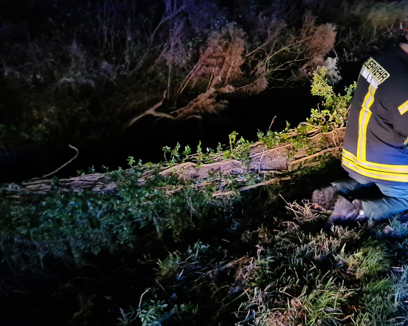 Die Polizei hatte die Feuerwehr zur Unterstützung angefordert, da ein Baum nach einem Verkehrsunfall eine Gefahr für Verkehrsteilnehmer darstellte. Die Feuerwehr konnte den Baum mit einer Motorkettensäge schnell beseitigen.