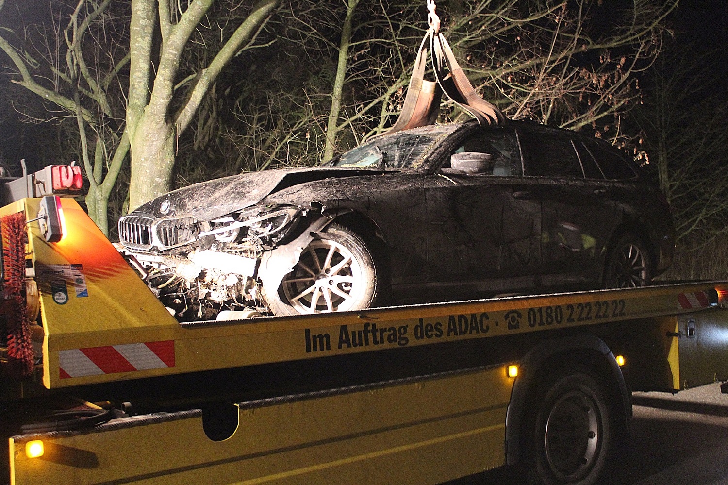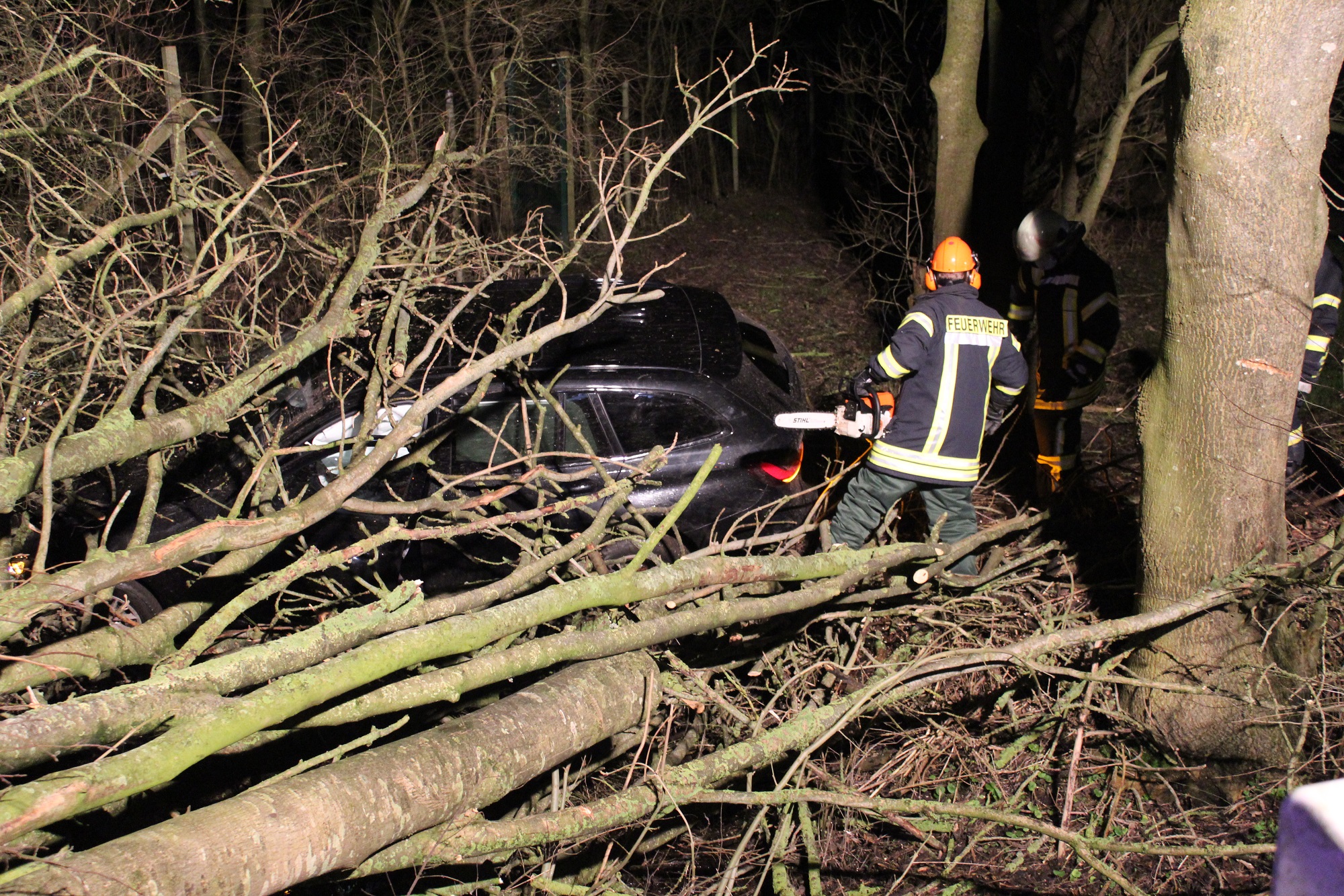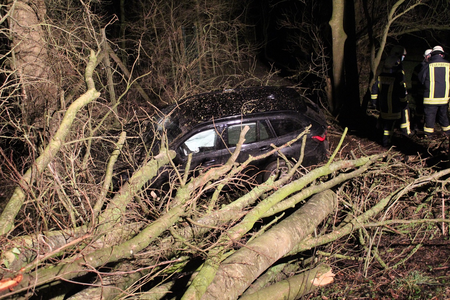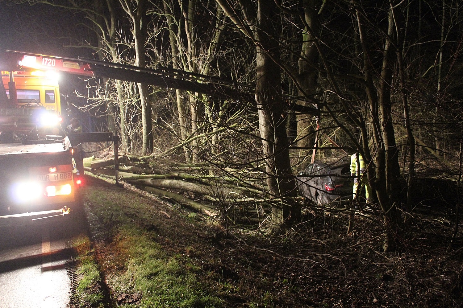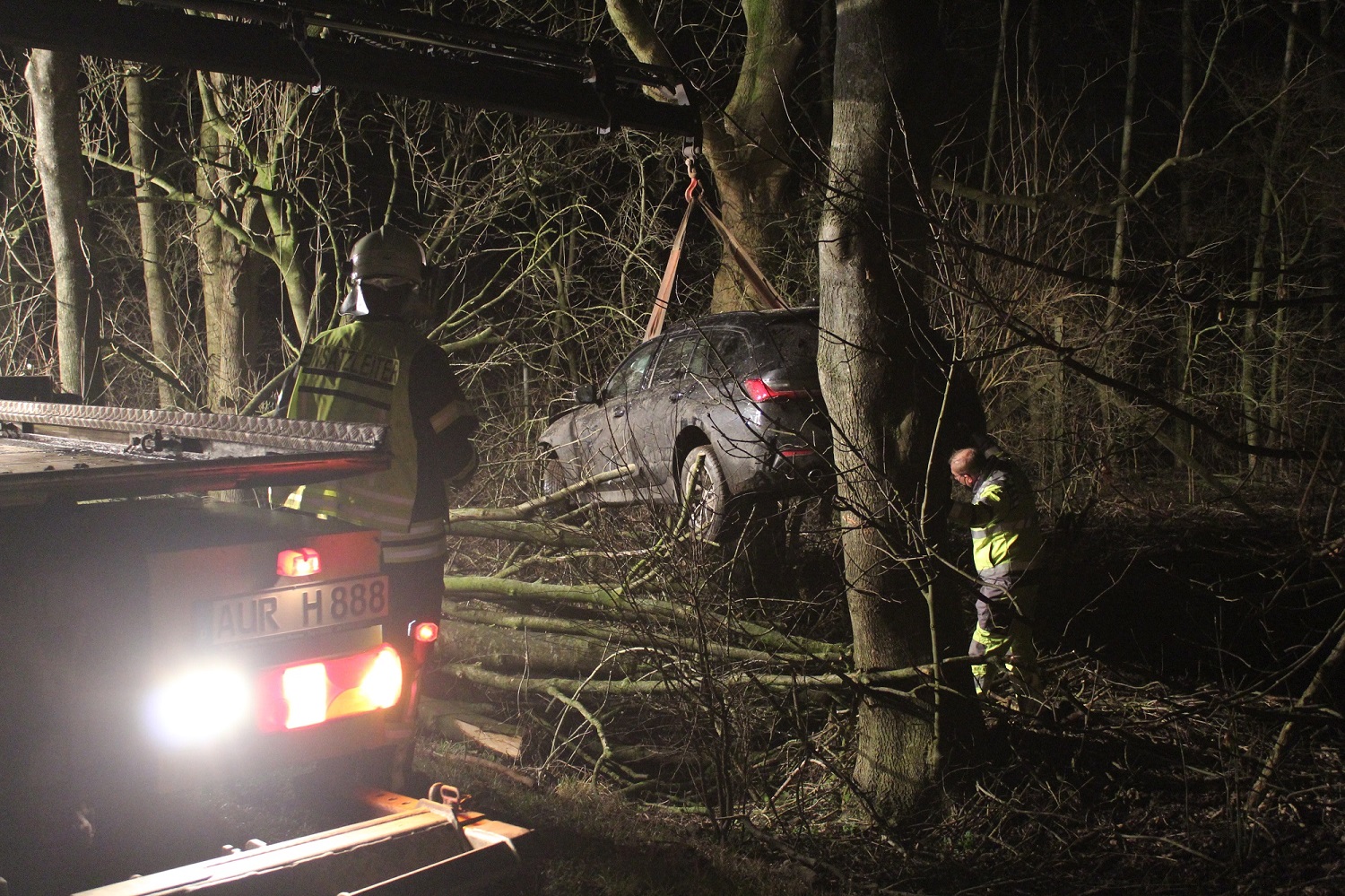 Die Einsatzkräfte der Feuerwehr leuchteten vor Ort zunächst die Einsatzstelle aus und sägten anschließend einige Äste und Baumstämme des Holzstapels ab, um ein Abschleppen zu ermöglichen. Im Anschluss daran ist die Batterie des verunfallten Fahrzeugs von der Feuerwehr abgeklemmt worden.