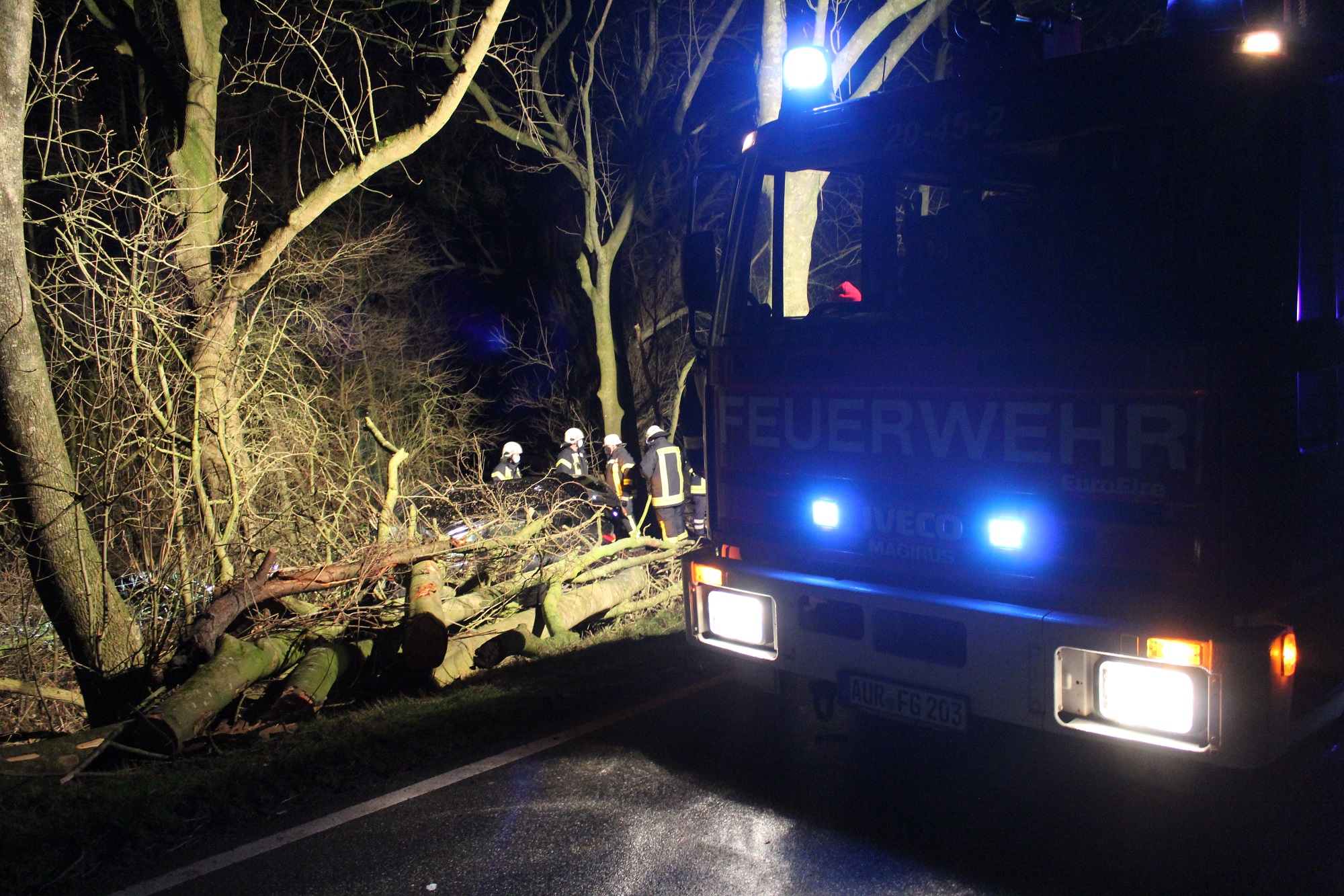 Um den Baumstapel abzutragen und so ein einfacheres Arbeiten des Rettungsdienstes zu ermöglichen, alarmierte die Kooperative Regionalleitstelle Ostfriesland parallel zum Rettungsdienst auch die Feuerwehr Krummhörn-Ost mit.