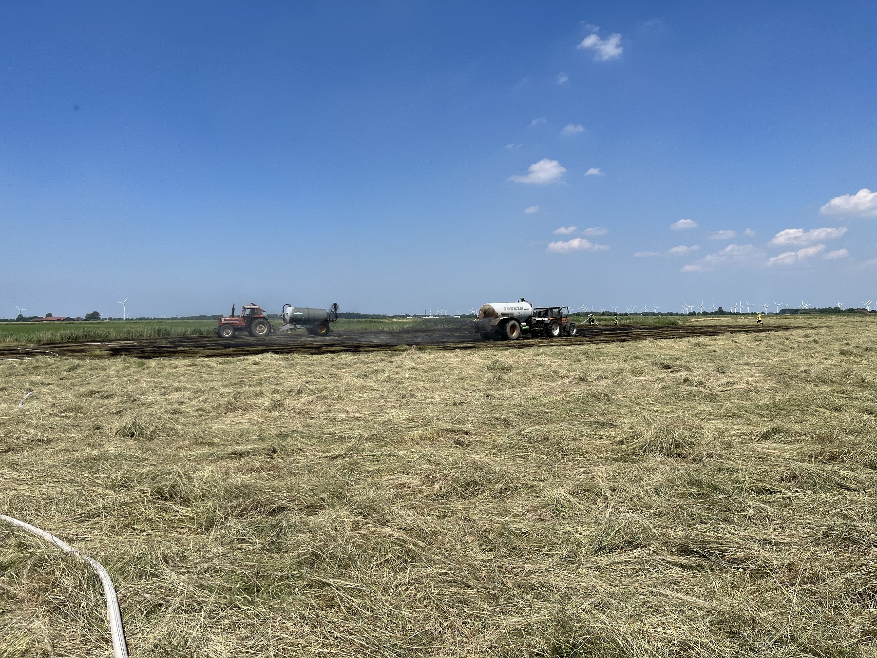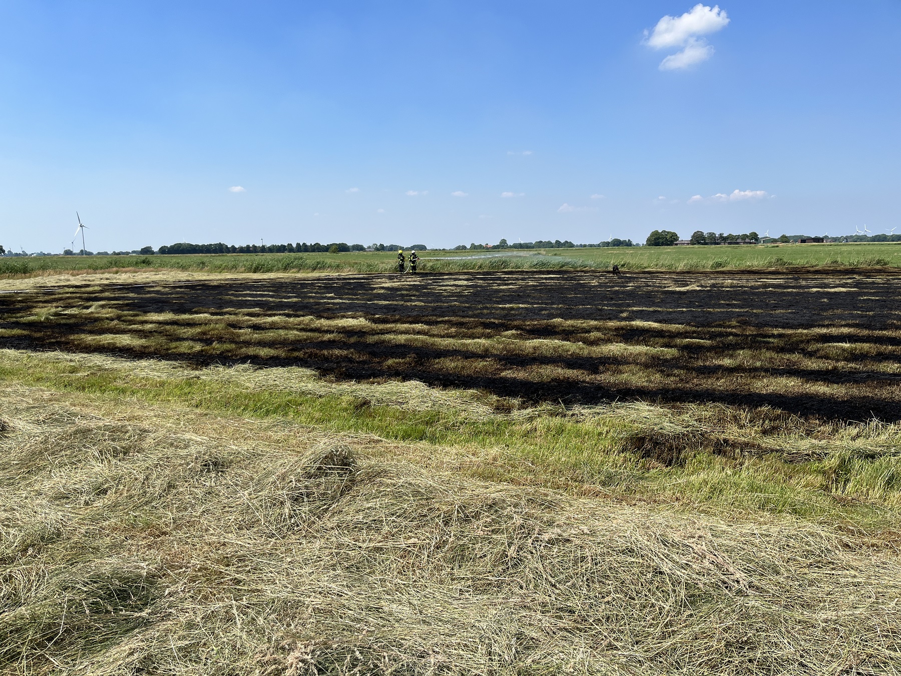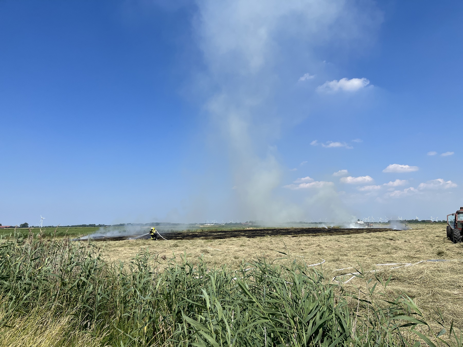 Auf einem Feld in Freepsum (Gemeinde Krummhörn) geriet am Sonntagmittag Heu auf einer Fläche von ca. 4.500 Quadratmetern in Brand.