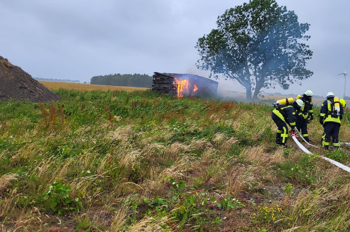 Dort stand ein Teil eines alleinstehenden Holzgebäudes in Brand. Trupps unter Atemschutz konnten das Feuer zügig löschen.