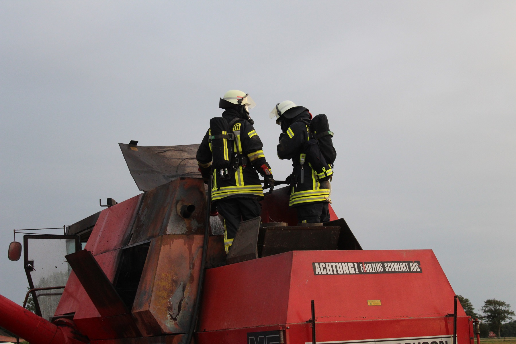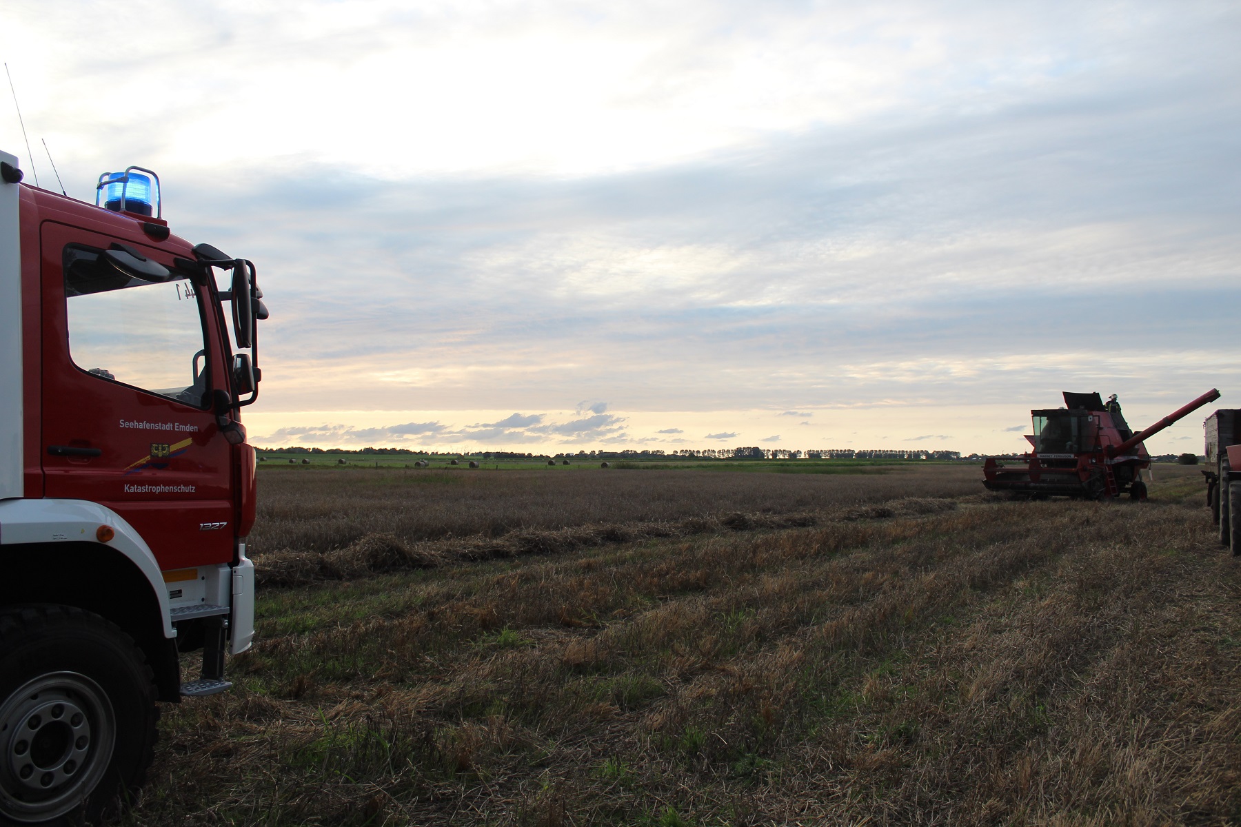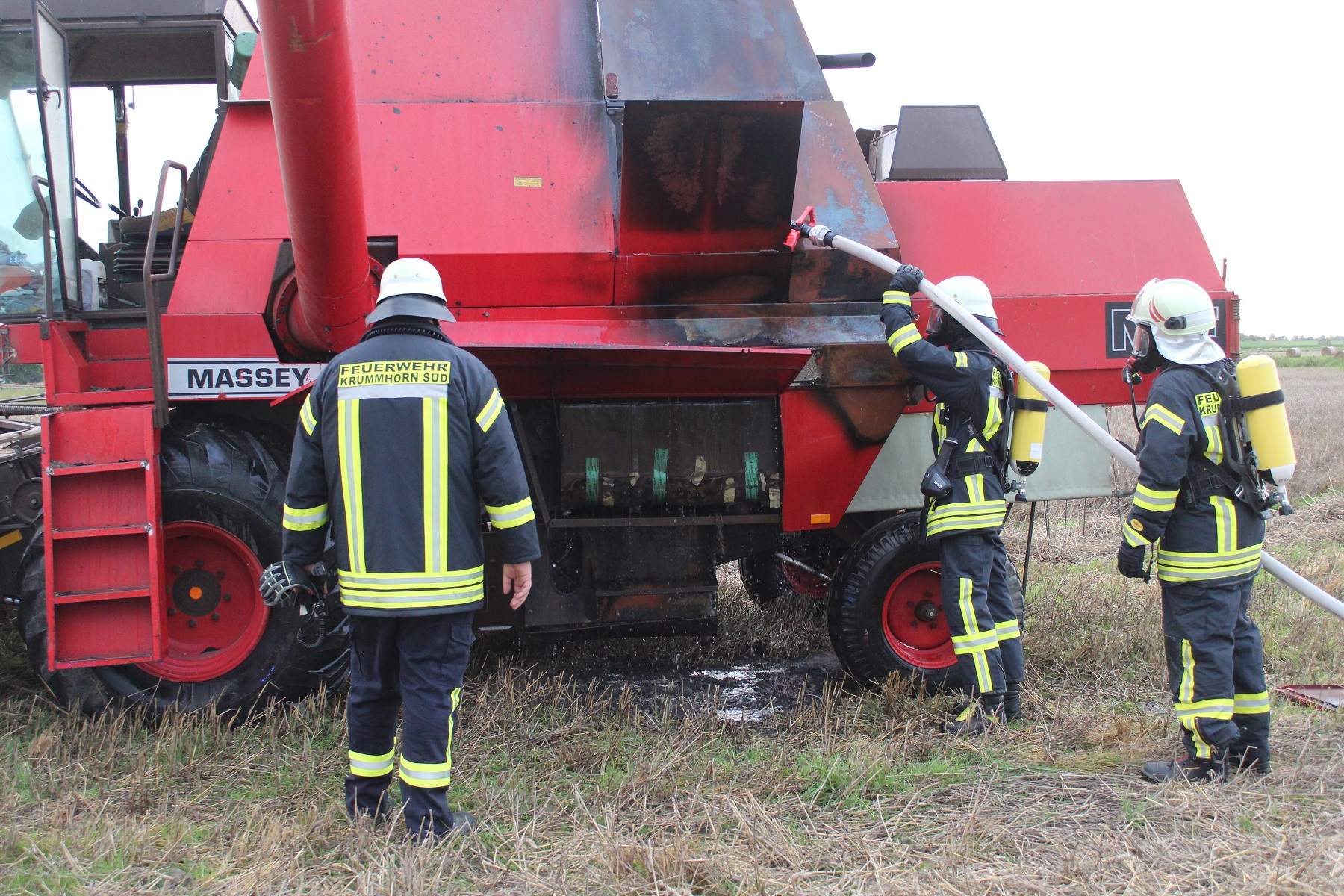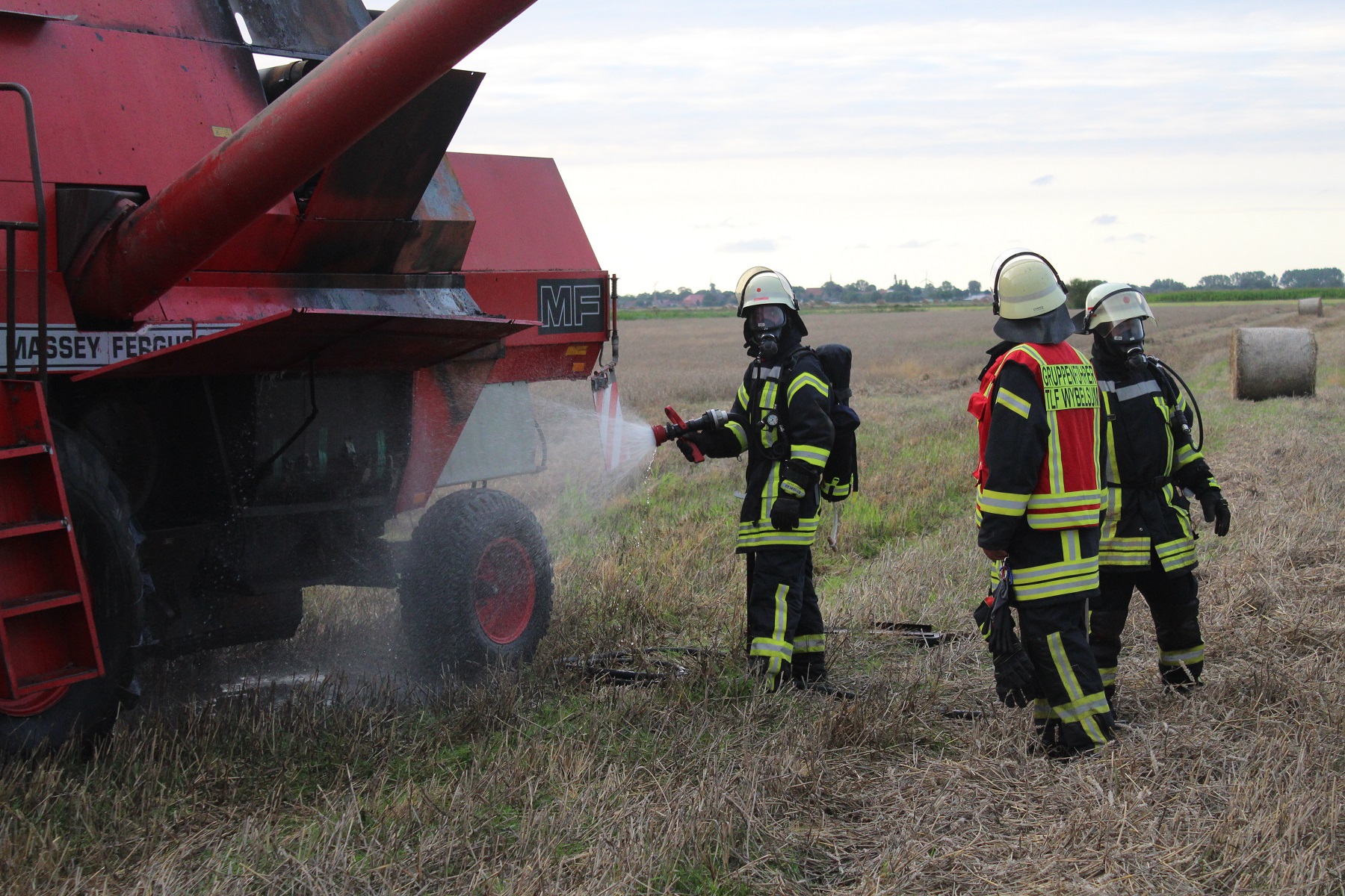 Unter Atemschutz löschten die zuerst eintreffenden Einsatzkräfte der Feuerwehr Emden den brennenden Mähdrescher ab. Die Feuerwehr Krummhörn-Süd übernahm nach dem Eintreffen die letzten Löscharbeiten.