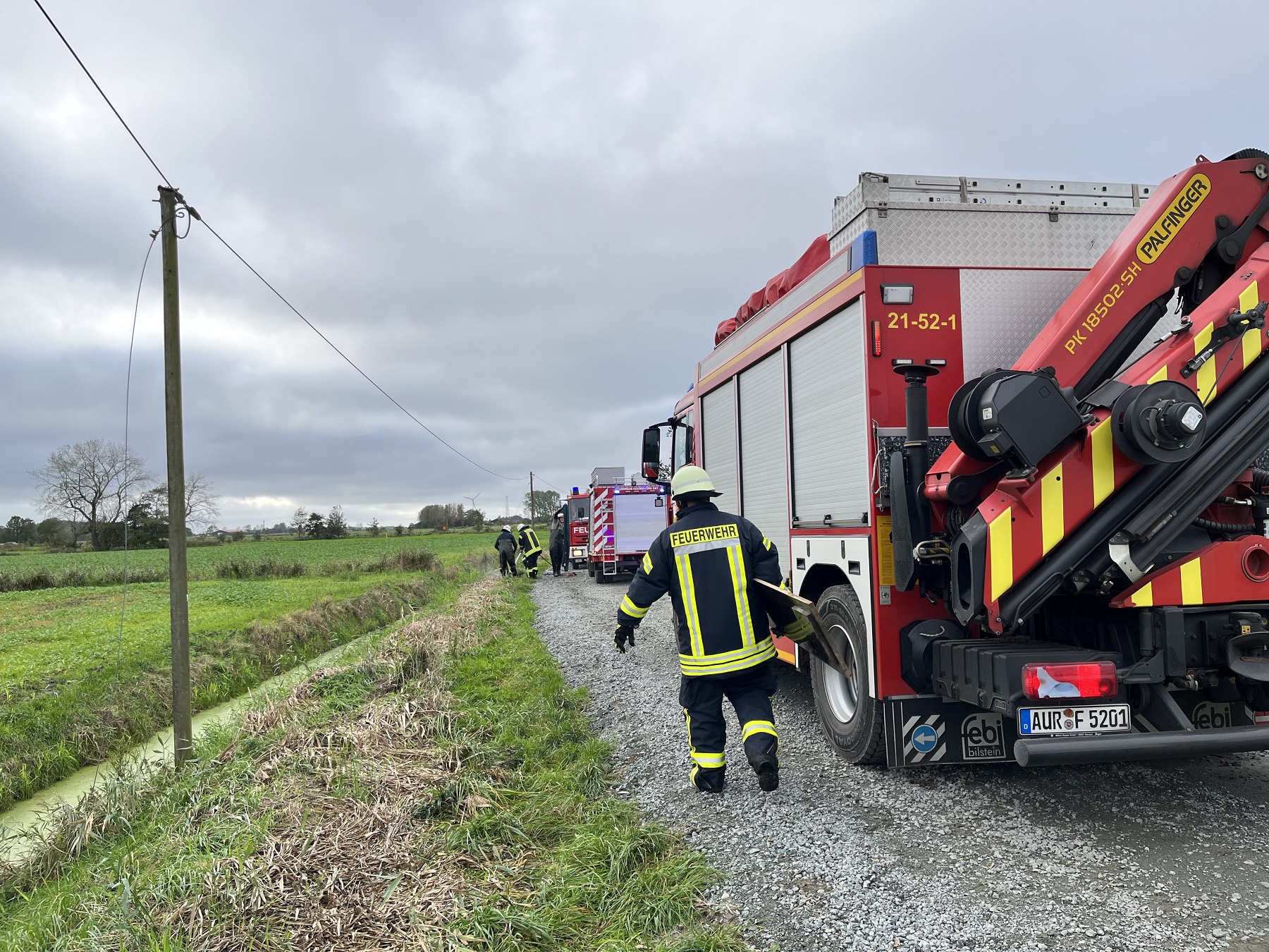 Erste eigenständige Rettungsversuche zeigten keine Wirkung, sodass die Feuerwehr über den Notruf 112 zur Hilfe gerufen wurde. Seitens der Kooperativen Regionalleitstelle Ostfriesland sind daraufhin die Feuerwehr Krummhörn-Ost und der in den Norden stationierte Rüstwagen-Kran des Landkreises Aurich alarmiert worden.