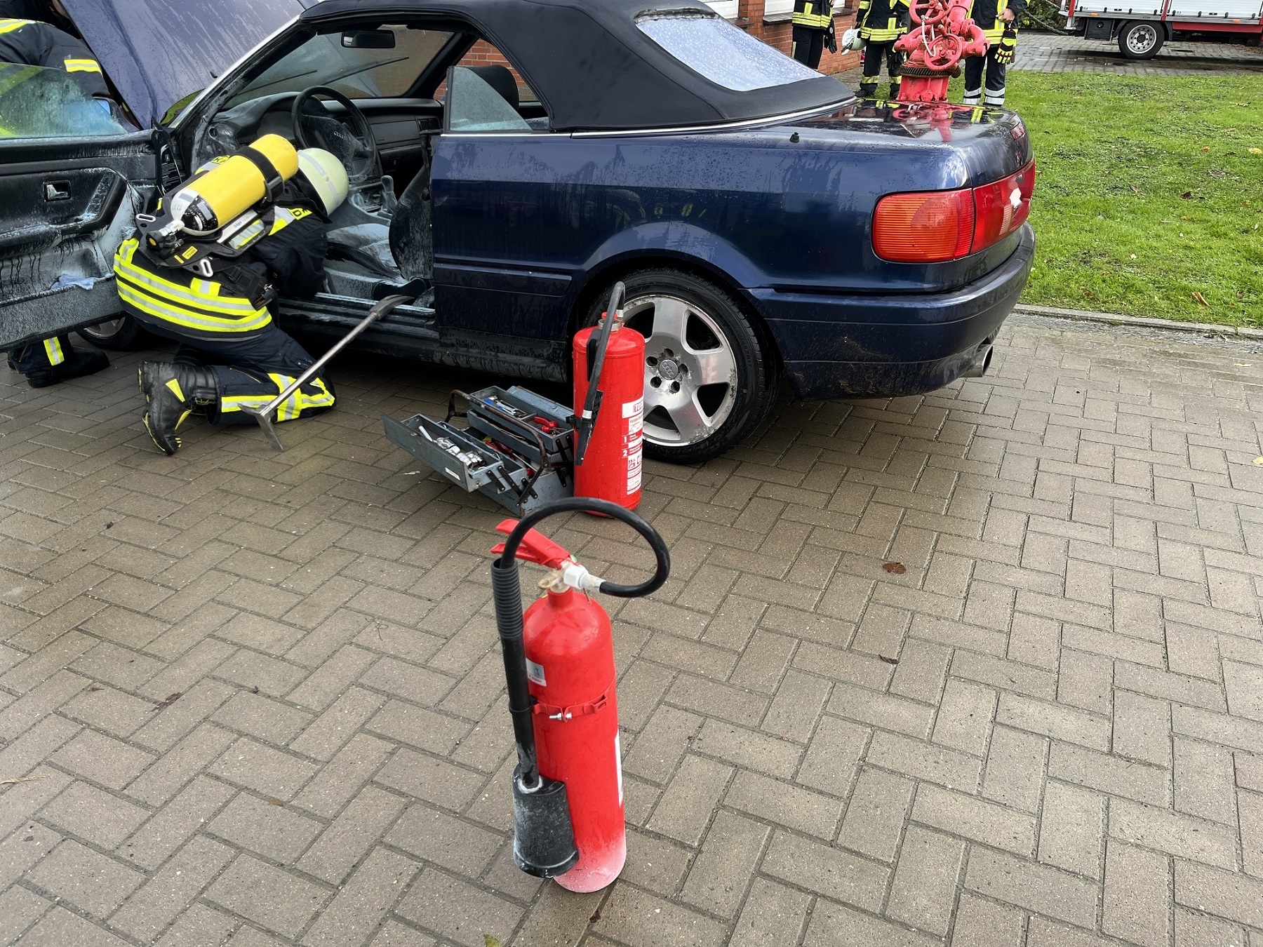 Er hielt in Höhe des Feuerwehrhauses in Rysum an und konnte den Entstehungsbrand mit einem Pulver-Feuerlöscher schnell unter Kontrolle bringen.