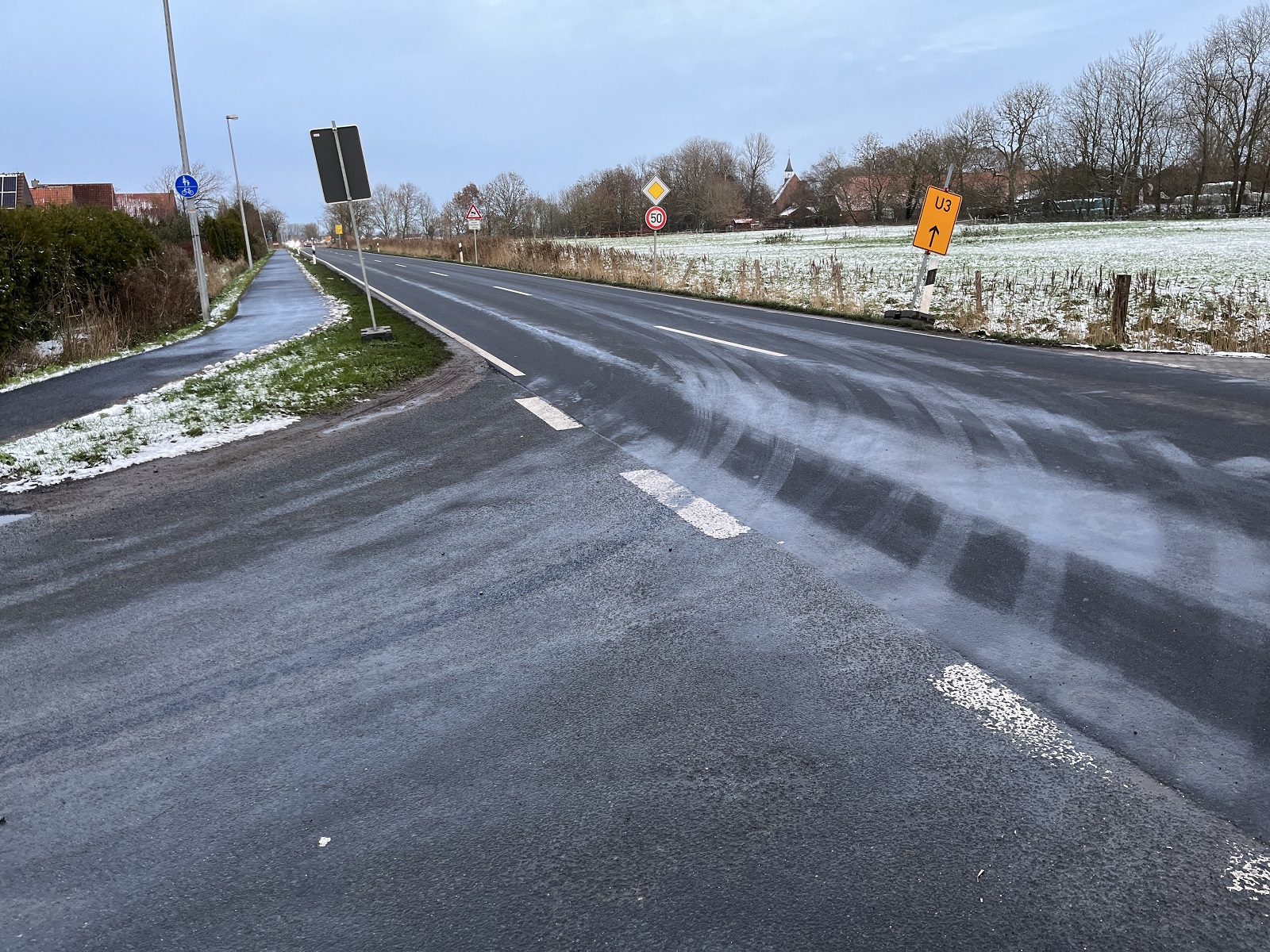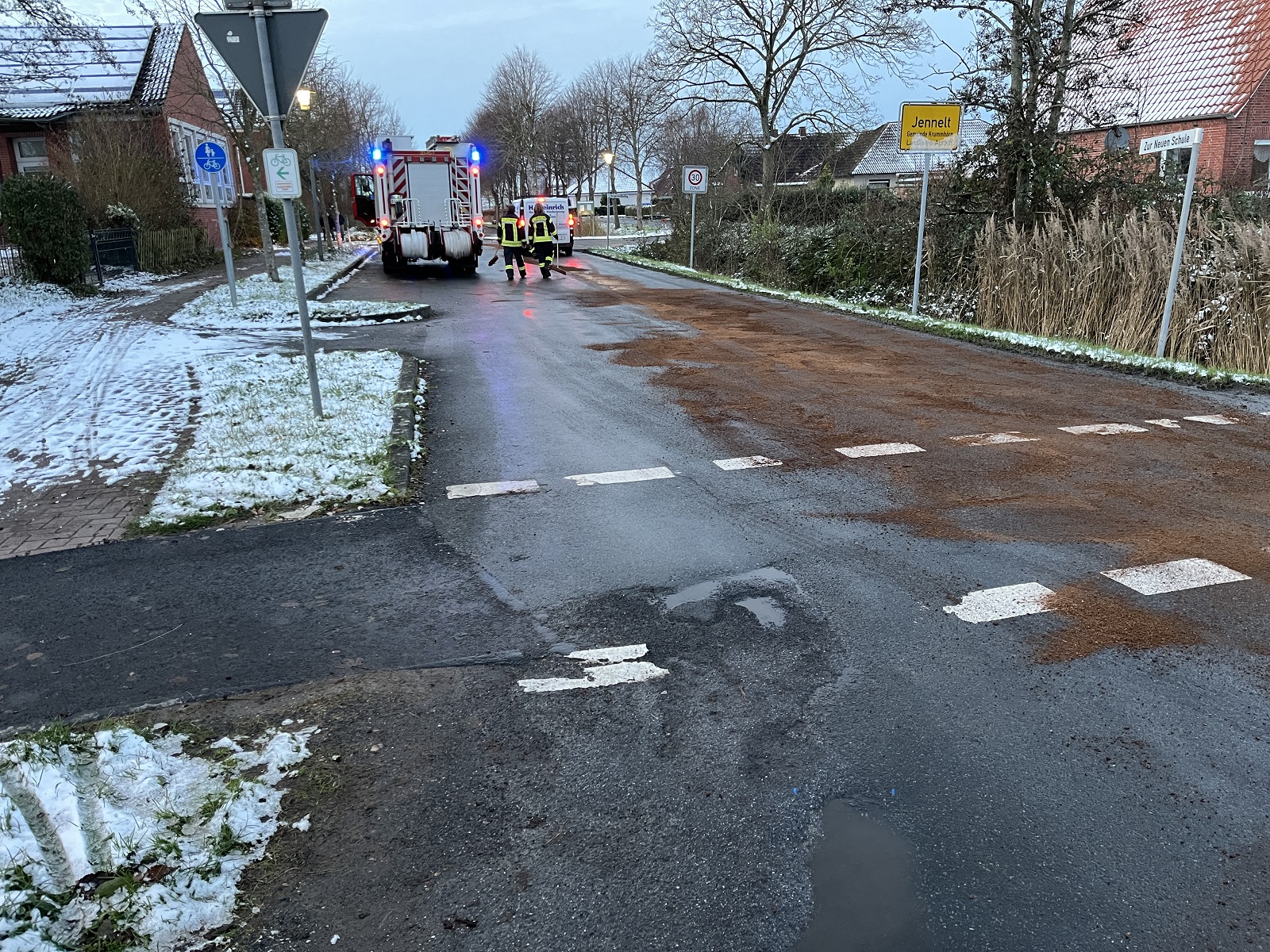 Der Fahrer des Fahrzeugs bemerkte im Jennelter Gerstenweg, dass sein Fahrzeug eine Ölspur verursachte hatte. Im Rahmen der Erkundung stellte die Feuerwehr fest, dass sich die Ölspur von Jennelt bis zur Cirkwehrumer Straße in Uttum zog.