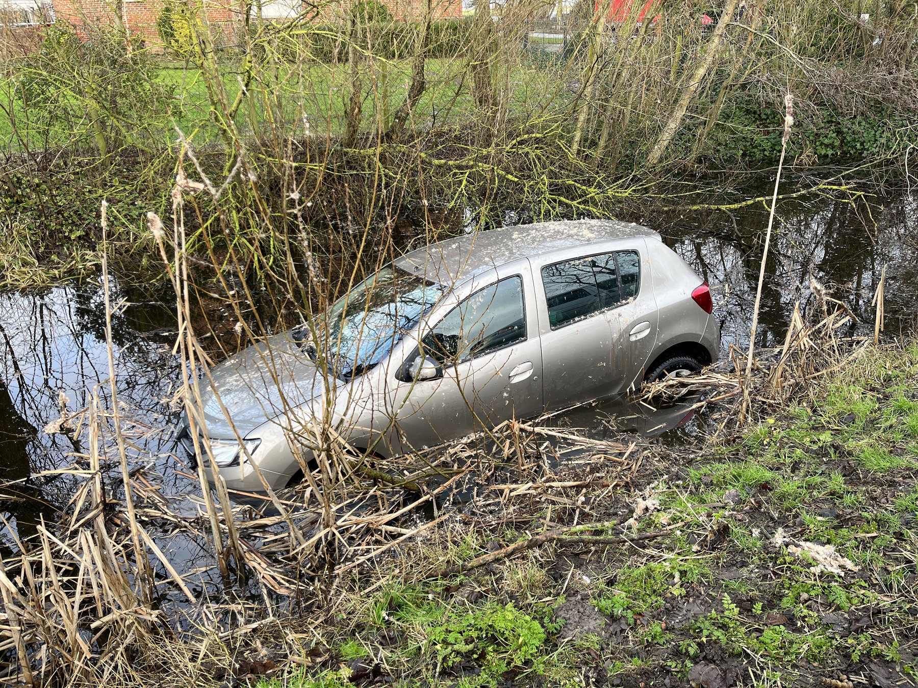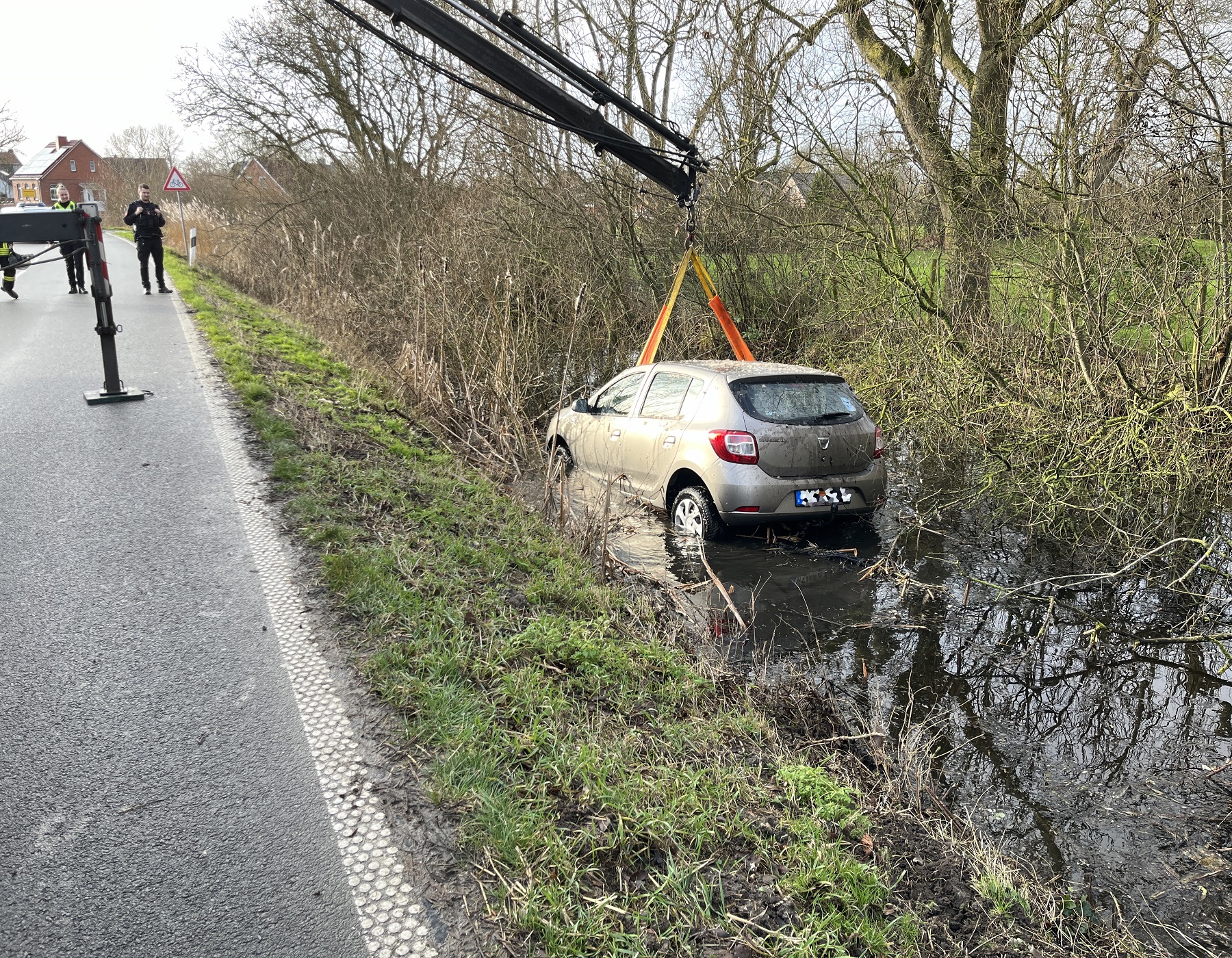 Ein mit zwei Personen besetztes Fahrzeug ist am Samstagvormittag von der Hamswester Straße zwischen Groothusen und Hamswehrum abgekommen und in einen wasserführenden Graben geraten.