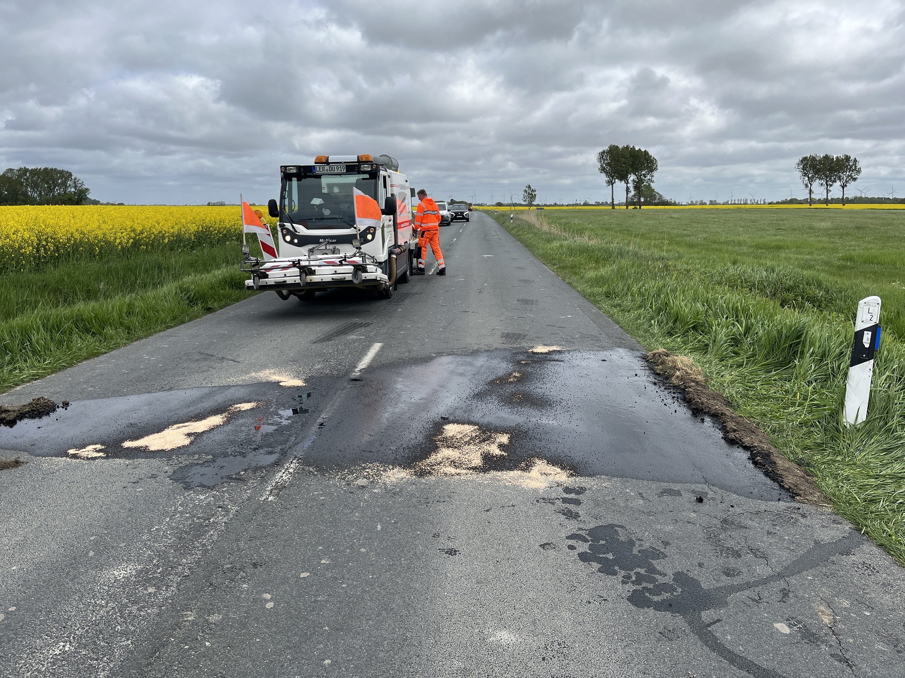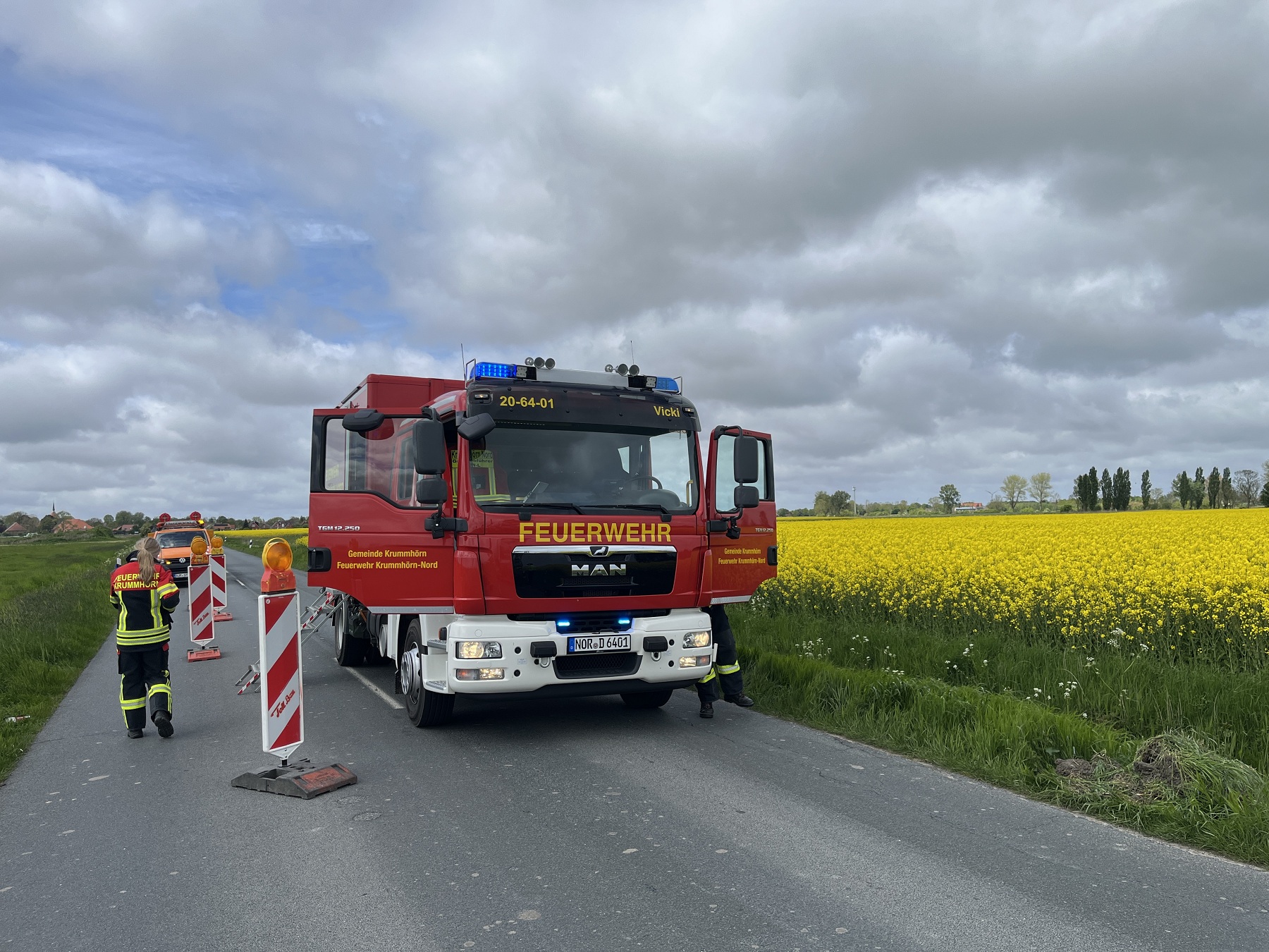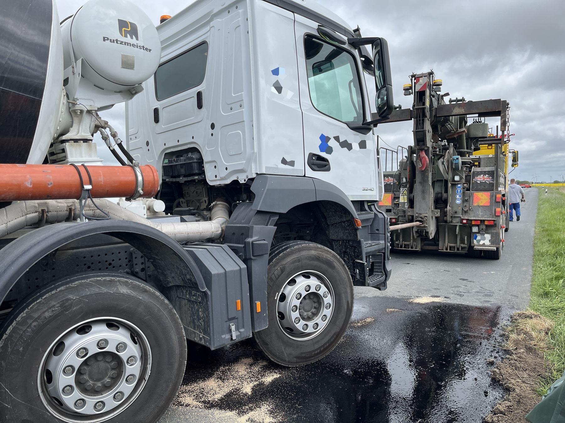 Am Dienstagmittag musste die Landesstraße 2 zwischen Rysum und Wybelsum für etwa zwei Stunden voll gesperrt werden, nachdem es dort zu einem Ölschaden gekommen war. Auslöser war ein Unfall gegen 13:10 Uhr, bei dem ein Betonmischwagen im Bereich einer Baustelle mit einer Absperrbake kollidierte. Dabei wurde die Ölwanne des Lastkraftwagens beschädigt, wodurch Öl auf die Fahrbahn gelangte. Der Betonmischwagen stand infolgedessen quer auf der Fahrbahn. Die anwesenden Bauarbeiter alarmierten umgehend die Feuerwehr über den Notruf 112. Die Ölschadensgruppe der Feuerwehr Krummhörn-Nord rückte daraufhin aus. Nach Rücksprache mit dem Straßenbaulastträger stand die Feuerwehr während der Bergungsmaßnahmen vor Ort in Bereitstellung. Der defekte Betonmischwagen wurde von einem Bergungsunternehmen abgeschleppt. Anschließend reinigte ein Spezialunternehmen die Fahrbahn.