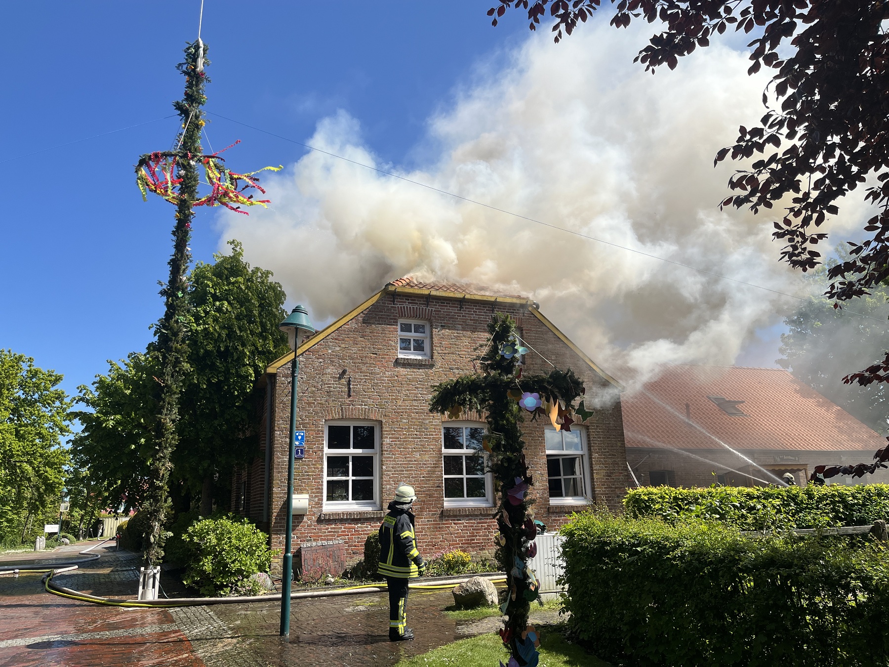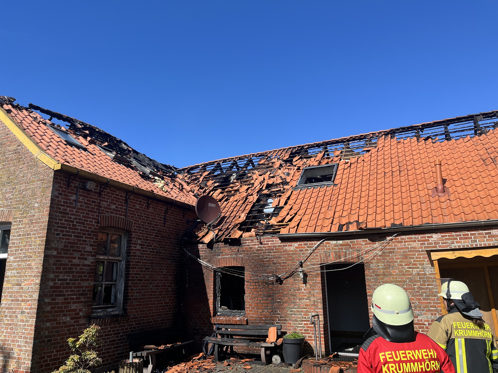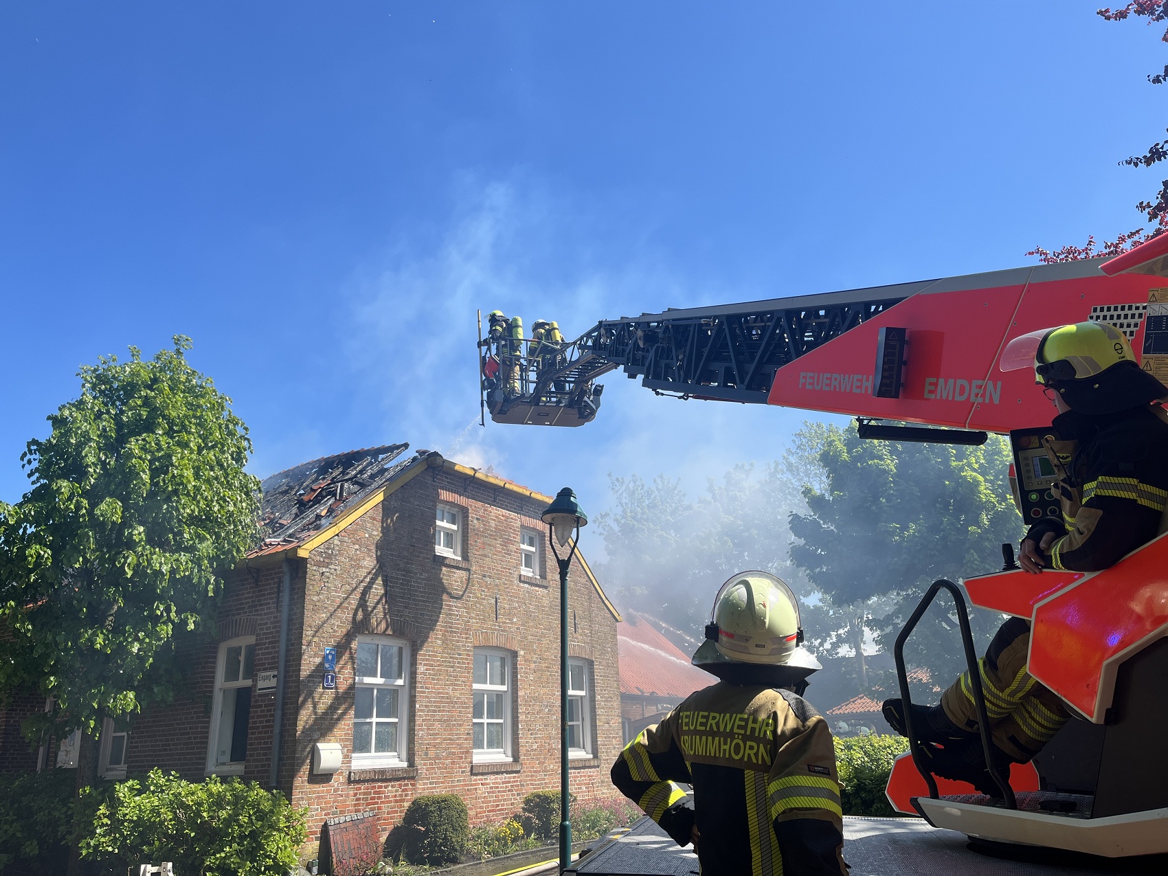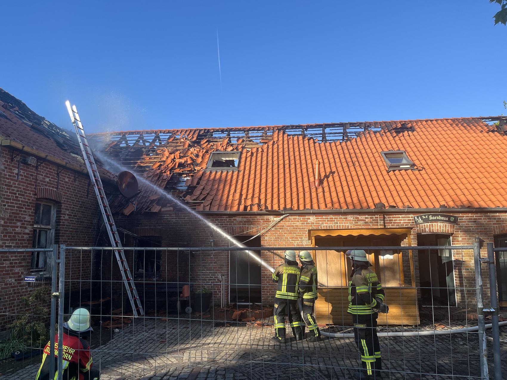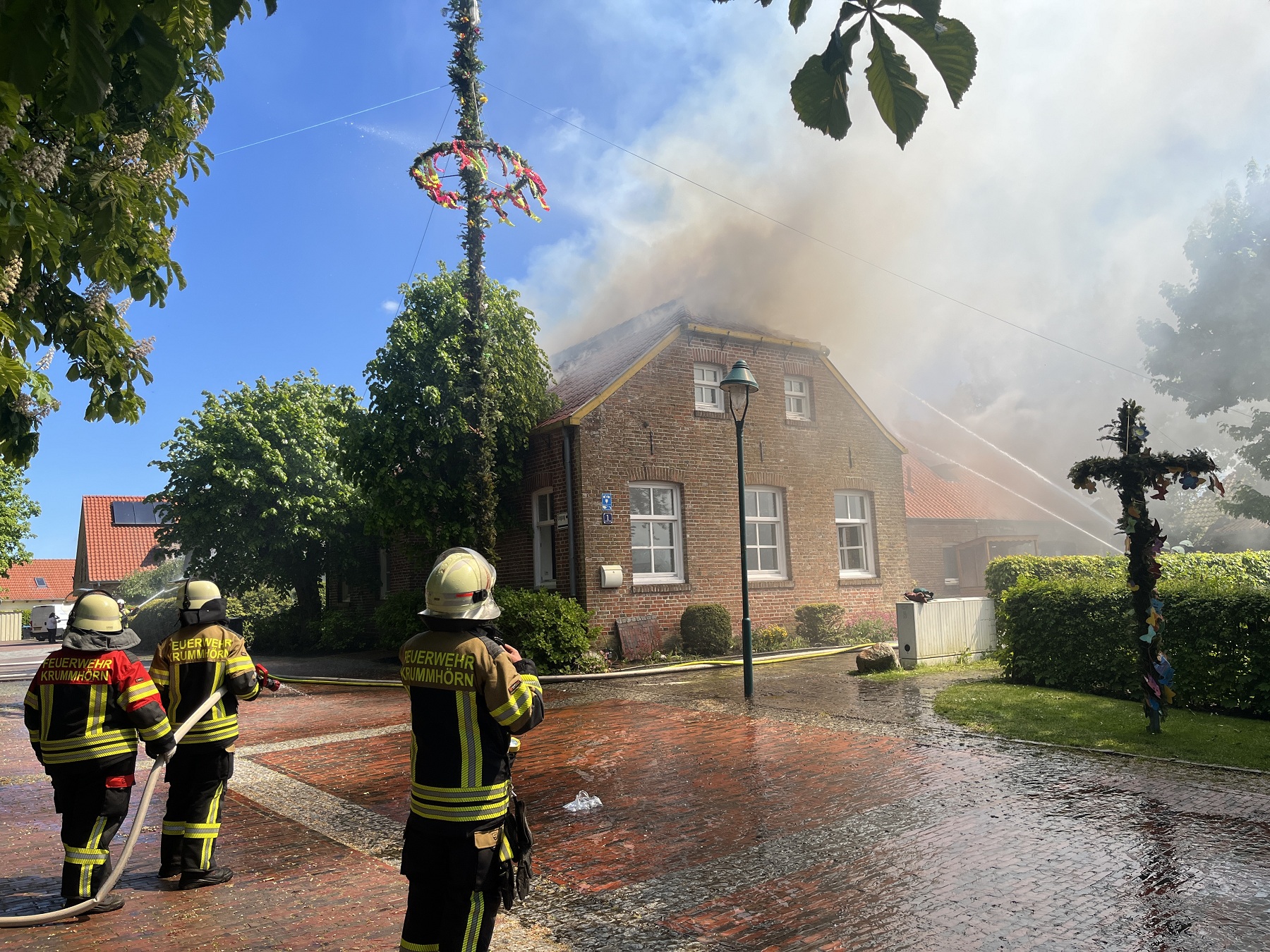 Die Feuerwehren Visquard, Krummhörn-Ost, Krummhörn-Nord und die Einsatzleitwagen-Gruppe der Gemeindefeuerwehr sind am Freitagmittag um 12:03 Uhr zum Jugend- und Kulturhaus Visquard in die Straße "An der Warf" alarmiert worden. Beim Eintreffen der ersten Einsatzkräfte standen zwei Parkbänke in Vollbrand. Fensterscheiben waren aufgrund der massiven Brandentwicklung bereits zerstört worden und das Feuer hatte sich bereits auf die Dachkonstruktion ausgebreitet. Im weiteren Verlauf des Einsatzes griff der Brand auf den gesamten Dachstuhl des Gebäudes über. Zur Unterstützung wurden Atemschutzgeräteträger der Feuerwehr Krummhörn-Mitte sowie die Feuerwehren aus Norden und Emden mit ihren Drehleitern nachalarmiert. Um einen ungehinderten Einsatz der Drehleitern zu ermöglichen, bauten die Einsatzkräfte kurzerhand den dort aufgestellten Maibaum ab. Während die Feuerwehr Krummhörn einen Löschangriff von außen mit handgeführten Strahlrohren durchführte, übernahmen die Drehleitern die Brandbekämpfung aus der Höhe. Am Nachmittag gelang es den Einsatzkräften, das Feuer unter Kontrolle zu bringen. Eine angrenzende Grünfläche diente als Sammelplatz für die Atemschutzgeräteträger. Im Schatten der Bäume konnten sich die Kräfte auf ihren Einsatz vorbereiten und anschließend regenerieren. In den frühen Abendstunden waren auch die letzten Glutnester abgelöscht. Dabei unterstützte die Drohnengruppe der Feuerwehr Osterhusen mit einer Wärmebilddrohne bei der Lokalisierung von letzten Glutnestern. Die Feuerwehr Krummhörn-West übernahm vor Ort die Versorgung der Einsatzkräfte mit Getränken und einer Mahlzeit.