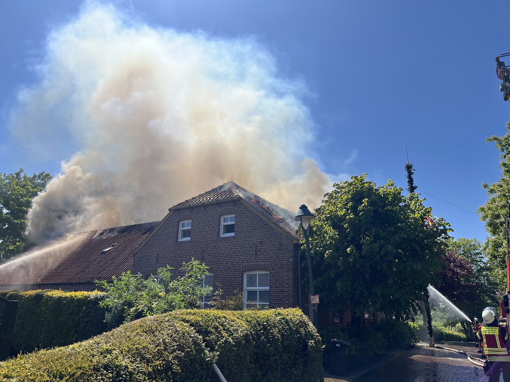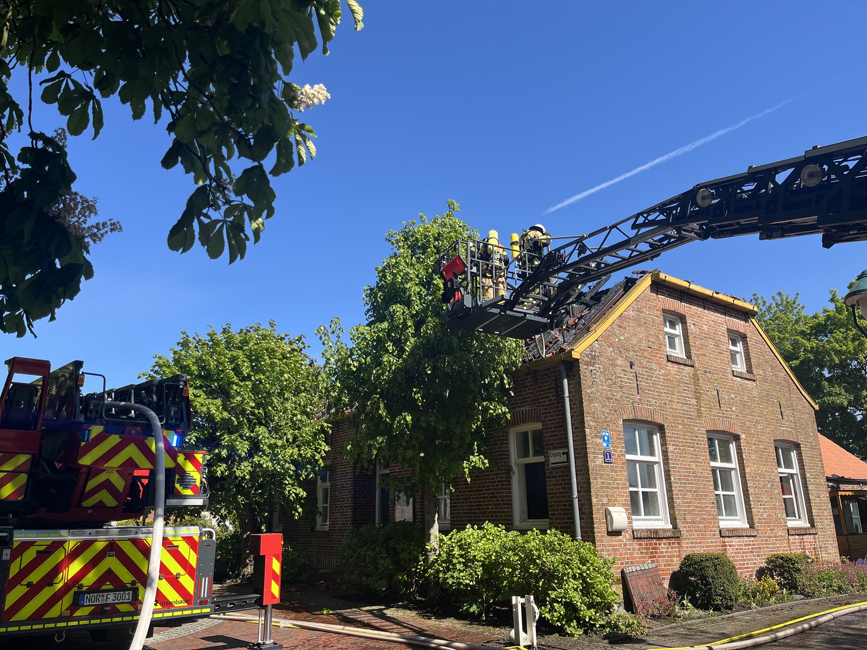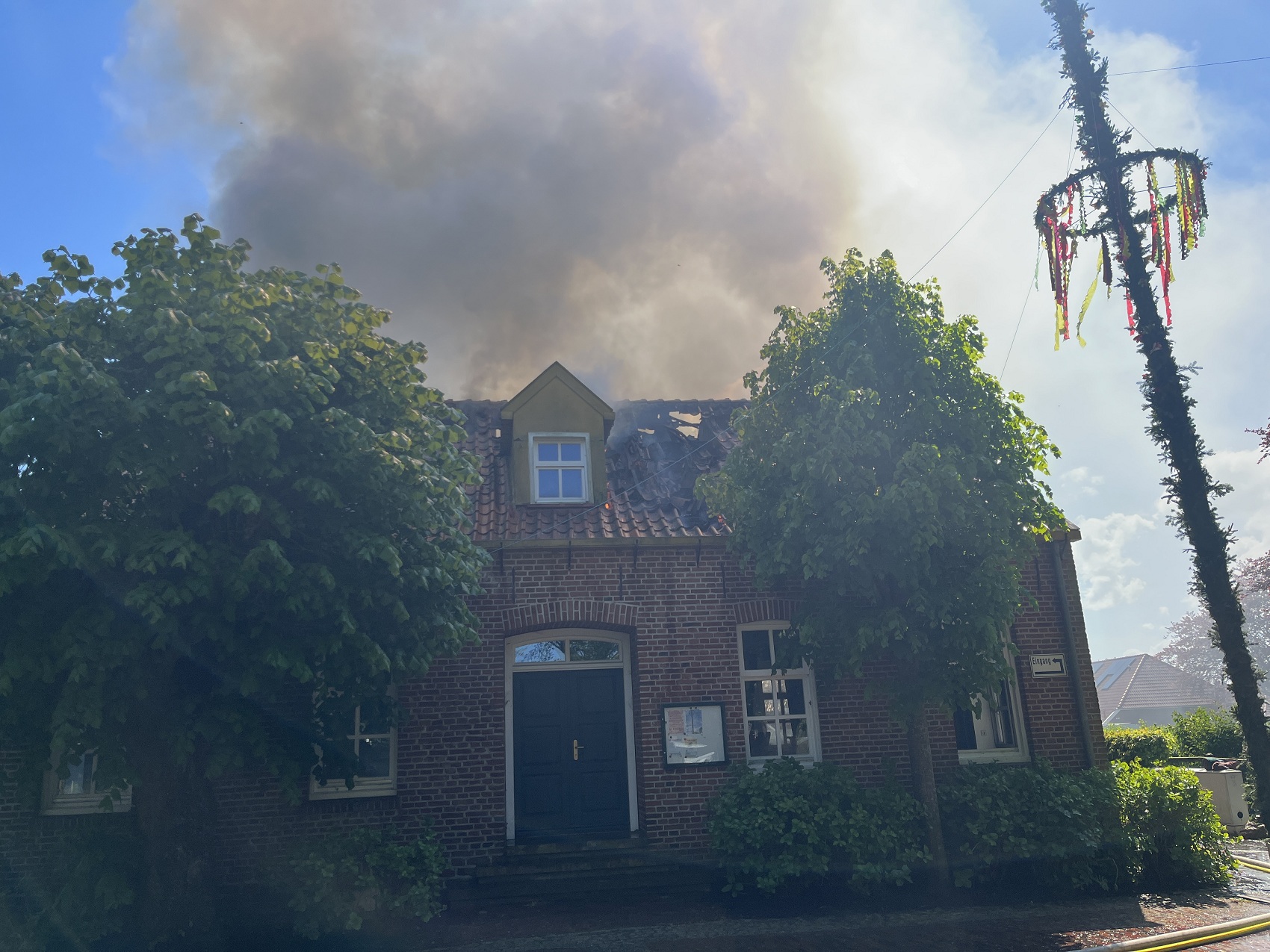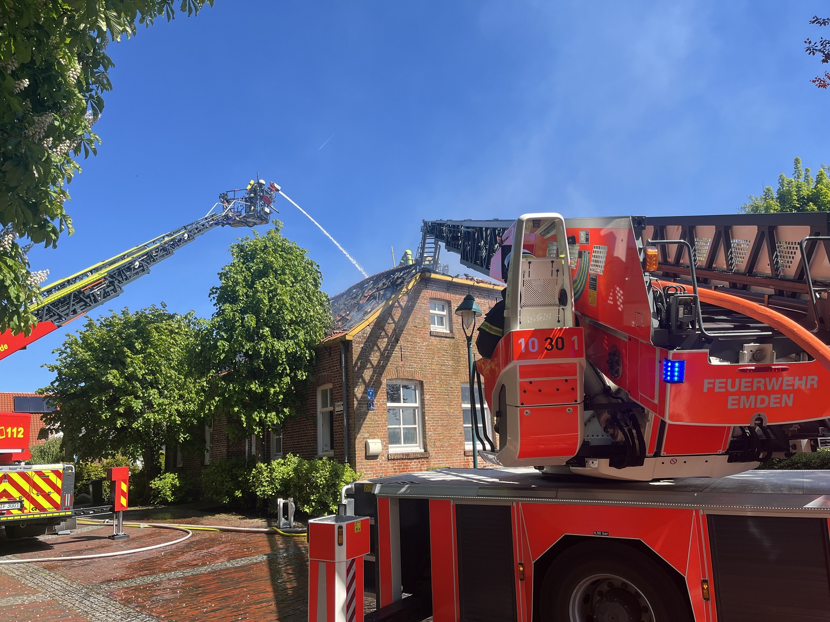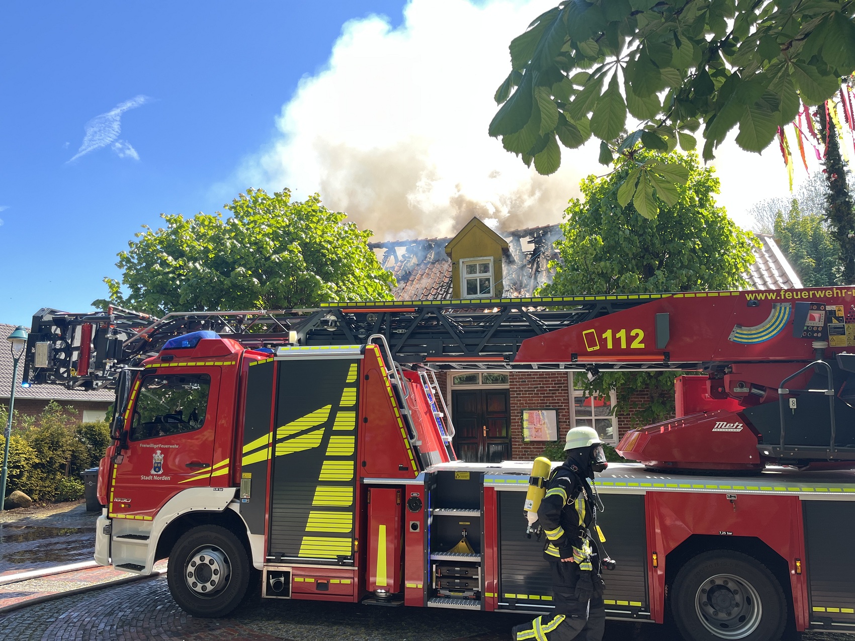 Die Feuerwehren Visquard, Krummhörn-Ost, Krummhörn-Nord und die Einsatzleitwagen-Gruppe der Gemeindefeuerwehr sind am Freitagmittag um 12:03 Uhr zum Jugend- und Kulturhaus Visquard in die Straße "An der Warf" alarmiert worden. Beim Eintreffen der ersten Einsatzkräfte standen zwei Parkbänke in Vollbrand. Fensterscheiben waren aufgrund der massiven Brandentwicklung bereits zerstört worden und das Feuer hatte sich bereits auf die Dachkonstruktion ausgebreitet. Im weiteren Verlauf des Einsatzes griff der Brand auf den gesamten Dachstuhl des Gebäudes über. Zur Unterstützung wurden Atemschutzgeräteträger der Feuerwehr Krummhörn-Mitte sowie die Feuerwehren aus Norden und Emden mit ihren Drehleitern nachalarmiert. Um einen ungehinderten Einsatz der Drehleitern zu ermöglichen, bauten die Einsatzkräfte kurzerhand den dort aufgestellten Maibaum ab. Während die Feuerwehr Krummhörn einen Löschangriff von außen mit handgeführten Strahlrohren durchführte, übernahmen die Drehleitern die Brandbekämpfung aus der Höhe. Am Nachmittag gelang es den Einsatzkräften, das Feuer unter Kontrolle zu bringen. Eine angrenzende Grünfläche diente als Sammelplatz für die Atemschutzgeräteträger. Im Schatten der Bäume konnten sich die Kräfte auf ihren Einsatz vorbereiten und anschließend regenerieren. In den frühen Abendstunden waren auch die letzten Glutnester abgelöscht. Dabei unterstützte die Drohnengruppe der Feuerwehr Osterhusen mit einer Wärmebilddrohne bei der Lokalisierung von letzten Glutnestern. Die Feuerwehr Krummhörn-West übernahm vor Ort die Versorgung der Einsatzkräfte mit Getränken und einer Mahlzeit.
