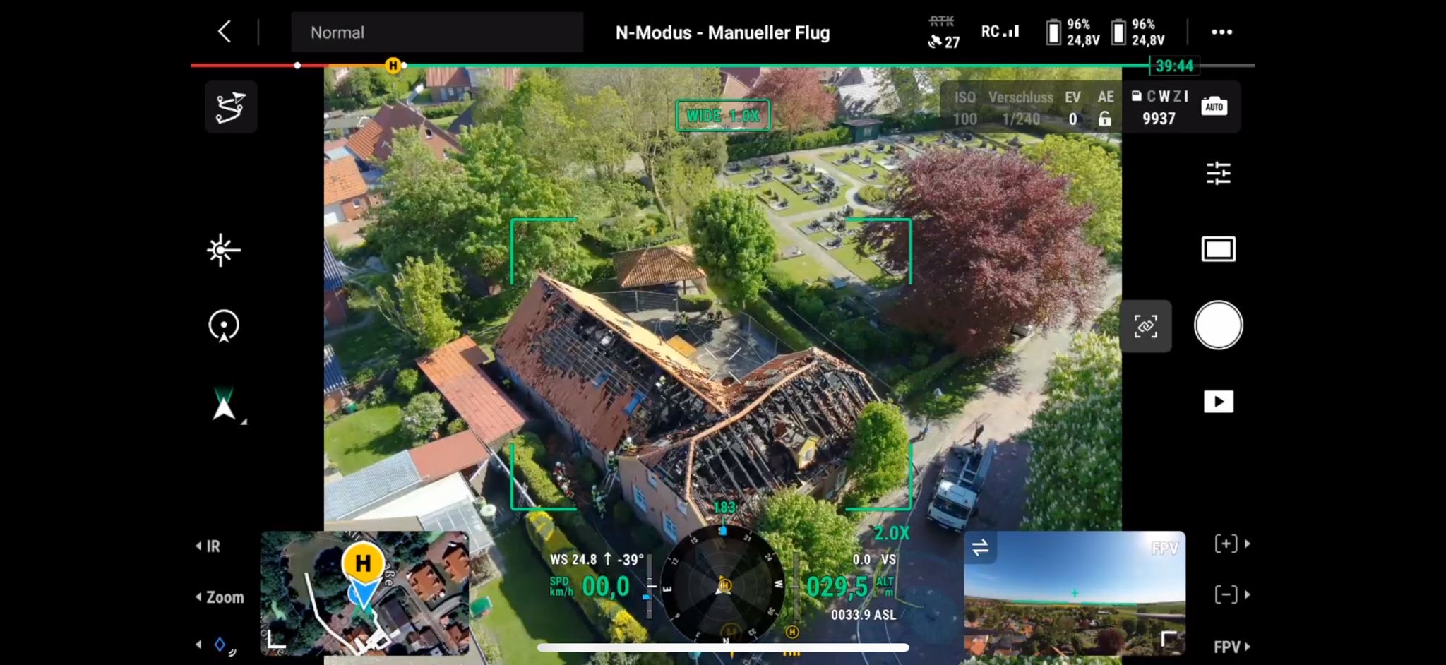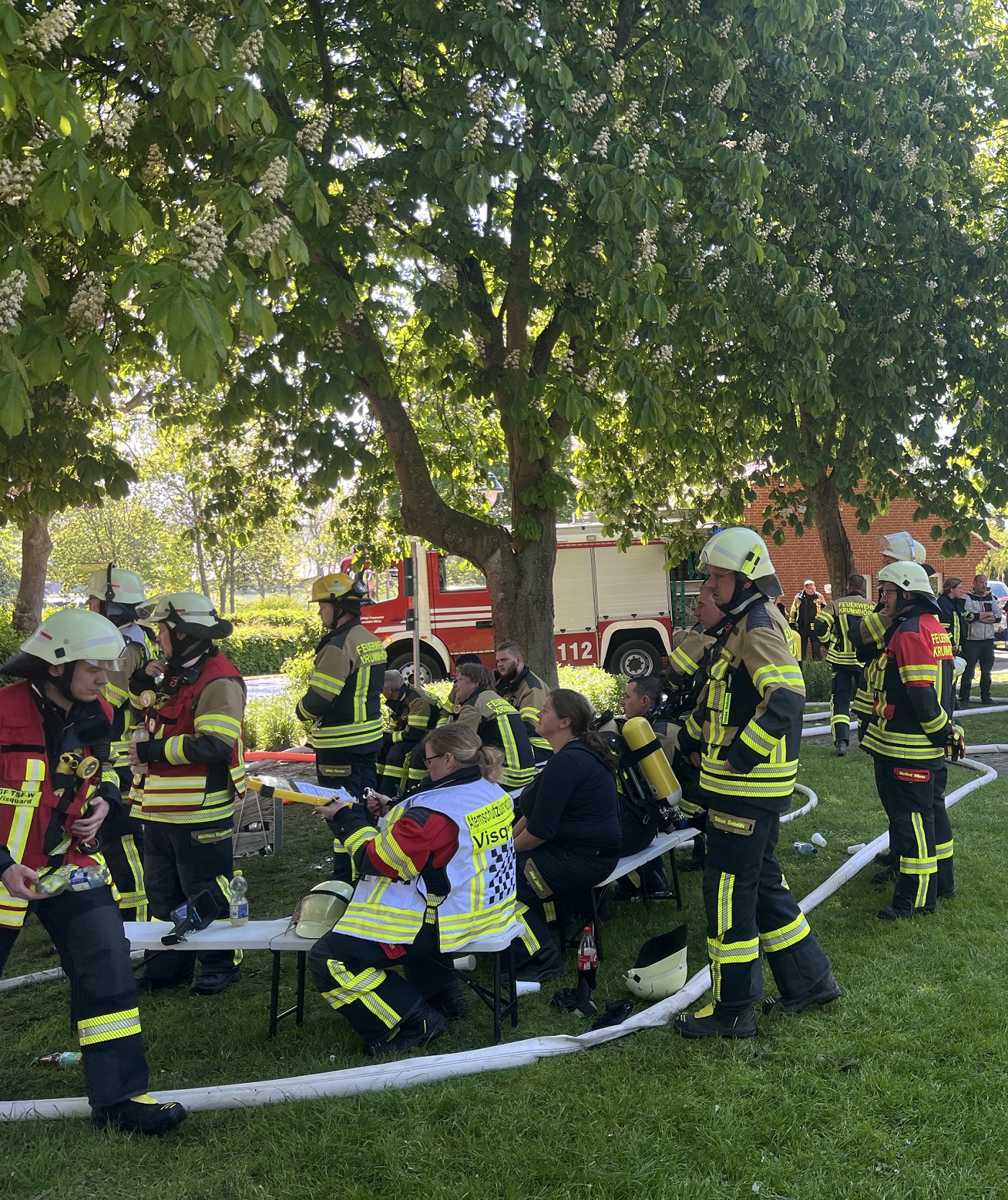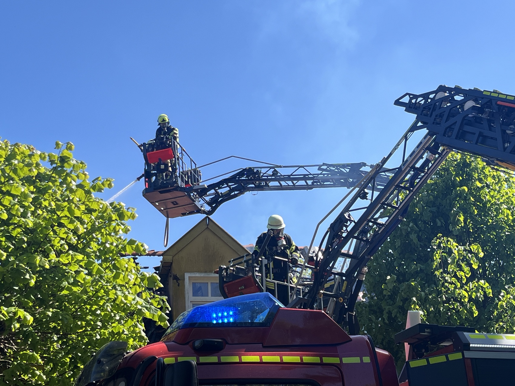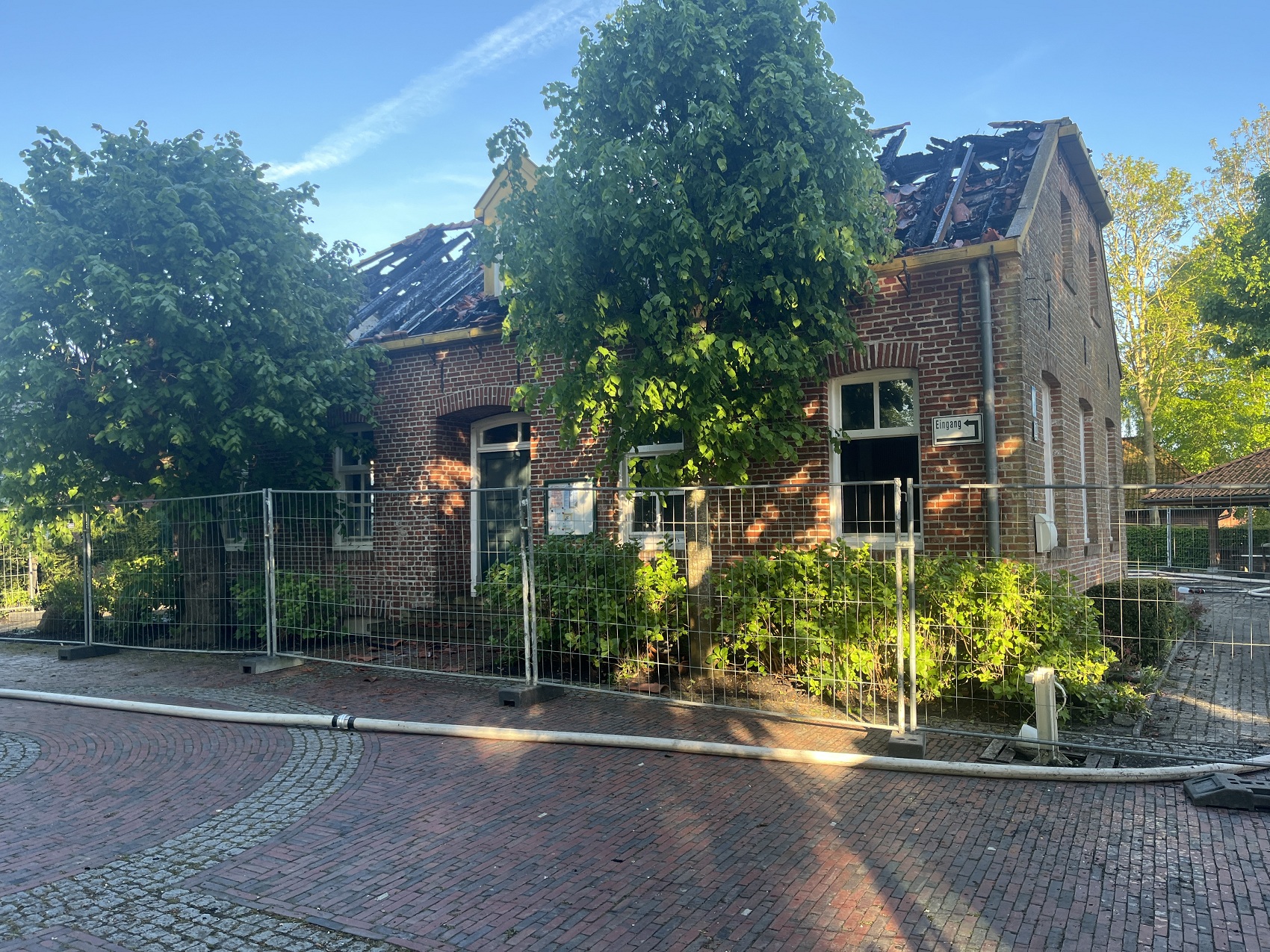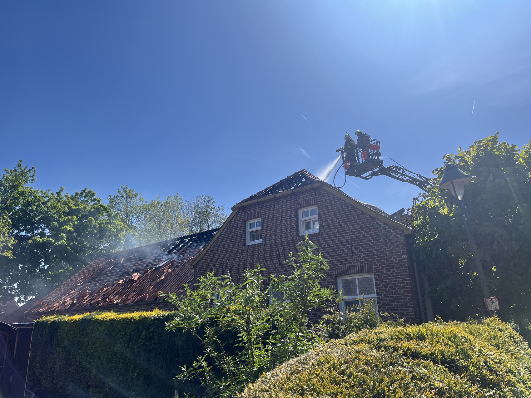 Die Feuerwehren Visquard, Krummhörn-Ost, Krummhörn-Nord und die Einsatzleitwagen-Gruppe der Gemeindefeuerwehr sind am Freitagmittag um 12:03 Uhr zum Jugend- und Kulturhaus Visquard in die Straße "An der Warf" alarmiert worden. Beim Eintreffen der ersten Einsatzkräfte standen zwei Parkbänke in Vollbrand. Fensterscheiben waren aufgrund der massiven Brandentwicklung bereits zerstört worden und das Feuer hatte sich bereits auf die Dachkonstruktion ausgebreitet. Im weiteren Verlauf des Einsatzes griff der Brand auf den gesamten Dachstuhl des Gebäudes über. Zur Unterstützung wurden Atemschutzgeräteträger der Feuerwehr Krummhörn-Mitte sowie die Feuerwehren aus Norden und Emden mit ihren Drehleitern nachalarmiert. Um einen ungehinderten Einsatz der Drehleitern zu ermöglichen, bauten die Einsatzkräfte kurzerhand den dort aufgestellten Maibaum ab. Während die Feuerwehr Krummhörn einen Löschangriff von außen mit handgeführten Strahlrohren durchführte, übernahmen die Drehleitern die Brandbekämpfung aus der Höhe. Am Nachmittag gelang es den Einsatzkräften, das Feuer unter Kontrolle zu bringen. Eine angrenzende Grünfläche diente als Sammelplatz für die Atemschutzgeräteträger. Im Schatten der Bäume konnten sich die Kräfte auf ihren Einsatz vorbereiten und anschließend regenerieren. In den frühen Abendstunden waren auch die letzten Glutnester abgelöscht. Dabei unterstützte die Drohnengruppe der Feuerwehr Osterhusen mit einer Wärmebilddrohne bei der Lokalisierung von letzten Glutnestern. Die Feuerwehr Krummhörn-West übernahm vor Ort die Versorgung der Einsatzkräfte mit Getränken und einer Mahlzeit.