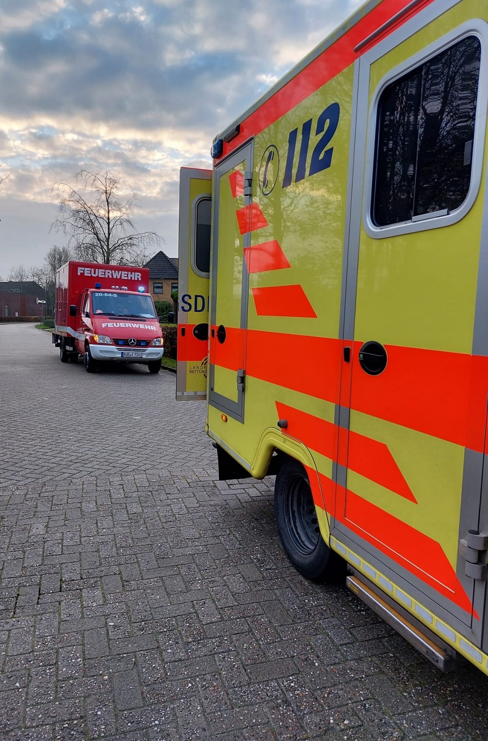 Bild: FW Krummhörn-Mitte Am Mittwochmorgen ist die Ortsfeuerwehr Krummhörn-Mitte zur Unterstützung des Rettungsdienstes alarmiert worden. Der Rettungsdienst benötigte bei einem Einsatz in Pewsum die Feuerwehr zur Tragehilfe. In einer Schleifkorbtrage ist eine Person von den Einsatzkräften aus dem ersten Obergeschoss eines Gebäudes nach unten getragen worden.