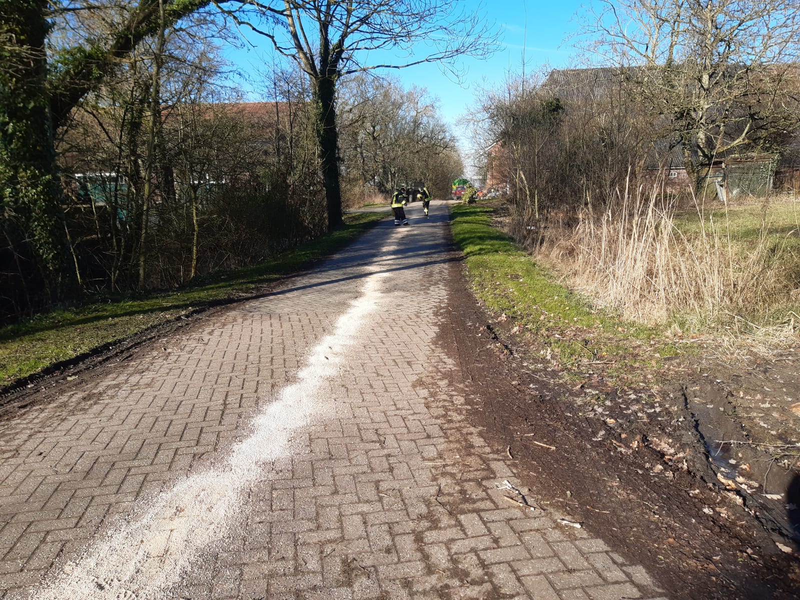 Bilder: stv. OrtsBM FW Krummhörn-West Eine geplatzte Hydraulikleitung an einem LKW hat am Mittwochmittag zu einem Feuerwehreinsatz in Groothusen geführt. Da sich aufgrund der geplatzten Leitung eine Ölspur vom Thenerweg über die Tiede-Ubben-Straße bis zur Van-Wingene-Straße zog, ist die Ölschadensgruppe der Feuerwehr Krummhörn-Nord von der Polizei angefordert worden. Einsatzkräfte der Feuerwehr sicherten die Einsatzstelle ab und streuten die Ölspur mit Bindemittel ab. Der Bauhof der Gemeinde Krummhörn übernahm anschließend die Absicherung der Einsatzstelle. Eine Spezialfirma reinigte im Anschluss die Straße.