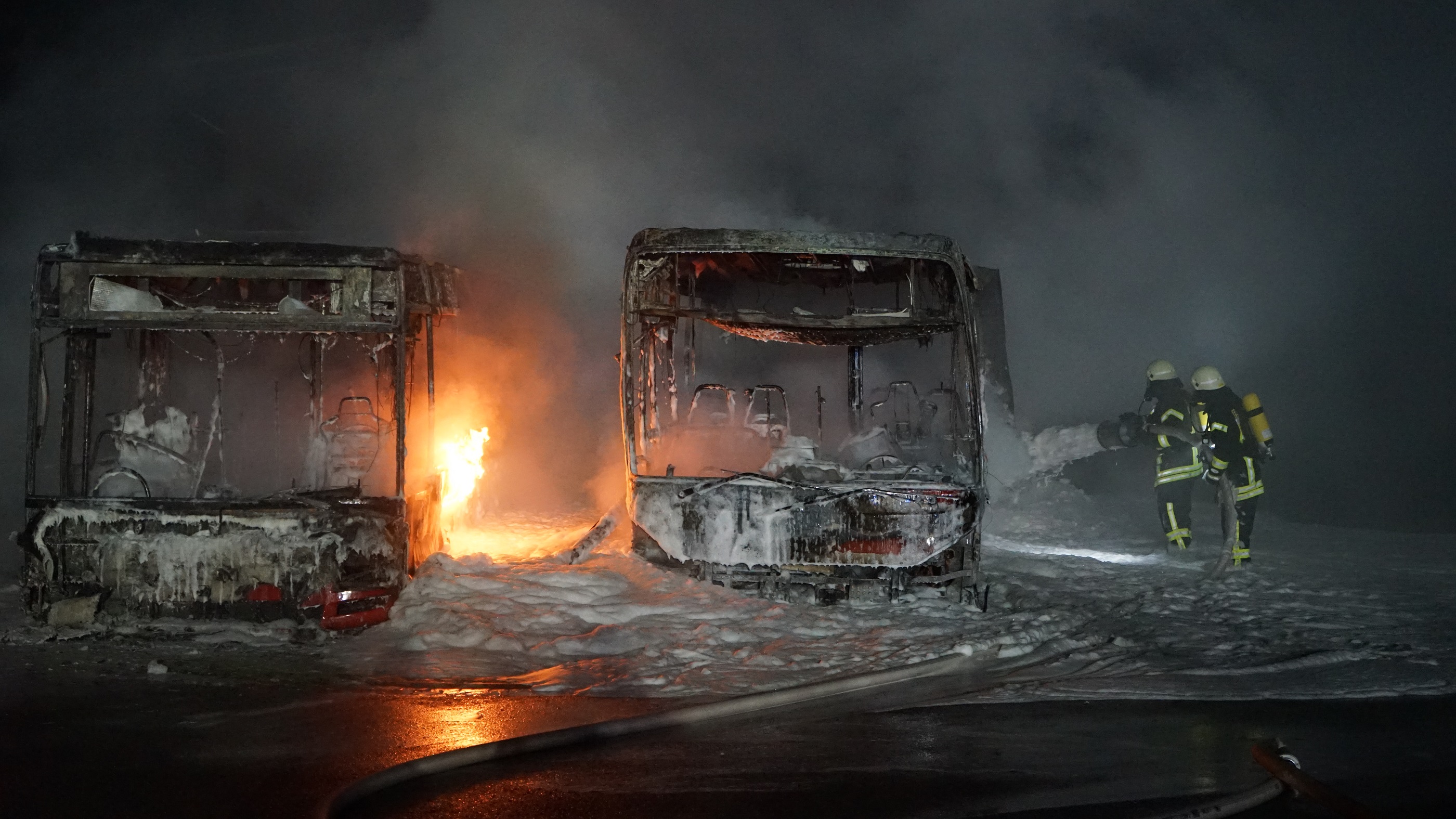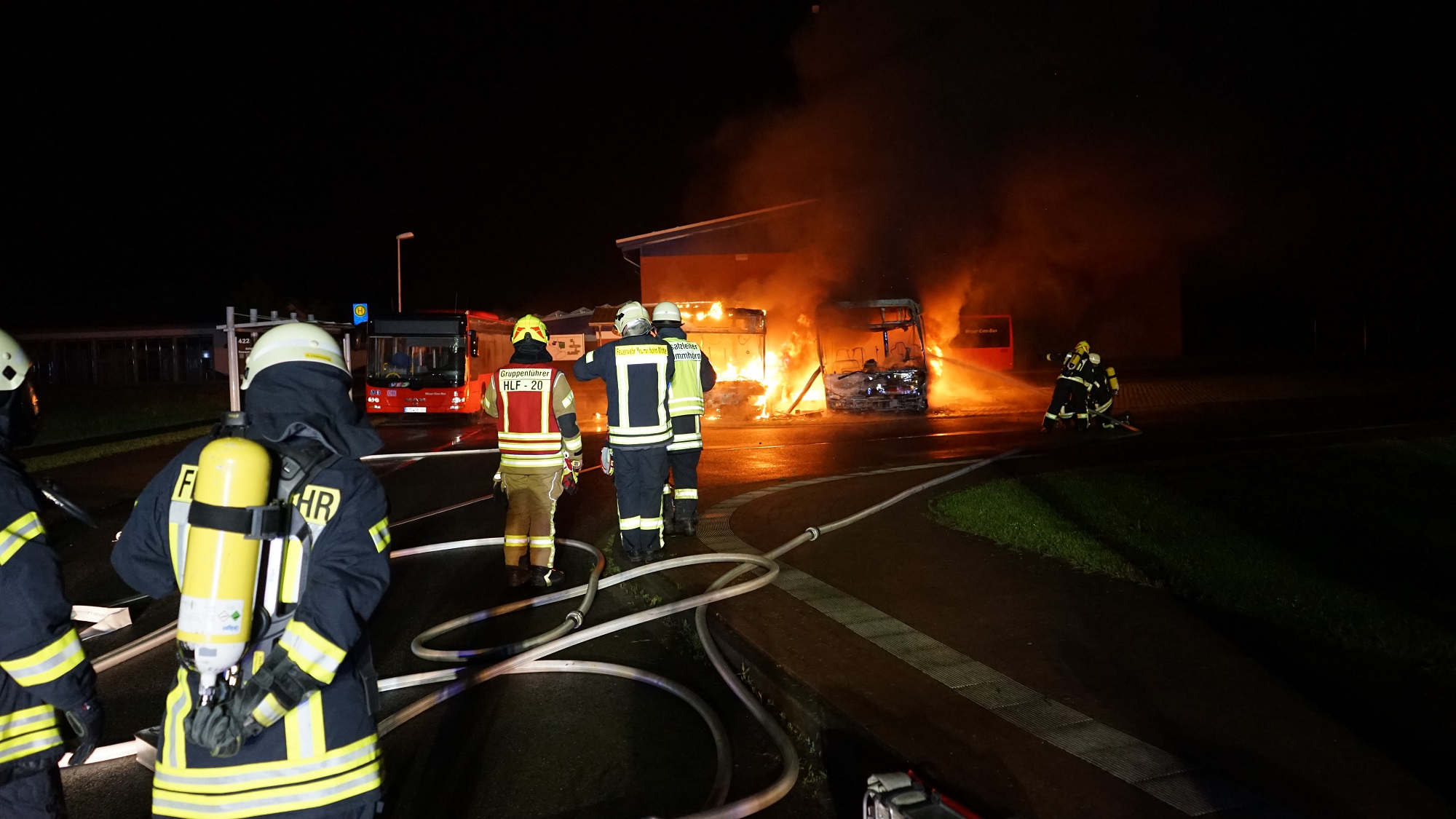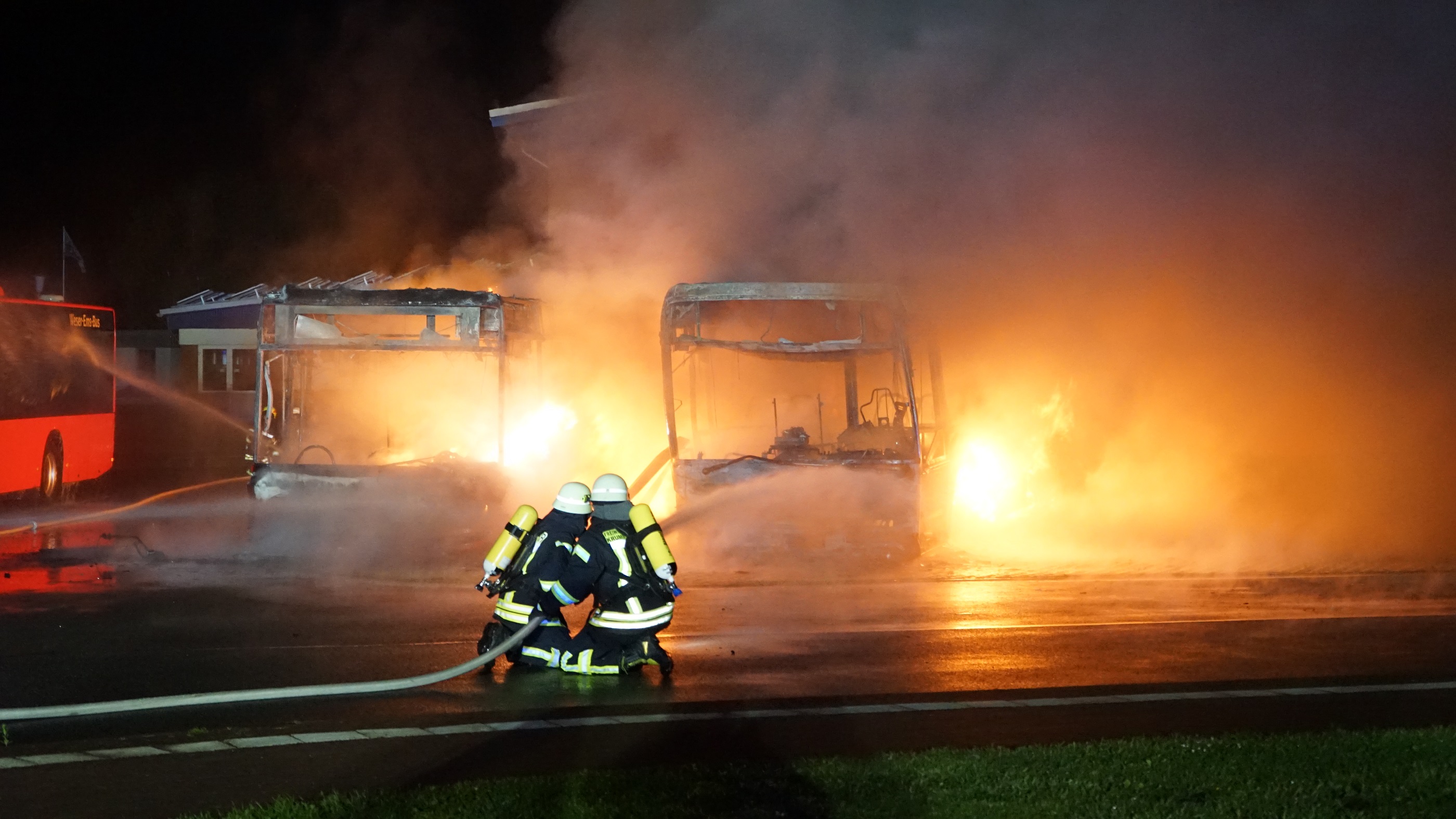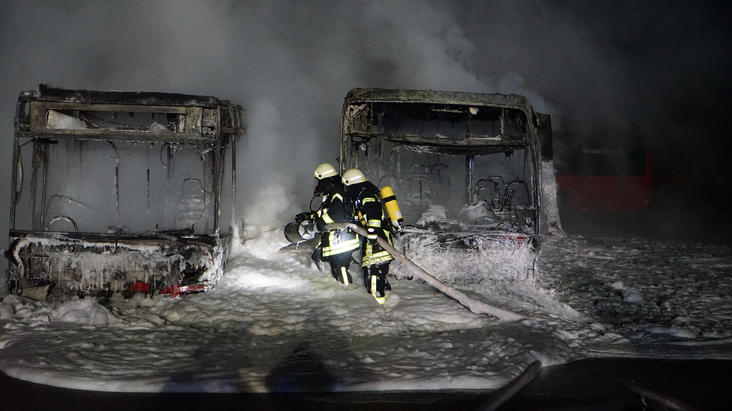 Zwei abgestellte Busse haben in der Nacht zu Mittwoch in Pewsum in Vollbrand gestanden. Personen kamen nicht zu Schaden. Um 01:06 Uhr sind die Feuerwehren Krummhörn-Mitte und Krummhörn-West zu der Einsatzstelle in der Olympiastraße alarmiert worden. Der Feuerschein war bereits aus weiter Entfernung zu sehen. Auch laute Knallgeräusche waren immer wieder zu vernehmen. Als die Feuerwehr vor Ort eintraf, standen beide Busse in Vollbrand. Die Einsatzkräfte begannen vor Ort umgehend mit mehreren Trupps unter Atemschutz die Brandbekämpfung. Aufgrund des schnellen und effektiven Einsatzes der Feuerwehr konnte ein Übergreifen der Flammen auf weitere Busse, die im Nahbereich abgestellt waren, verhindert werden. Im Zuge der Löscharbeiten kam auch Schaummittel zum Einsatz. Nach Abschluss der Löscharbeiten sperrte der Bauhof der Gemeinde Krummhörn den Bereich um die beiden ausgebrannten Fahrzeugwracks mit Bauzäunen ab. Um die Reinigungsarbeiten vor Ort kümmerte sich eine Spezialfirma.
