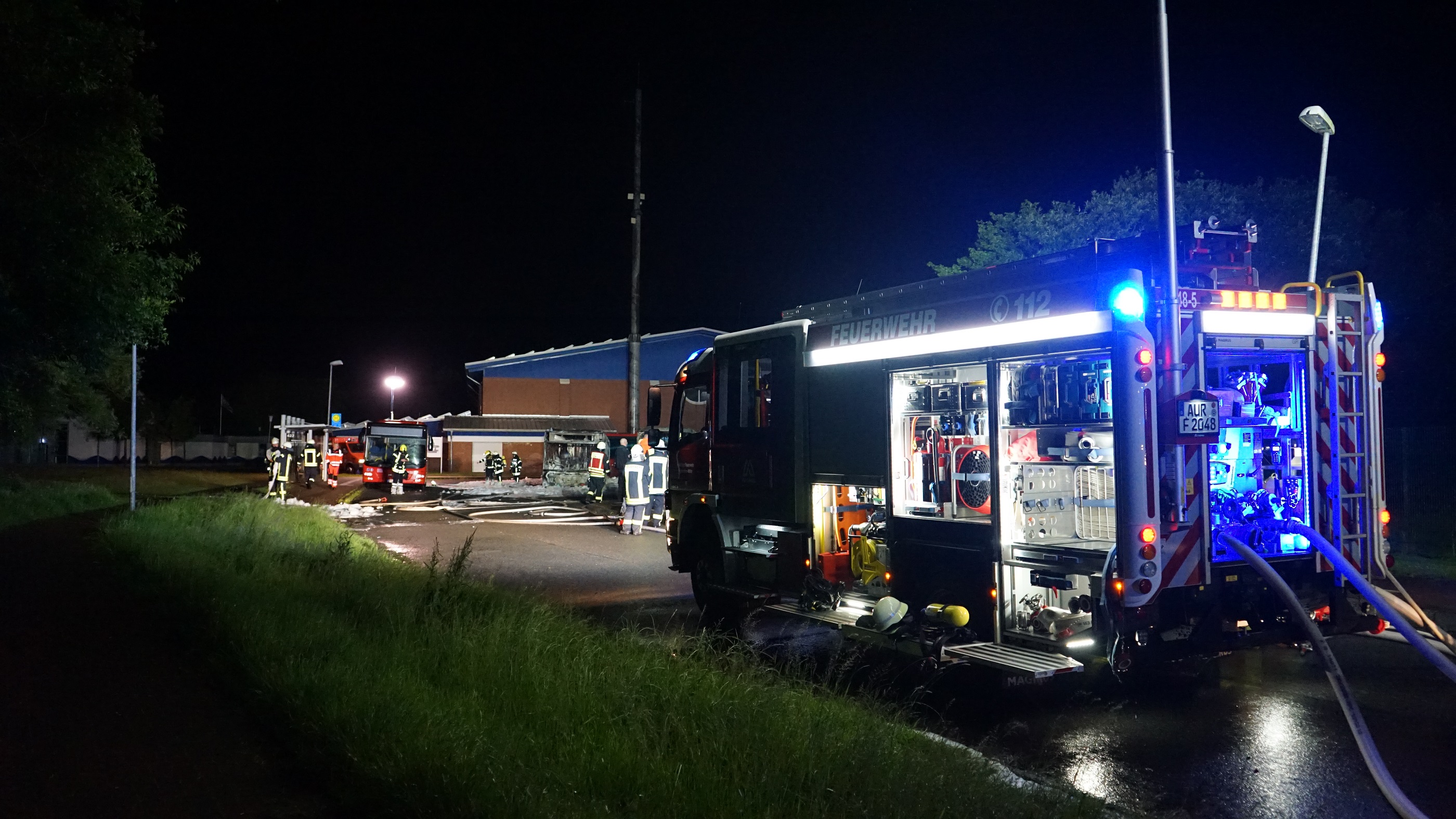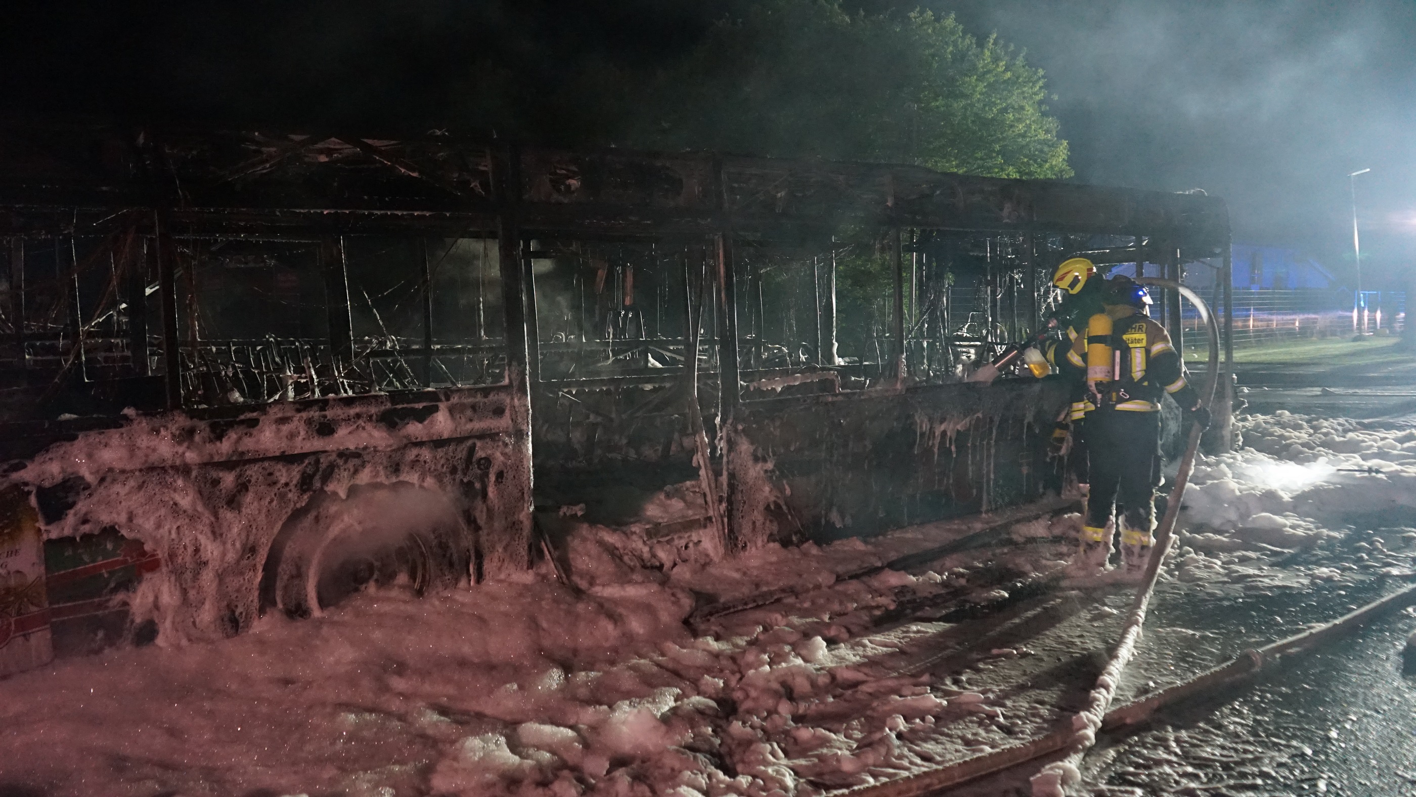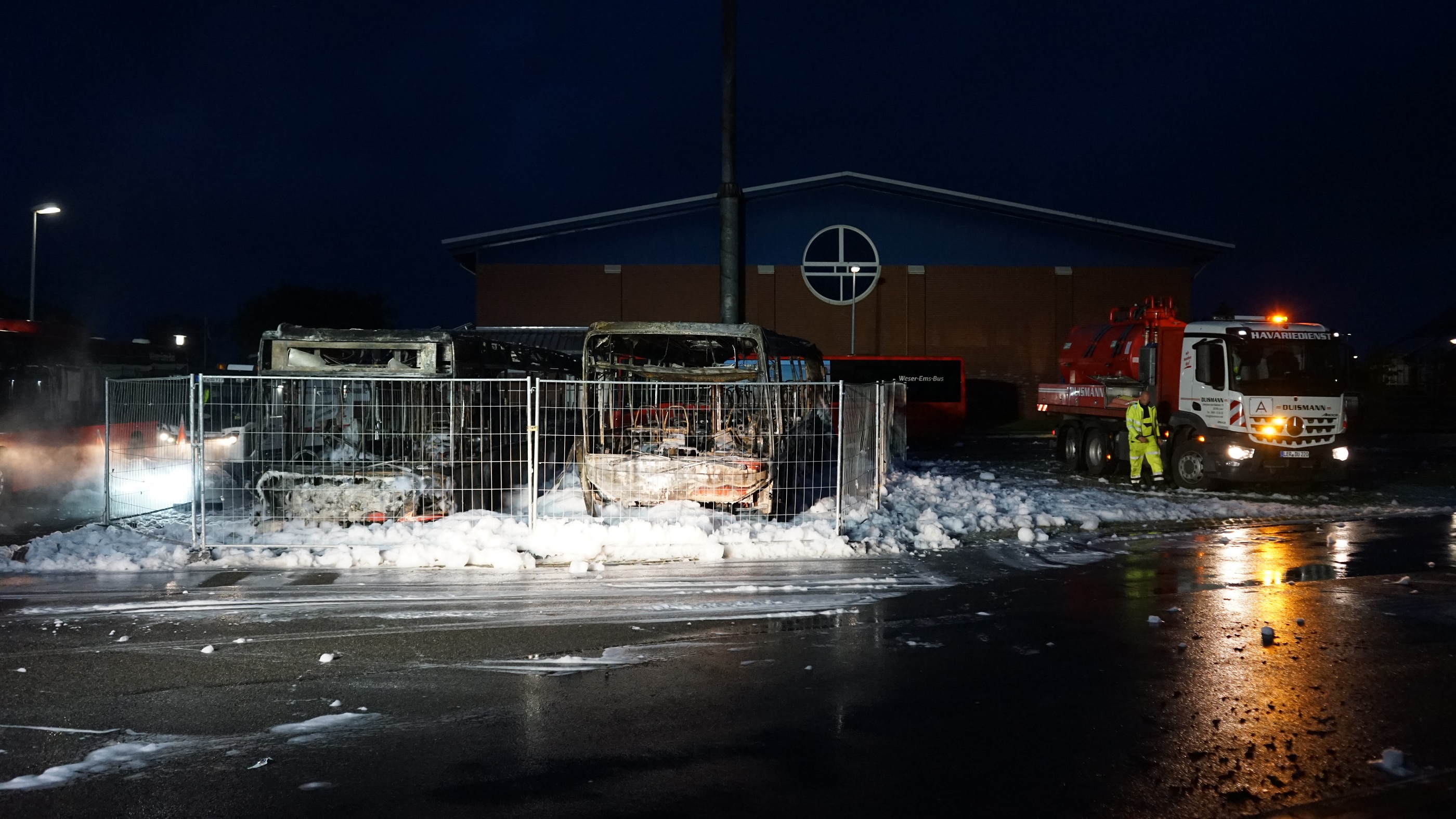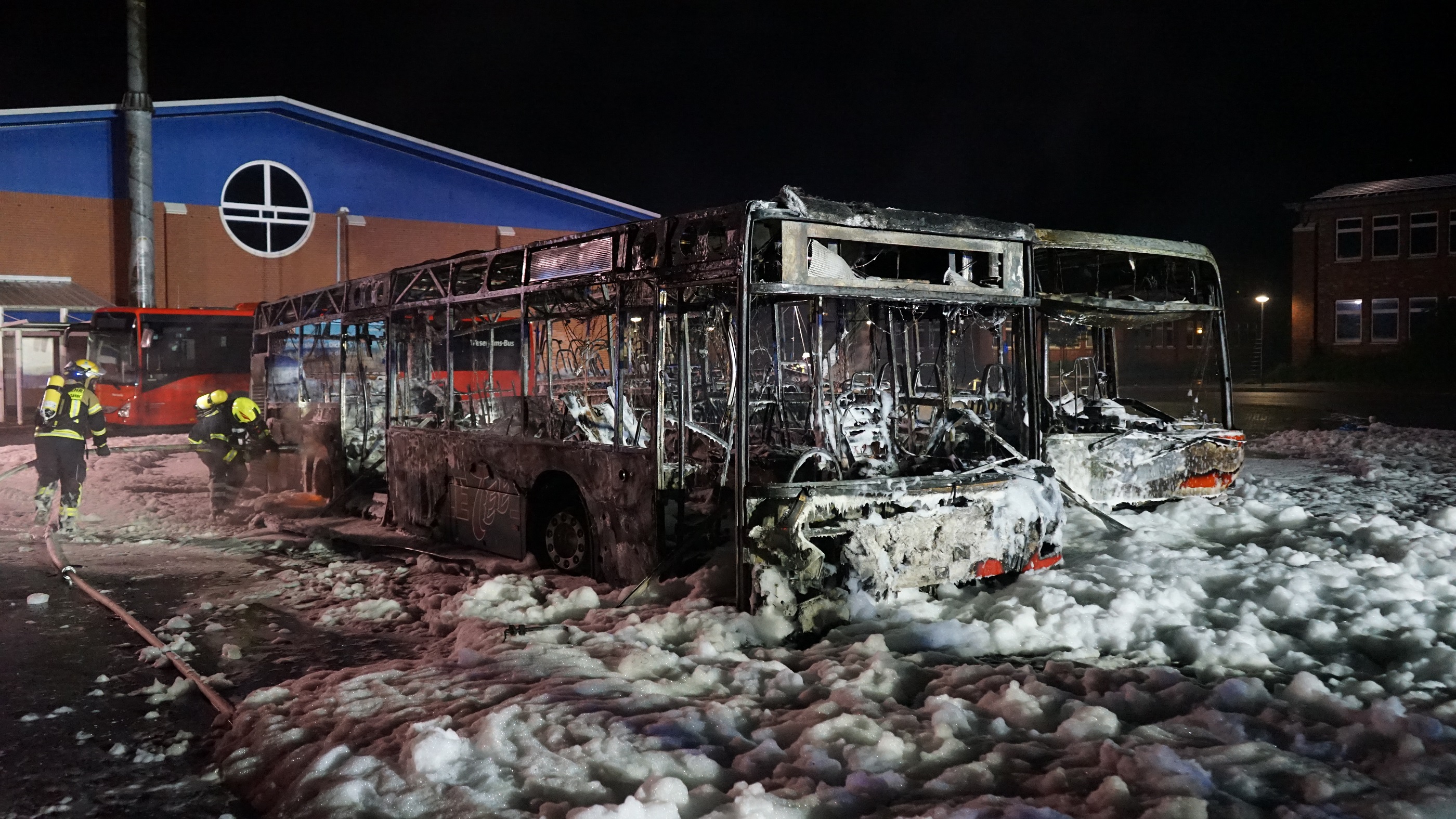 Zwei abgestellte Busse haben in der Nacht zu Mittwoch in Pewsum in Vollbrand gestanden. Personen kamen nicht zu Schaden. Um 01:06 Uhr sind die Feuerwehren Krummhörn-Mitte und Krummhörn-West zu der Einsatzstelle in der Olympiastraße alarmiert worden. Der Feuerschein war bereits aus weiter Entfernung zu sehen. Auch laute Knallgeräusche waren immer wieder zu vernehmen. Als die Feuerwehr vor Ort eintraf, standen beide Busse in Vollbrand. Die Einsatzkräfte begannen vor Ort umgehend mit mehreren Trupps unter Atemschutz die Brandbekämpfung. Aufgrund des schnellen und effektiven Einsatzes der Feuerwehr konnte ein Übergreifen der Flammen auf weitere Busse, die im Nahbereich abgestellt waren, verhindert werden. Im Zuge der Löscharbeiten kam auch Schaummittel zum Einsatz. Nach Abschluss der Löscharbeiten sperrte der Bauhof der Gemeinde Krummhörn den Bereich um die beiden ausgebrannten Fahrzeugwracks mit Bauzäunen ab. Um die Reinigungsarbeiten vor Ort kümmerte sich eine Spezialfirma.