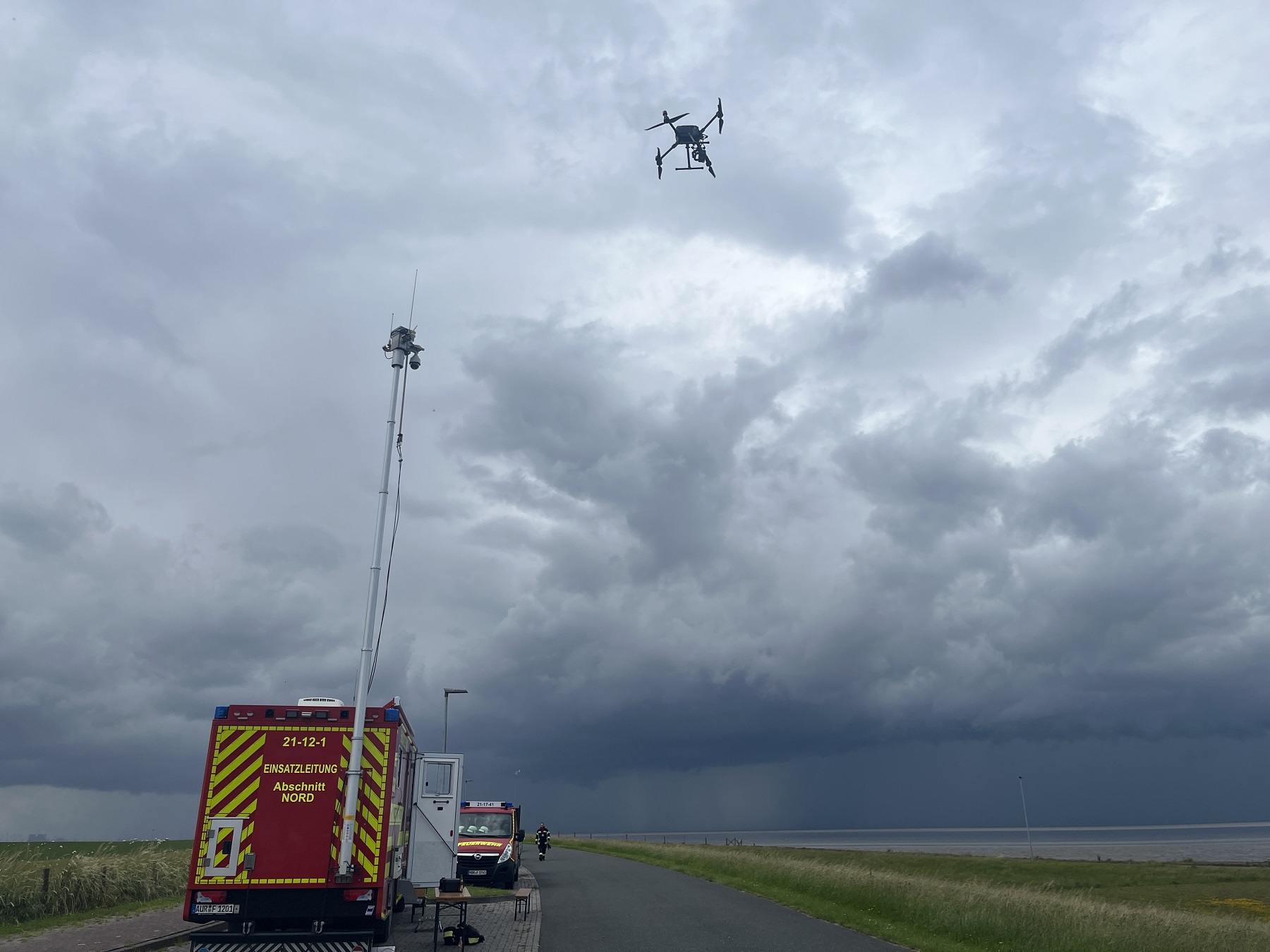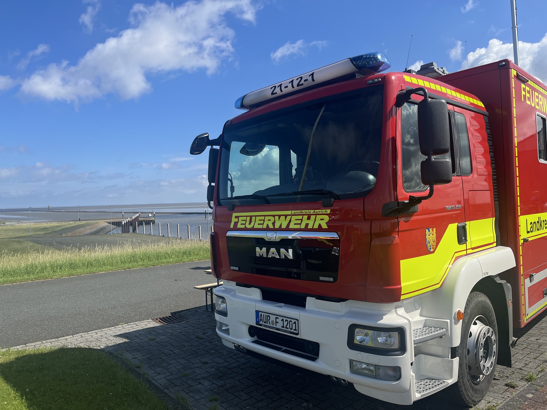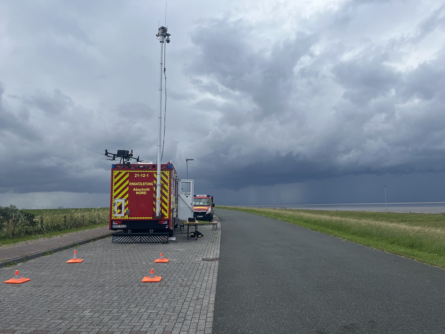 Am Sonntagmorgen ist die Feuerwehr um 09:33 Uhr zur Unterstützung der Seenotretter (DGzRS) an die Schleuse Leysiel alarmiert worden. Ein Fischer stürzte im Wattfahrwasser der Osterems über Bord eines Kutters, sodass eine groß angelegte Suchaktion gestartet wurde. Die Aufgabe der Feuerwehr bestand darin, den Uferbereich von der Schleuse Leysiel bis zum Campener Leuchtturm abzusuchen. Hierzu kamen die beiden Drohnen der Kreisfeuerwehr, stationiert bei den Feuerwehren Norden und Middels sowie die Drohnengruppen der Feuerwehren Osterhusen und Emden zum Einsatz. Außerdem suchten Einsatzkräfte der Feuerwehr Krummhörn-Nord den Uferbereich zu Fuß und mit Fahrzeugen ab. Immer wieder aufziehende Regenschauer erschwerten den Einsatz. Im Verlauf des Einsatzes sind zudem die Feuerwehren der Nordseeinseln Juist und Borkum alarmiert worden, um die Strandbereiche auf den Inseln abzusuchen. Auch die DLRG Norden kam mit einem Sonargerät zum Einsatz. Seitens des MRCC (Maritime Rescue Co-ordination Centre) der Seenotretter sind die Kräfte an Land in den späten Abendstunden aus dem Einsatz entlassen worden. Der vermisste Fischer konnte bislang nicht aufgefunden werden. Die Feuerwehr war bis zum Sonnenuntergang insgesamt 12 Stunden lang an der Suchaktion beteiligt.
