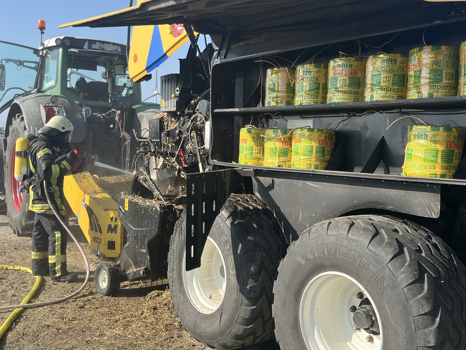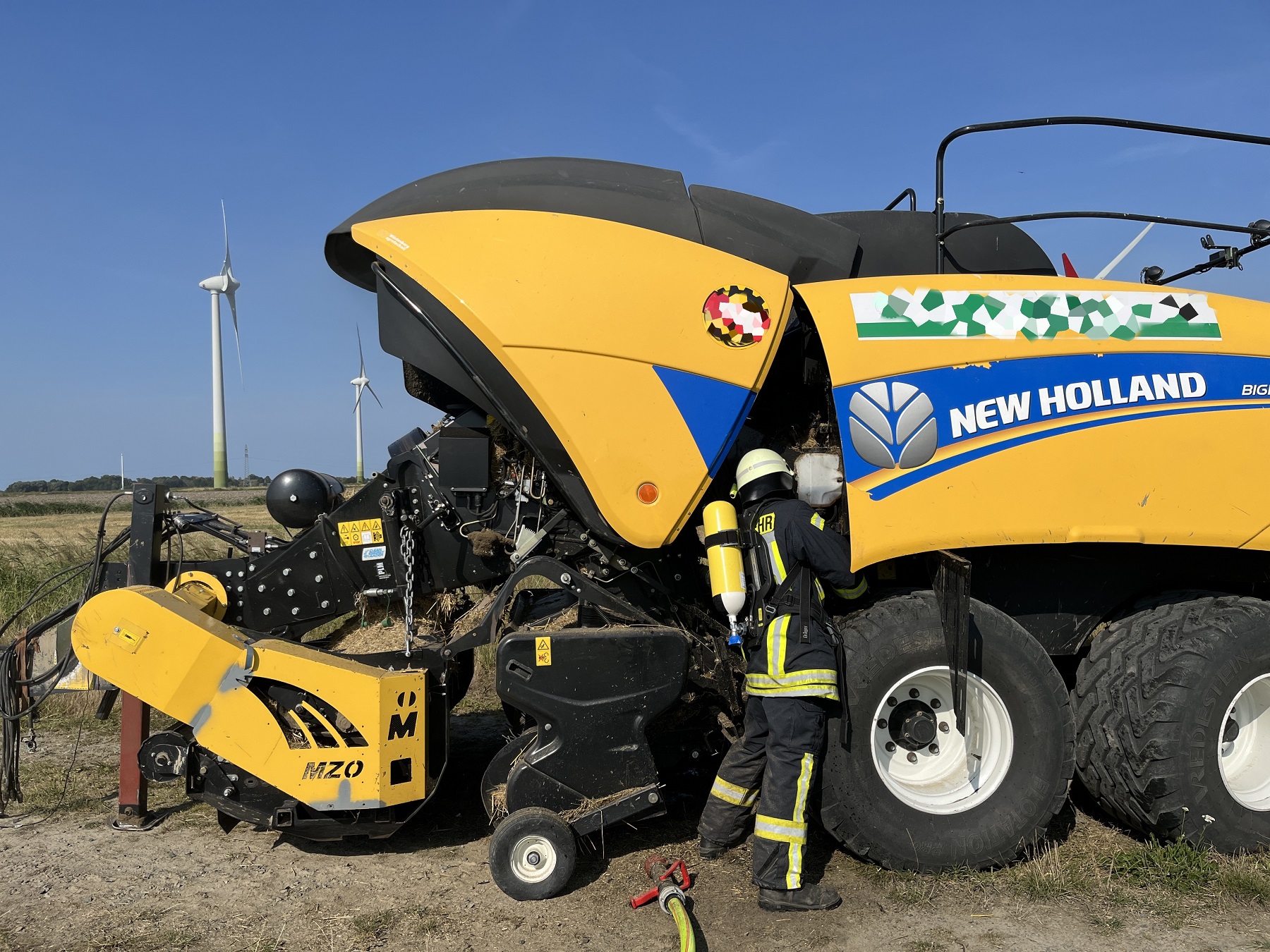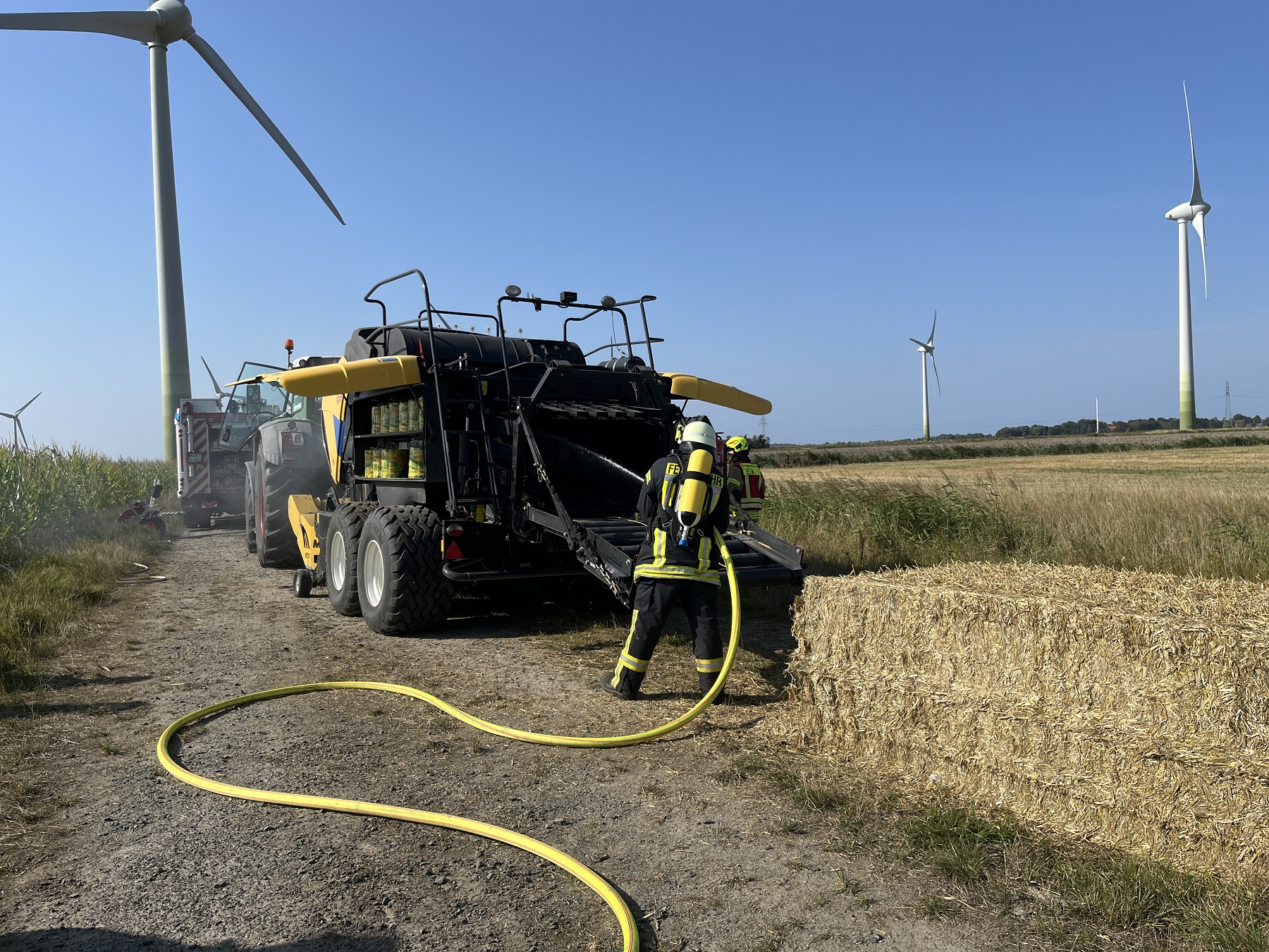 Bei Feldarbeiten an der Ubbo-Emmius-Straße zwischen Visquard und Pewsum ist es am Sonntagnachmittag zu einem Entstehungsbrand in einer Ballenpresse gekommen. Der Fahrer des landwirtschaftlichen Gespanns bemerkte den entstehenden Brand im Inneren der Ballenpresse und reagierte genau richtig. Er bekämpfte erste entstandene Flammen erfolgreich mit Wasser und rief die Feuerwehr. Womöglich konnte dadurch ein Vollbrand der Maschine verhindert werden. Einsatzkräfte der Feuerwehr spürten Glutnester mit der Wärmebildkamera auf und löschten diese ab. Im Rahmen der Löscharbeiten ist das gesamte Stroh aus der Ballenpresse entfernt worden.