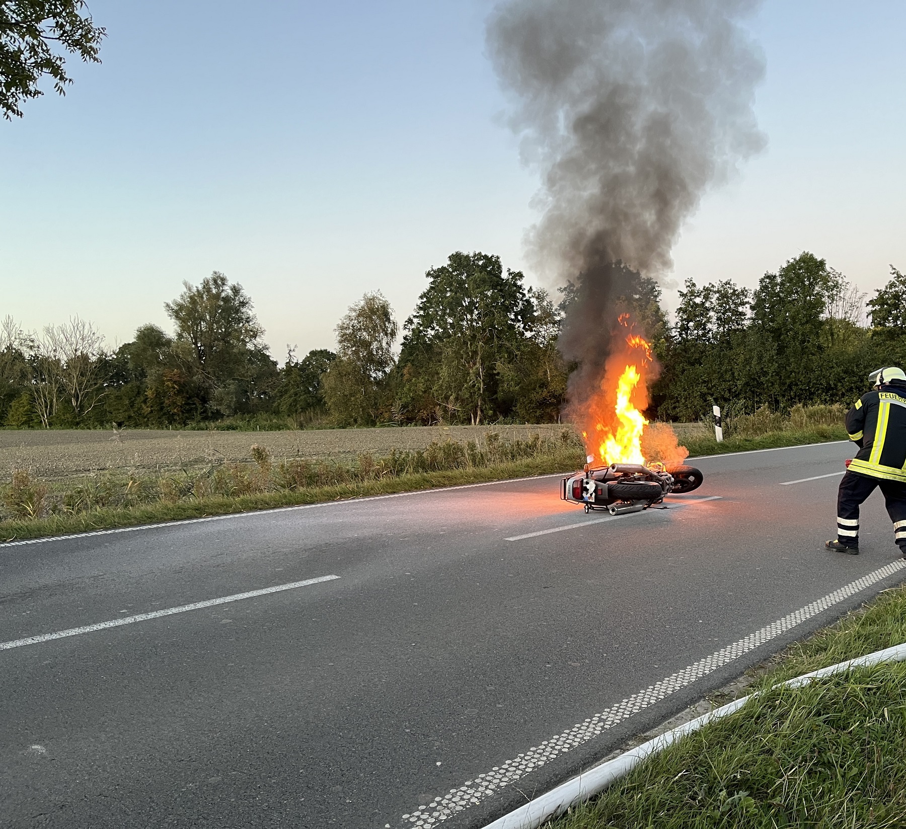 Am Freitagabend hat sich auf der Van-Wingene-Straße zwischen Groothusen und Hamswehrum ein Motorradunfall ereignet. Das Motorrad geriet infolge des Unfalls auf der Straße in Brand. Einsatzkräfte der Feuerwehr konnten die Flammen zügig löschen. Der Rettungsdienst transportierte den verunfallten Motorradfahrer in ein Krankenhaus. Aufgrund der Kollision mit einem Wildtier suchten Einsatzkräfte der Feuerwehr die Umgebung mit Hilfe einer Wärmebildkamera nach dem Tier ab. Sie fanden das verendete Rehwild unweit der Unfallstelle auf. Während des Einsatzes musste die Van-Wingene-Straße voll gesperrt werden. Im Einsatz waren die Feuerwehren Krummhörn-West, Krummhörn-Mitte sowie Rettungsdienst und Polizei.