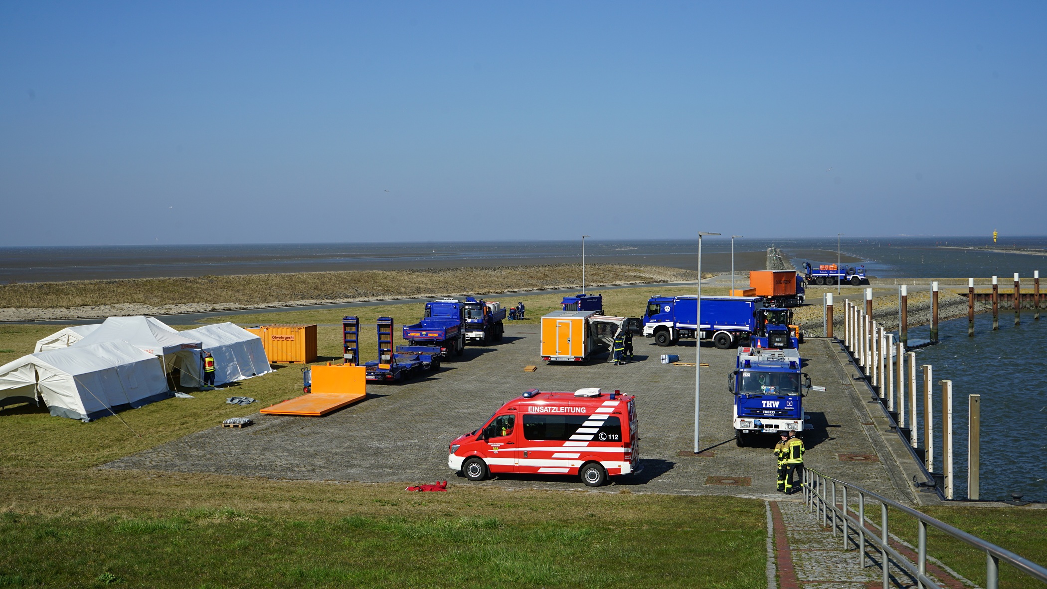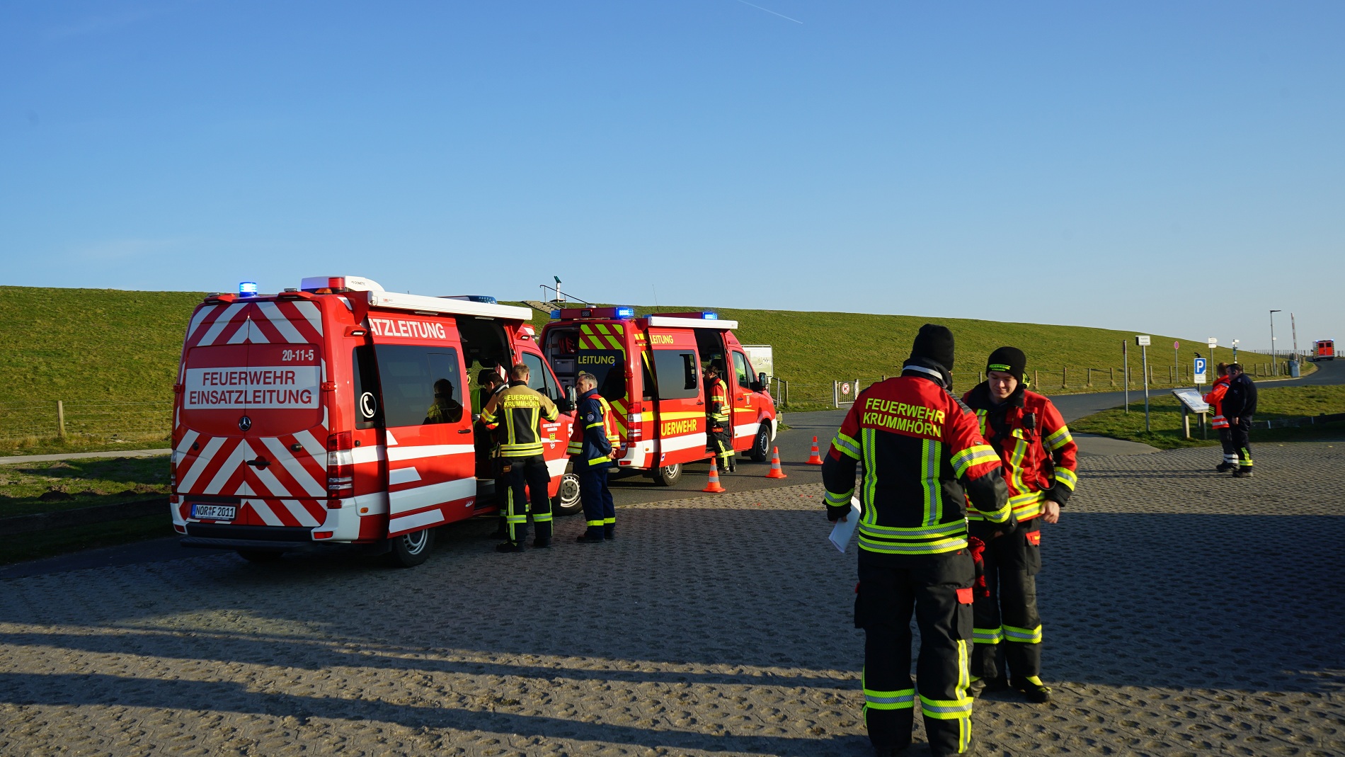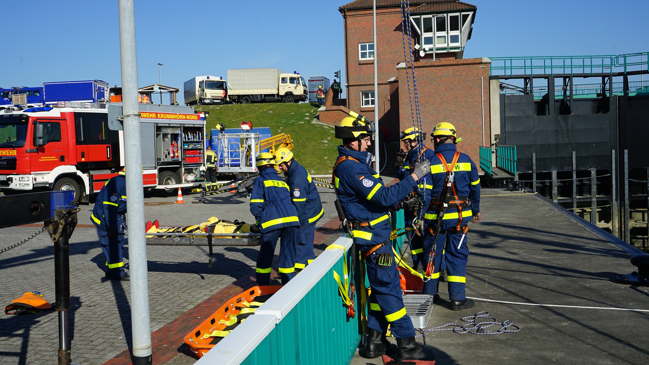 Am Samstagvormittag führten diverse Einsatzkräfte des Technischen Hilfswerks, der Feuerwehr und des Deutschen Roten Kreuzes eine groß angelegte Übung an der Schleuse Leysiel durch. Organisiert wurde die Übung vom Technischen Hilfswerk Norden. Die Feuerwehren Krummhörn-Nord, Krummhörn-Ost und Visquard sowie der Einsatzleitwagen der Gemeindefeuerwehr Krummhörn sind um 07:21 Uhr vom THW Norden mit dem Einsatzstichwort "Ölschaden Groß" hinzugezogen worden. Für die Feuerwehr Krummhörn handelte es sich dabei um eine unangekündigte Alarmübung. Neben den Kräften der Krummhörner Feuerwehr nahmen auch die Feuerwehr Hage, die Feuerwehr Ochtersum aus dem Landkreis Wittmund mit ihrer Drohneneinheit, die Ortsfeuerwehr Wirdum aus der Gemeinde Brookmerland sowie der Einsatzleitwagen der Gemeinde Brookmerland teil. Außerdem rückte das Deutsche Rote Kreuz aus dem Kreisverband Norden an. Die Einsatzkräfte von Feuerwehr und DRK sammelten sich zunächst am Parkplatz Pilsumer Leuchtturm, wo sie vom Technischen Hilfswerk aus Norden in das Übungsszenario eingewiesen wurden. Angenommen wurde eine Havarie eines Tankschiffs im Bereich der Schleuse Leysiel. Dabei sollte eine große Menge Schweröl sowie unbekannte Chemikalien auslaufen, wobei auch die Schleusenanlage erheblich beschädigt wurde. Während sich das THW dem Ölwehrgerät widmete, mussten die weiteren Kräfte mehrere Szenarien abarbeiten. So wurde unter anderem die Rettung von mehreren Personen von einem in Brand geratenen Kutter simuliert, der sich in der Schleuse befand. Die Rettung erfolgte unter Atemschutz, wobei die Übungspuppen aufgrund des Höhenunterschieds in einer Schleifkorbtrage mit einem Kran eines Spezialfahrzeugs gerettet wurden. Weiterhin ist ein Brand in der Schleuse Leysiel mit vermissten Personen angenommen worden. Ein Atemschutztrupp führte sowohl die Menschenrettung als auch die Brandbekämpfung durch. Die Wasserversorgung für die Brandbekämpfung wurde mit Tragkraftspritzen aus dem Speicherbecken Leyhörn sichergestellt. Zudem musste eine verunglückte Person aus einem tiefen Schacht mit einem Rollgliss-System gerettet werden. Das Deutsche Rote Kreuz übernahm die medizinische Versorgung der Verletzten. Für die Verpflegung der Einsatzkräfte sorgte ebenfalls das Deutsche Rote Kreuz. Die Übung endete gegen Mittag mit einem gemeinsamen Mittagessen.