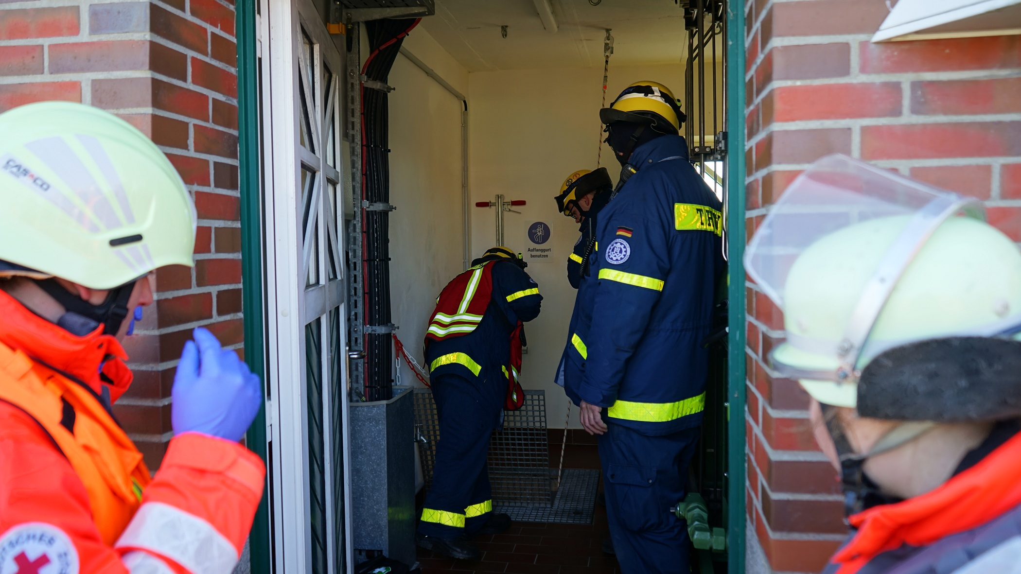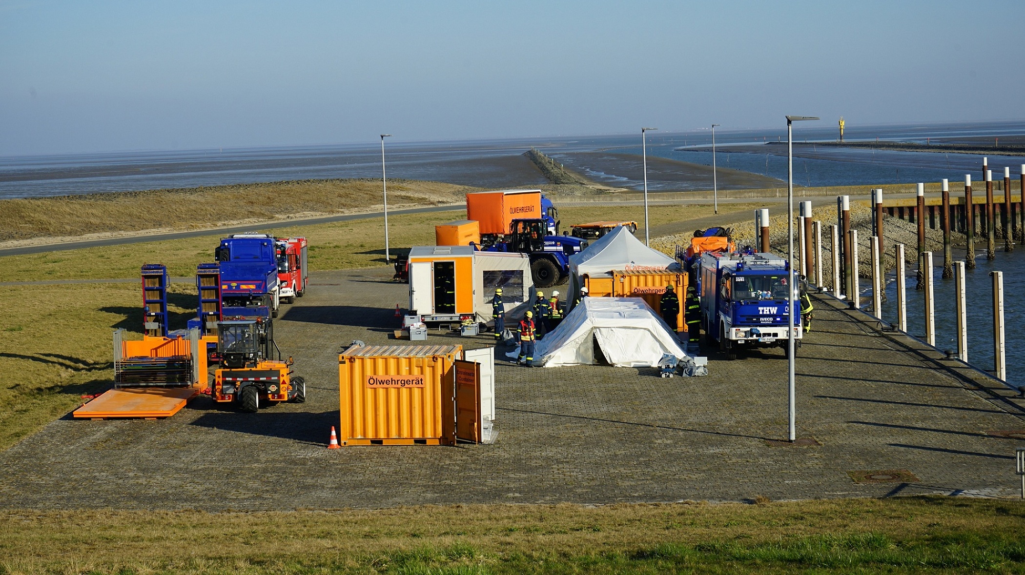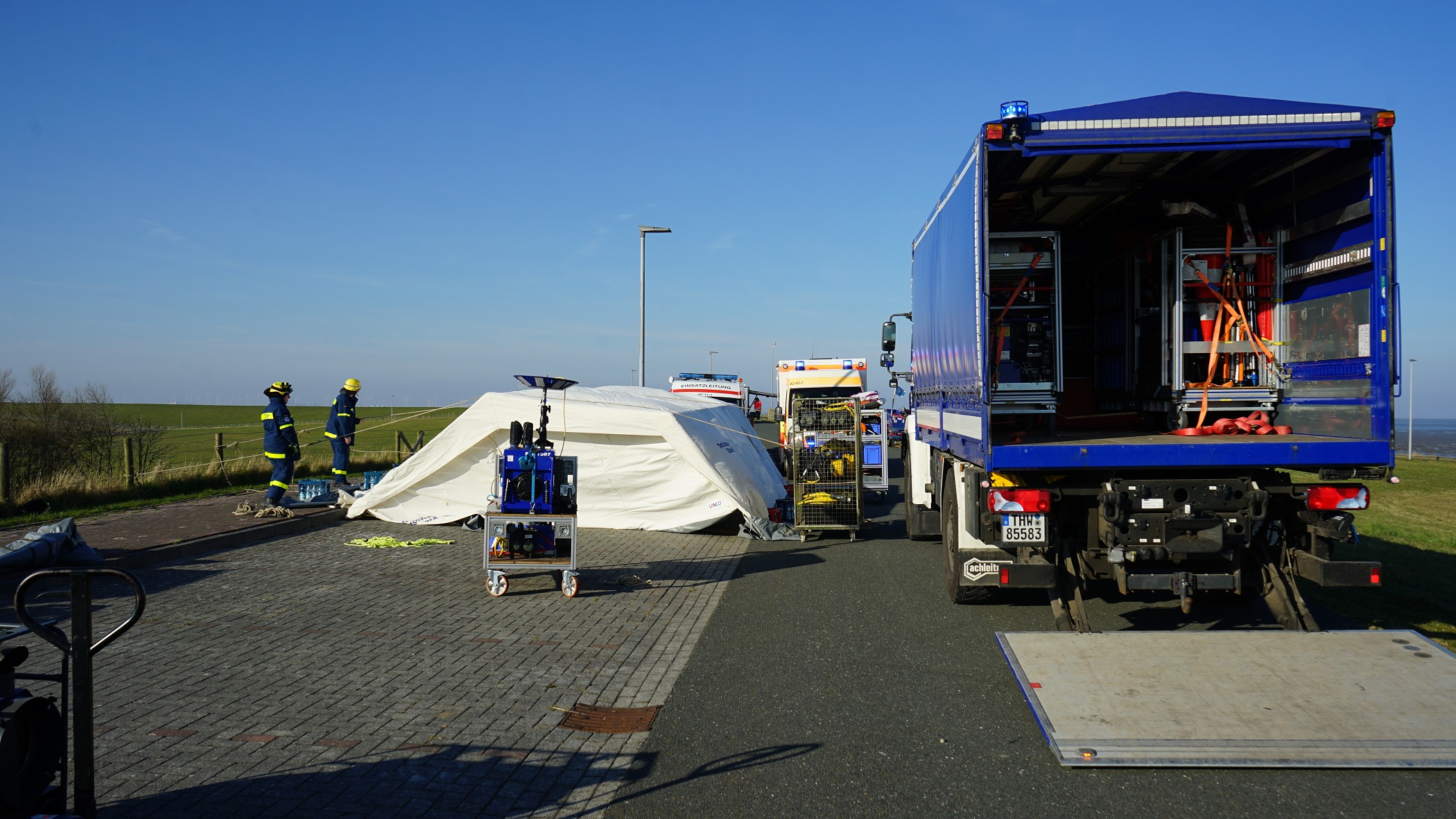 Am Samstagvormittag führten diverse Einsatzkräfte des Technischen Hilfswerks, der Feuerwehr und des Deutschen Roten Kreuzes eine groß angelegte Übung an der Schleuse Leysiel durch. Organisiert wurde die Übung vom Technischen Hilfswerk Norden. Die Feuerwehren Krummhörn-Nord, Krummhörn-Ost und Visquard sowie der Einsatzleitwagen der Gemeindefeuerwehr Krummhörn sind um 07:21 Uhr vom THW Norden mit dem Einsatzstichwort "Ölschaden Groß" hinzugezogen worden. Für die Feuerwehr Krummhörn handelte es sich dabei um eine unangekündigte Alarmübung. Neben den Kräften der Krummhörner Feuerwehr nahmen auch die Feuerwehr Hage, die Feuerwehr Ochtersum aus dem Landkreis Wittmund mit ihrer Drohneneinheit, die Ortsfeuerwehr Wirdum aus der Gemeinde Brookmerland sowie der Einsatzleitwagen der Gemeinde Brookmerland teil. Außerdem rückte das Deutsche Rote Kreuz aus dem Kreisverband Norden an. Die Einsatzkräfte von Feuerwehr und DRK sammelten sich zunächst am Parkplatz Pilsumer Leuchtturm, wo sie vom Technischen Hilfswerk aus Norden in das Übungsszenario eingewiesen wurden. Angenommen wurde eine Havarie eines Tankschiffs im Bereich der Schleuse Leysiel. Dabei sollte eine große Menge Schweröl sowie unbekannte Chemikalien auslaufen, wobei auch die Schleusenanlage erheblich beschädigt wurde. Während sich das THW dem Ölwehrgerät widmete, mussten die weiteren Kräfte mehrere Szenarien abarbeiten. So wurde unter anderem die Rettung von mehreren Personen von einem in Brand geratenen Kutter simuliert, der sich in der Schleuse befand. Die Rettung erfolgte unter Atemschutz, wobei die Übungspuppen aufgrund des Höhenunterschieds in einer Schleifkorbtrage mit einem Kran eines Spezialfahrzeugs gerettet wurden. Weiterhin ist ein Brand in der Schleuse Leysiel mit vermissten Personen angenommen worden. Ein Atemschutztrupp führte sowohl die Menschenrettung als auch die Brandbekämpfung durch. Die Wasserversorgung für die Brandbekämpfung wurde mit Tragkraftspritzen aus dem Speicherbecken Leyhörn sichergestellt. Zudem musste eine verunglückte Person aus einem tiefen Schacht mit einem Rollgliss-System gerettet werden. Das Deutsche Rote Kreuz übernahm die medizinische Versorgung der Verletzten. Für die Verpflegung der Einsatzkräfte sorgte ebenfalls das Deutsche Rote Kreuz. Die Übung endete gegen Mittag mit einem gemeinsamen Mittagessen.
