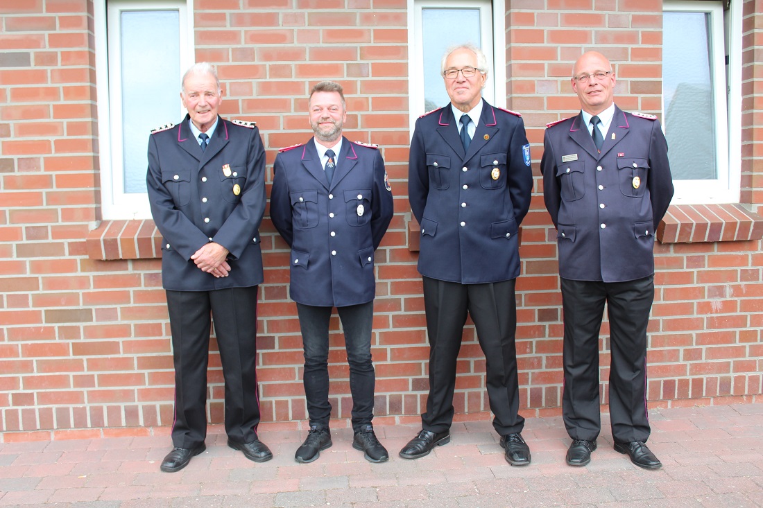 Richard Hieronimus und Klaus Wiggers wurden durch Joachim Harberts, Roelf Odens und Dieter Helmers mit dem niedersächsischen Feuerwehr-Ehrenzeichen für 40 Jahre Dienstzeit geehrt.
