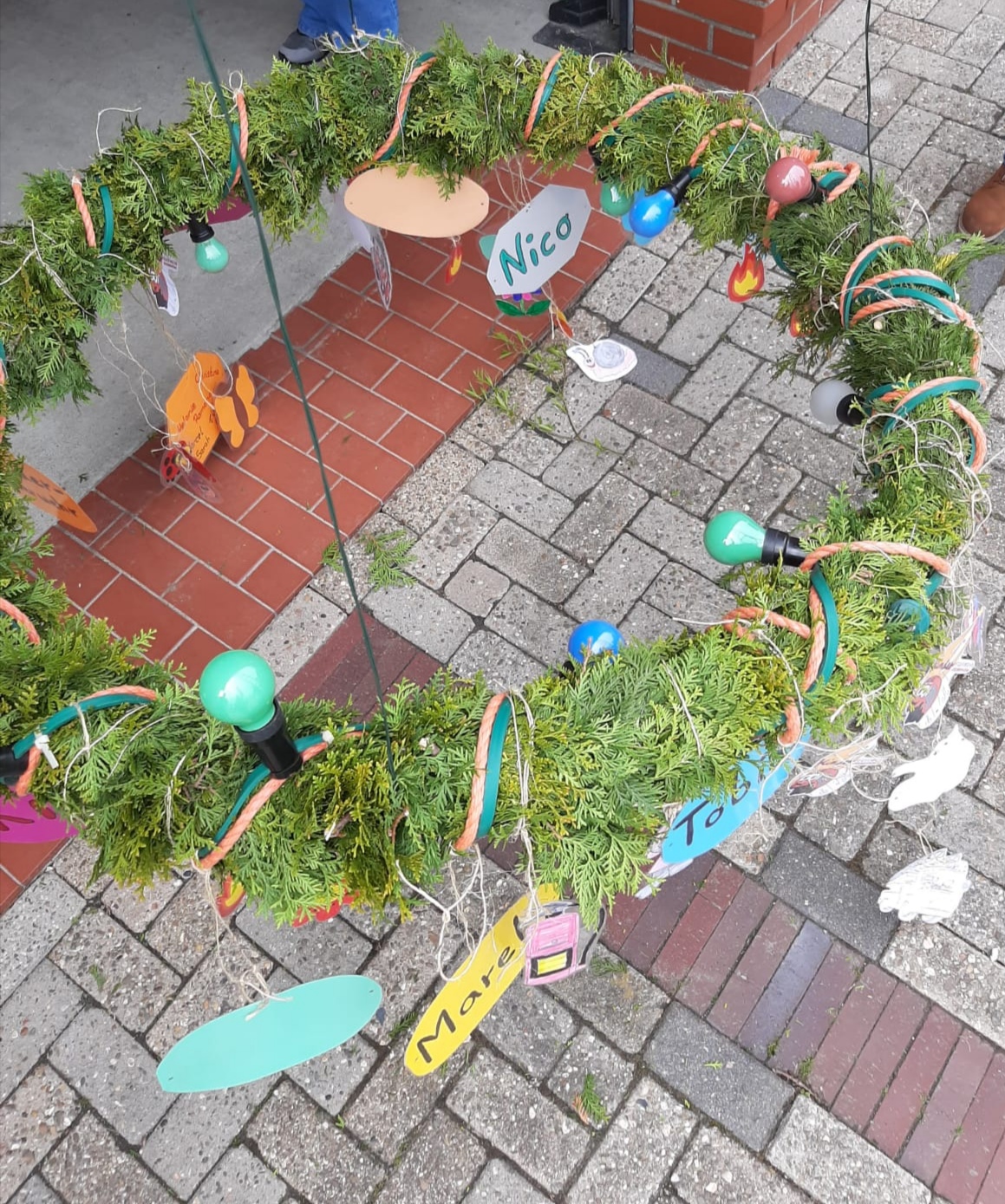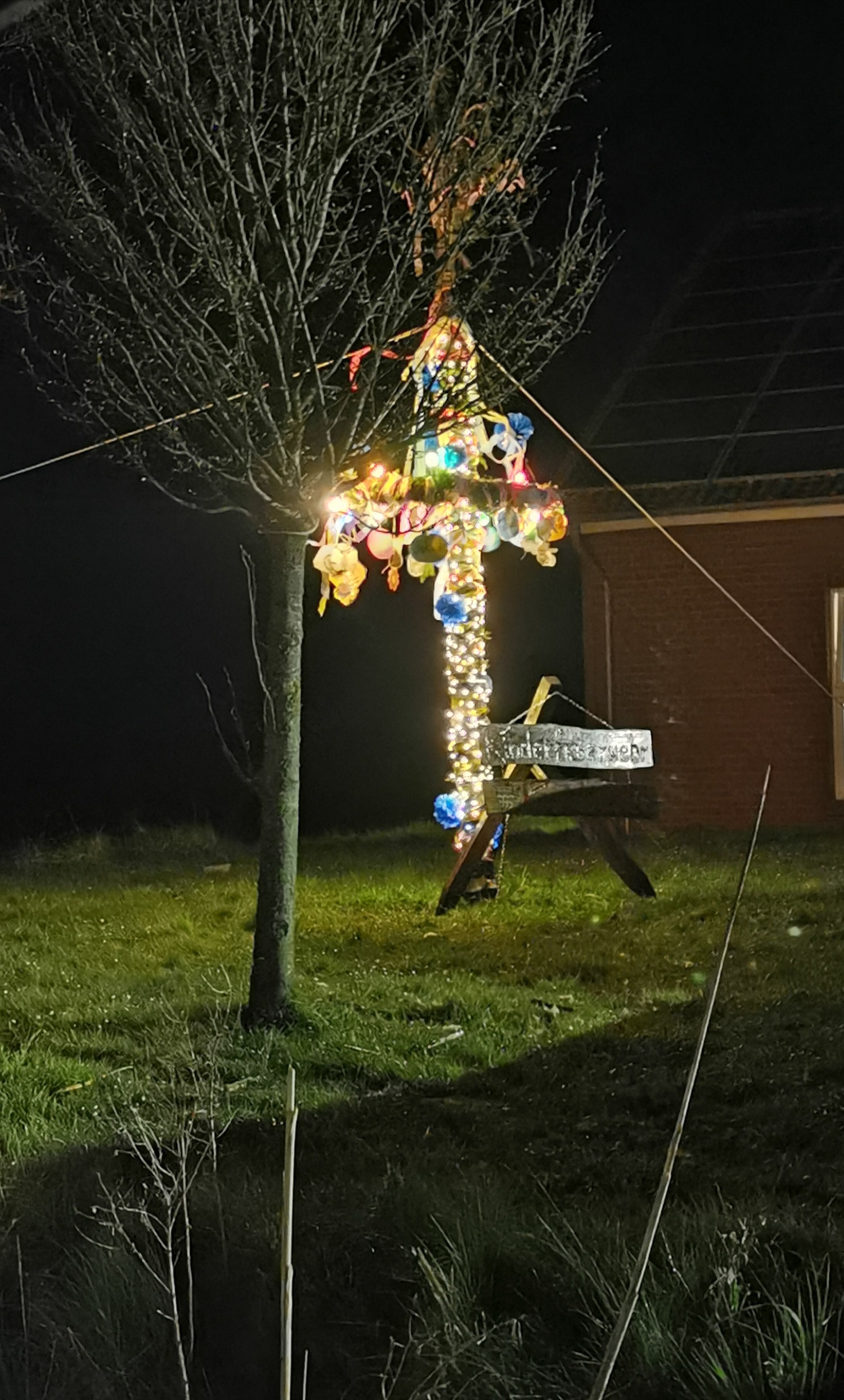 Selbstgemalte Bilder von den Kindern der Kinderfeuerwehr verzieren den Baum, der nun auch im Abendlicht neben dem Feuerwehrhaus in seiner vollen Pracht erstrahlt.
