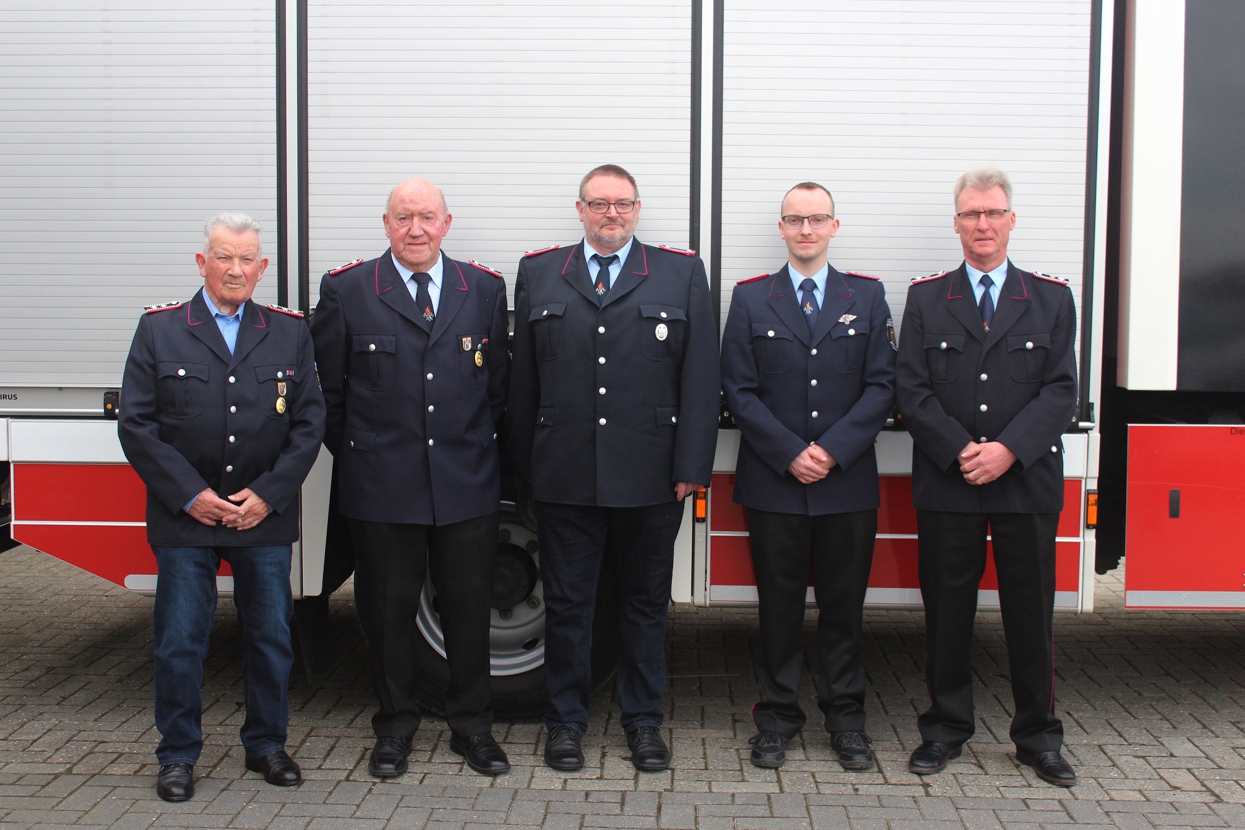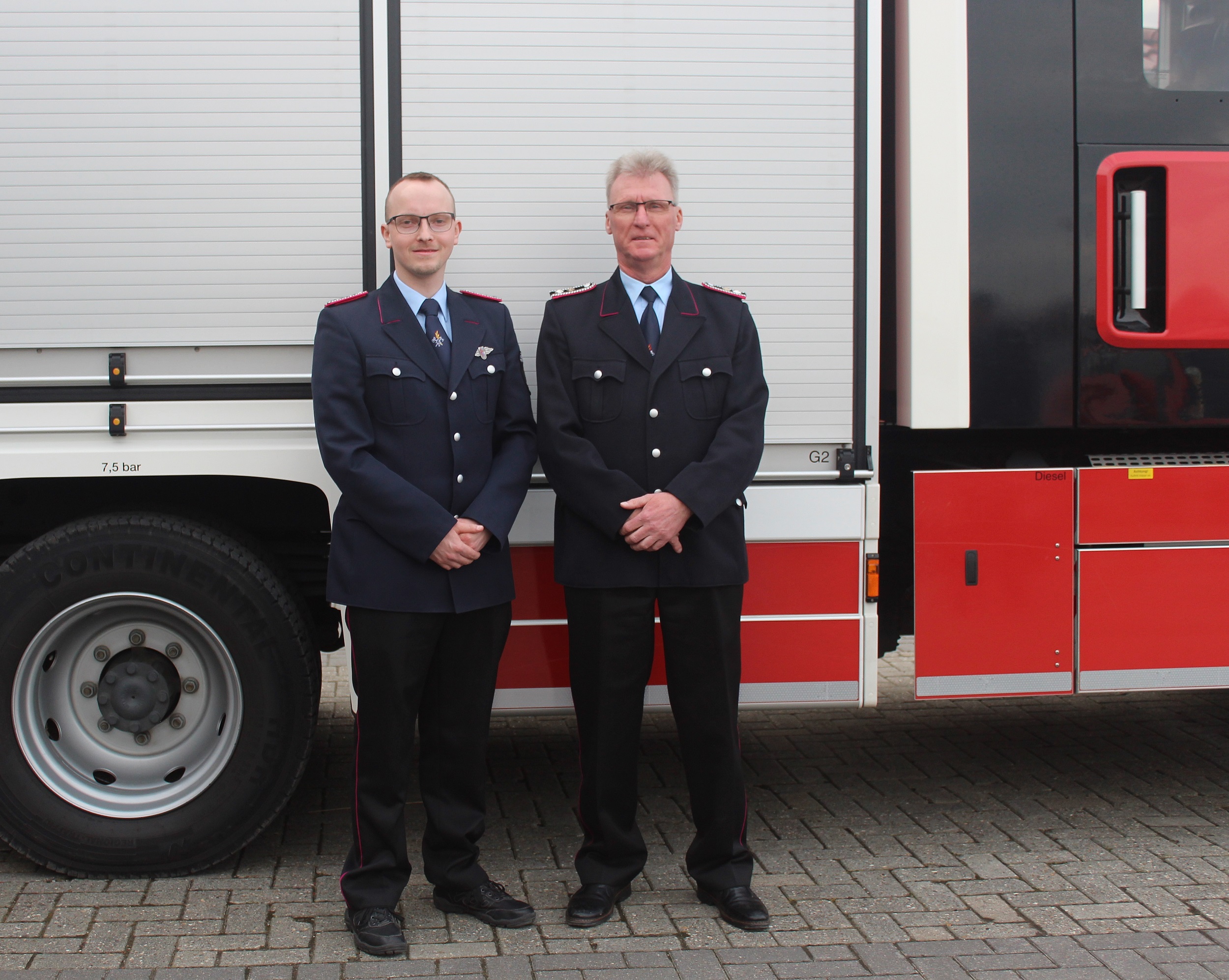 Gemeindebrandmeister Jan-Jürgen Lüpkes beförderte Hermann Beekhuis zum ersten Hauptfeuerwehrmann. Matthias Engelbarts ist zum Oberlöschmeister befördert worden.