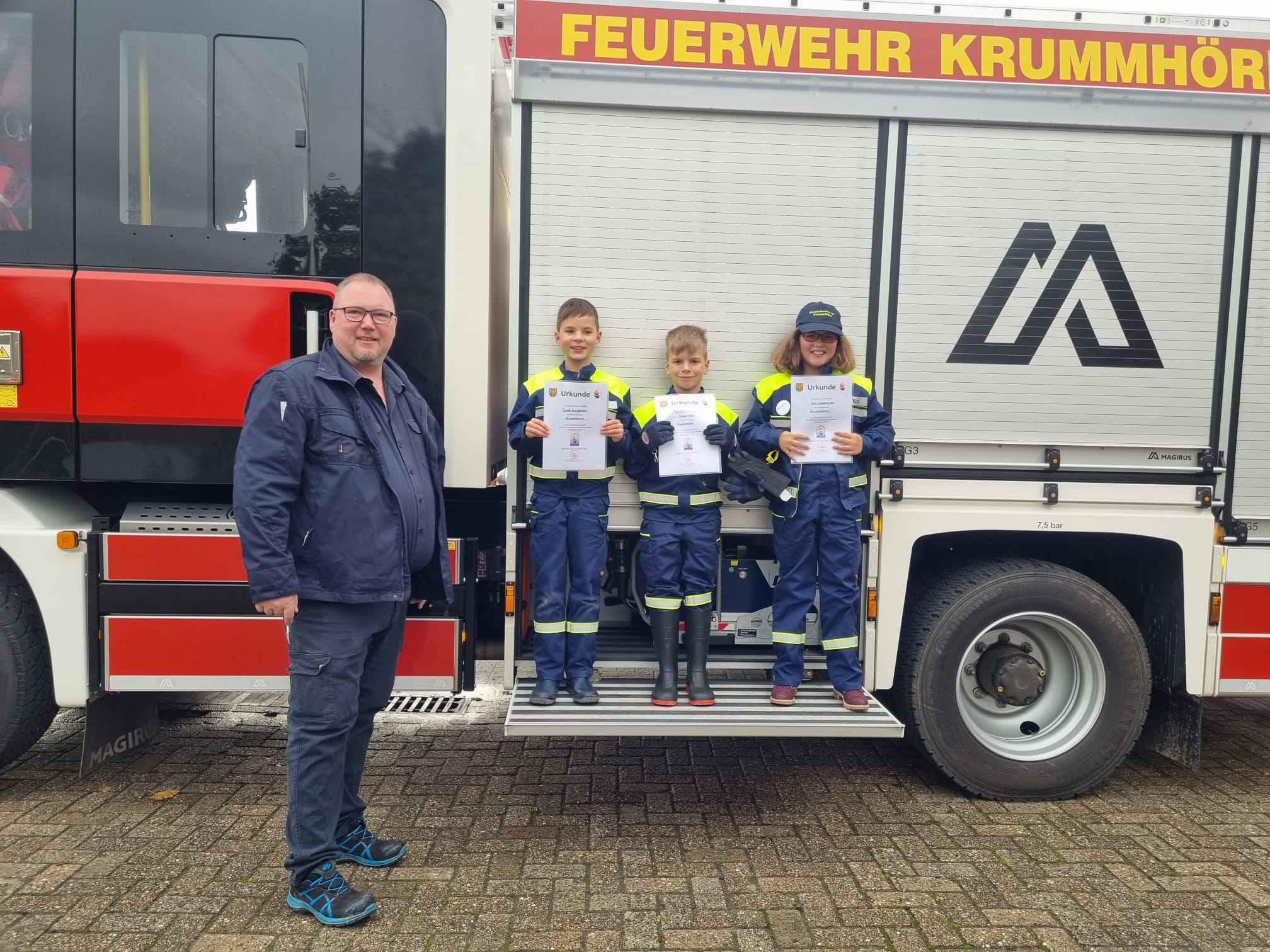 Drei Kinder aus der Krummhörner Kinderfeuerwehr haben am Samstag, den 30.10.2021, erfolgreich an der Brandfloh-Abnahme in Wiesmoor teilgenommen.