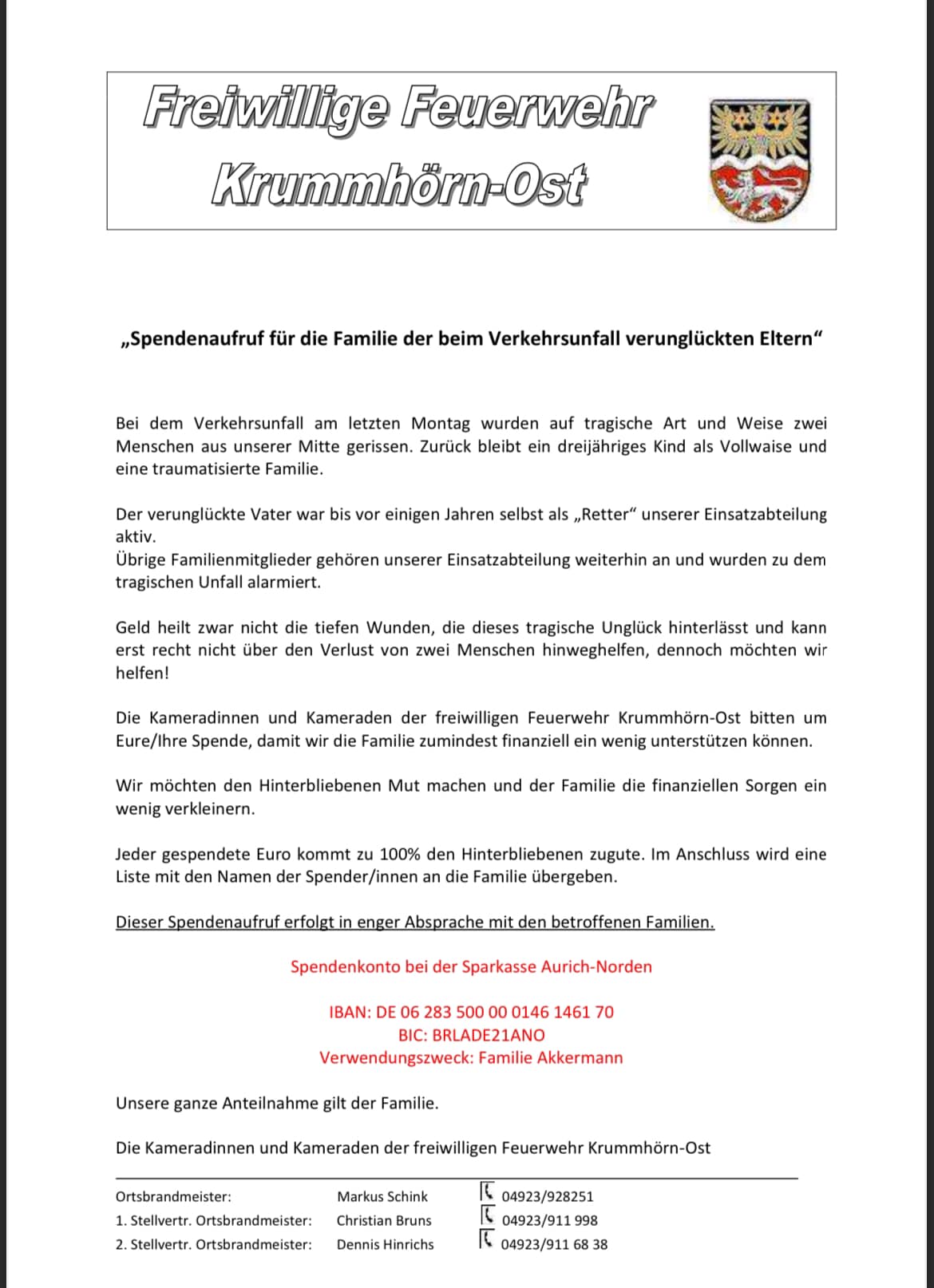 Read more: Grünkohlessen der Alters- und EhrenabteilungDie Feuerwehr Krummhörn-Ost hat nach dem tragischen Verkehrsunfall einen Spendenaufruf gestartet.