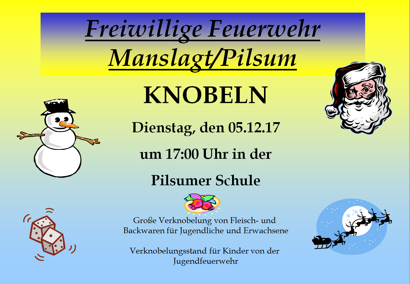 Read more: Weihnachtsfeier der EhrenabteilungAuch in diesem Jahr veranstaltet die Freiwillige Feuerwehr Manslagt/Pilsum das traditionelle Knobeln. Nähere Informationen sind auf dem Flyer zu finden.