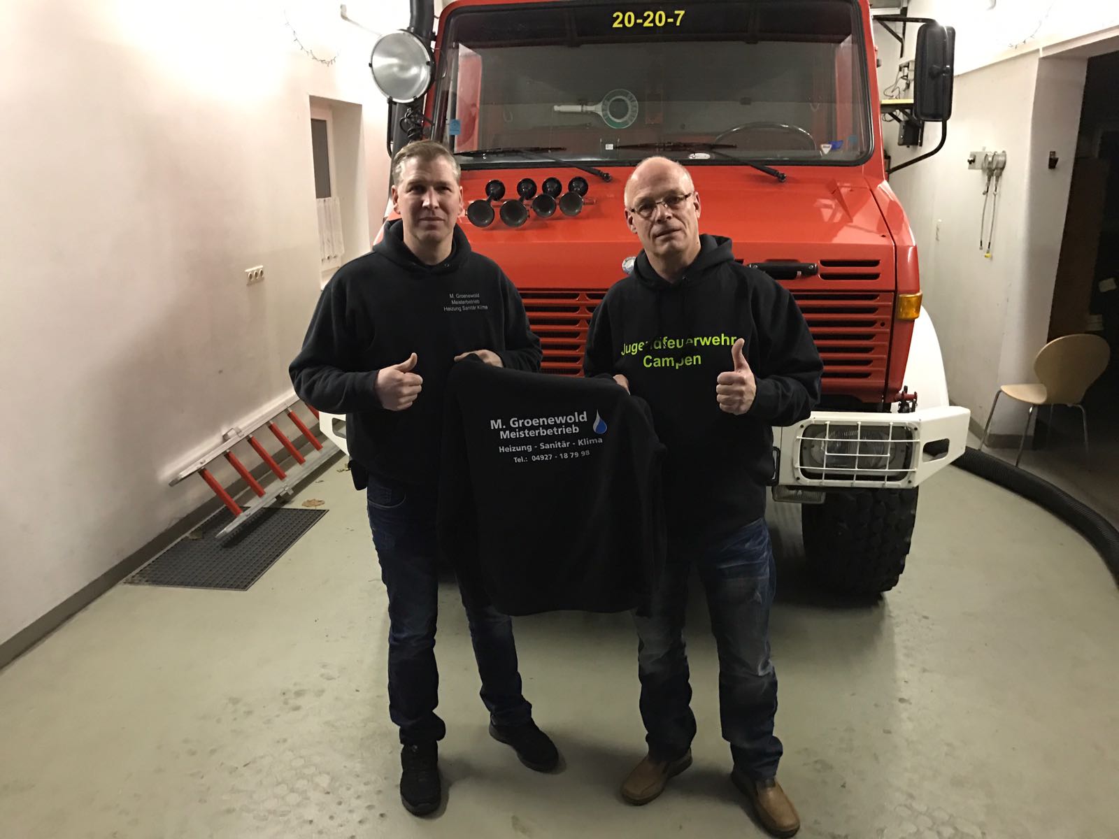 Read more: Kooperationsvertrag zwischen Feuerwehr und IGS Krummhörn unterzeichnetKürzlich wurde die Jugendfeuerwehr Campen von Martin Groenewold, der einen Meisterbetrieb für Heizung-Sanitär-Klima in der Ortschaft Campen führt, mit einem Satz von Kapuzenpullovern überrascht. Der Jugendfeuerwehrwart Richard Hieronimus bedankte sich bei Martin Groenewold für die gesponserten Pullover.