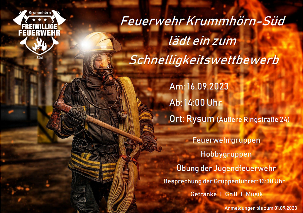 Read more: Wir brauchen DICH und stellen uns am 9. September bei DIR vorDie Ortsfeuerwehr Krummhörn-Süd lädt am 16.09.2023 zum Schnelligkeitswettbewerb ein. Teilnehmen können alle interessierte Gruppen. Anmeldeschluss ist der 01.09.2023