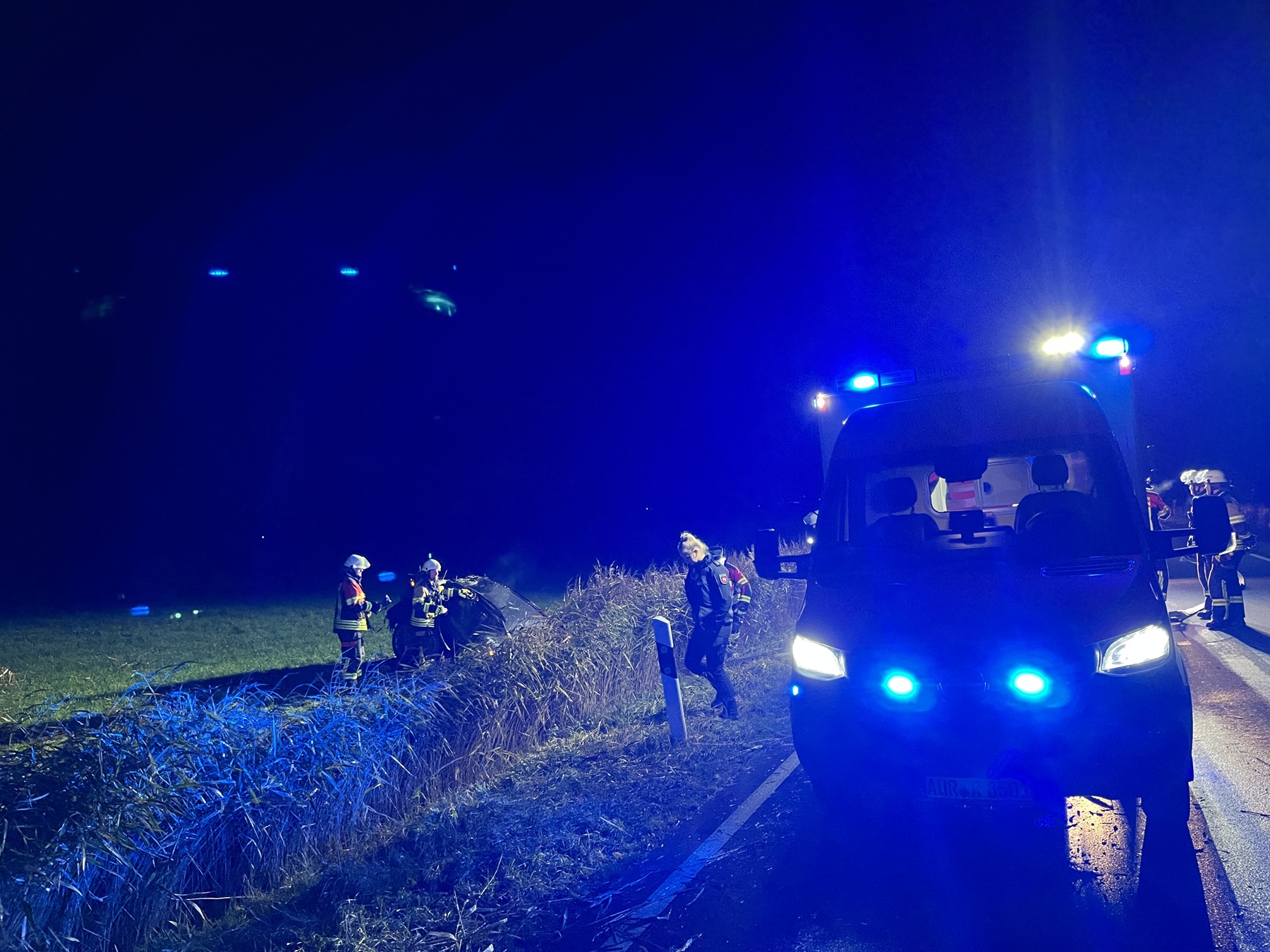 Beim Eintreffen der Feuerwehr hatte der Fahrer das im Graben liegende Fahrzeug bereits eigenständig verlassen. Er wurde anschließend vom Rettungsdienst in ein umliegendes Krankenhaus gebracht. Nach ersten Erkenntnissen sind keine weiteren Personen verletzt worden.