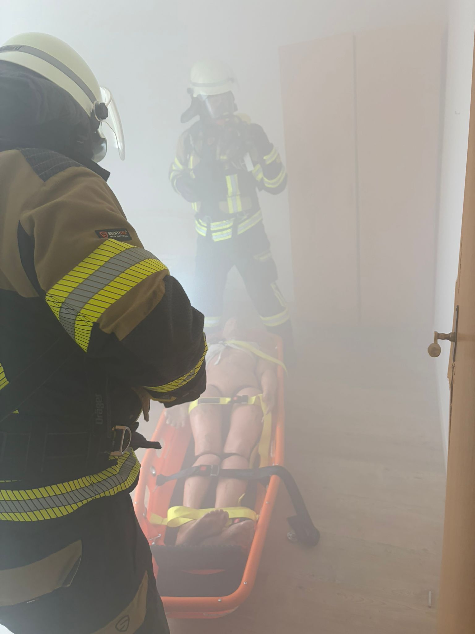 Dem Übungsszenario zufolge befanden sich noch zwei Personen im Gebäude, die unter Atemschutz gerettet werden mussten. Insgesamt drei Trupps durchkämmten das weitläufige und verwinkelte Objekt. Besonders herausfordernd waren die zahlreichen Zimmer bei Nullsicht.