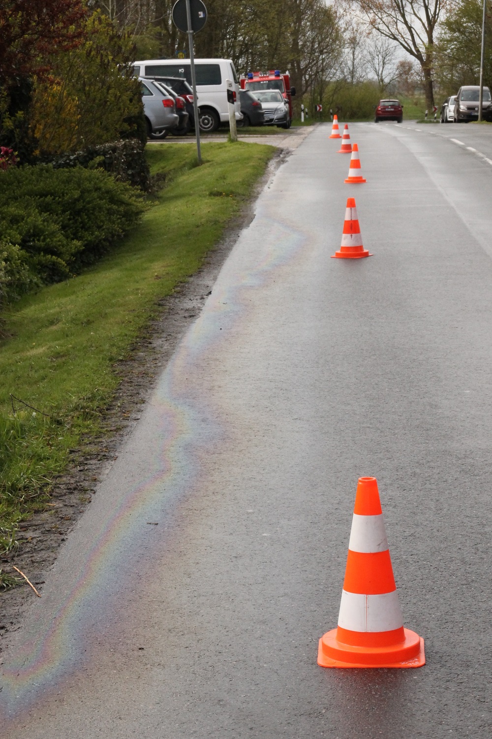 Dort hatte ein bisher nicht ermitteltes Fahrzeug eine Ölspur von ca. 1,5 Km verursacht. Da es sich bei dieser Straße um eine Kreisstraße handelt, musste sich die Feuerwehr um die Verkehrssicherung kümmern.