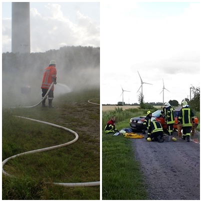 Auf dem Weg zur Einsatzstelle wurde ein Unfall mit einem Radfahrer vorgefunden. Zusammen mit dem Tanklöschfahrzeug und dem Einsatzleitwagen der Feuerwehr Pewsum/Woltzeten wurde der Verletzte versorgt. Der PKW wurde mittels Hebekissen angehoben und unterbaut. Anschließend konnte man den Patienten mittels Schaufeltrage unter dem Fahrzeug befreien und auf eine Trage lagern.