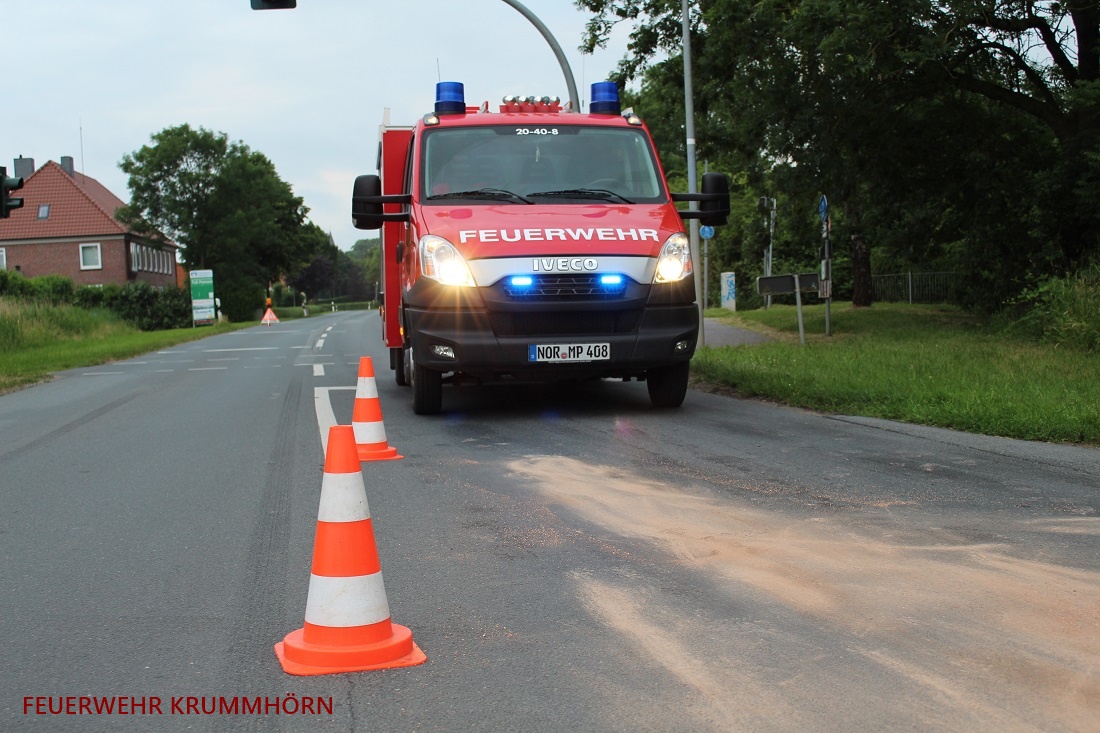 Die Einsatzstelle zog sich über ca. 600 Meter. In Absprache mit der Polizei, dem Bauhof der Krummhörn und der UWB wurde die Firma Duismann beauftragt, die Gefahrenstoffe aufzunehmen.
