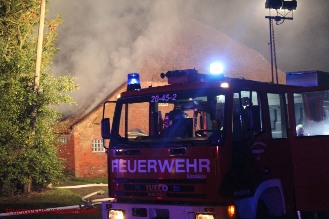 Rund 100 Einsatzkräfte der Feuerwehren Krummhörn-Nord, Krummhörn-Ost, Visquard, Pewsum-Woltzeten, der Versorgungsgruppe der Feuerwehr Krummhörn-West sowie der Einsatzleitwagen der Gemeinde Krummhörn waren von Dienstagnacht bis Dienstmittag bei einem Scheunenbrand in Manslagt im Einsatz.