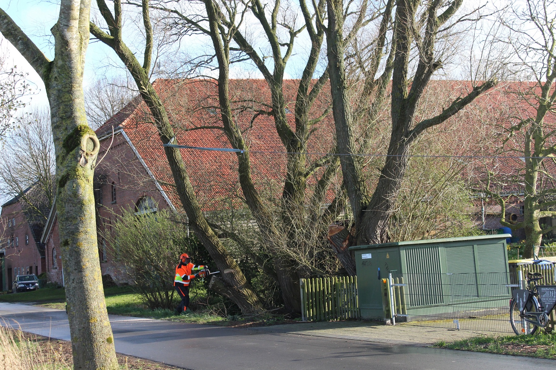Der Teil des Baumes ist im weiteren Einsatzverlauf von einer speziell ausgebildeten Einsatzkraft mit einer Motorkettensäge kontrolliert gefällt worden. Hierbei kam auch das Hilfeleistungslöschgruppenfahrzeug zum Einsatz.