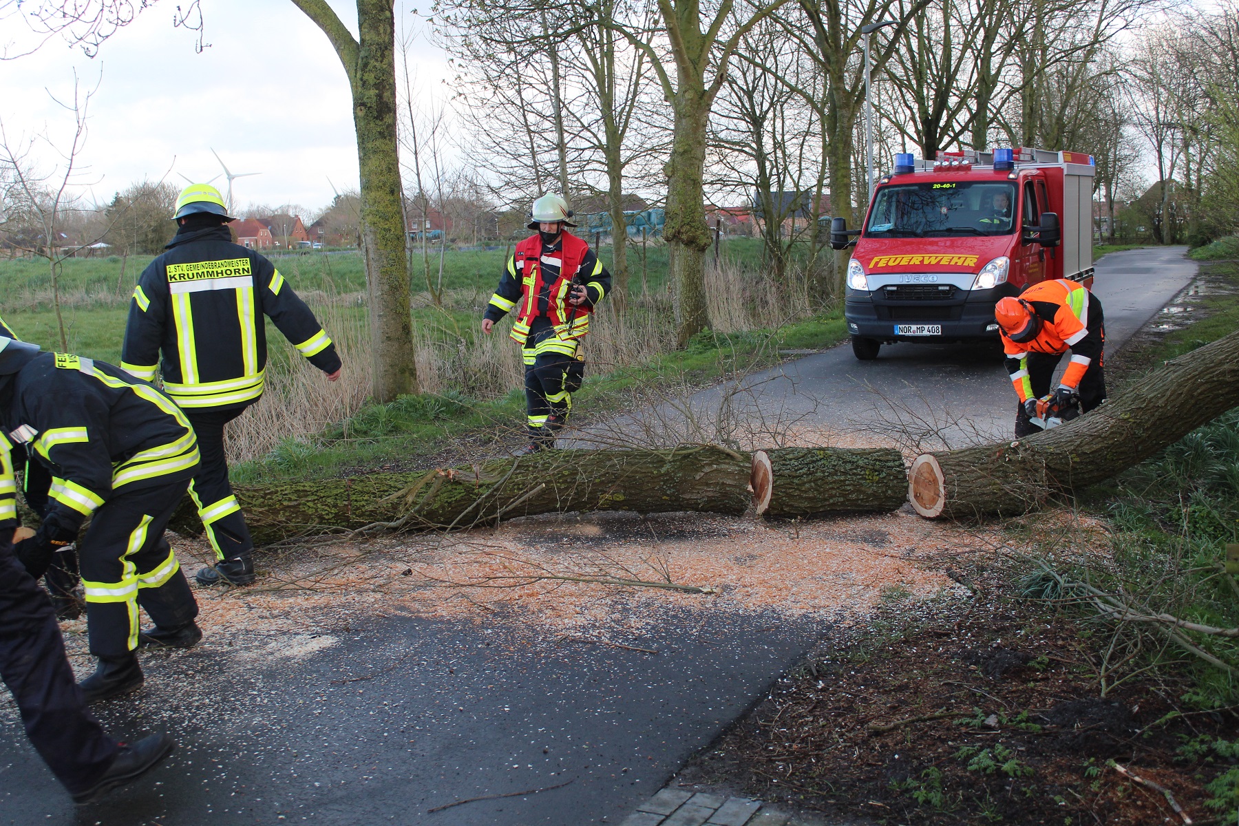 Am Donnerstagnachmittag ist die Ortsfeuerwehr Krummhörn-Nord um 17:22 Uhr in den Manslagter Ring in Manslagt alarmiert worden. Dort drohte ein Teil eines mehrstämmigen Baumes auf die Straße zu kippen.